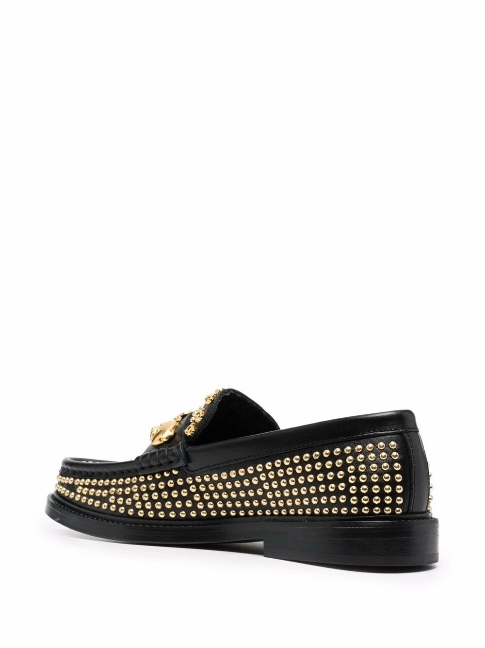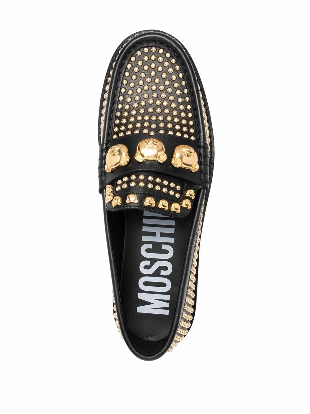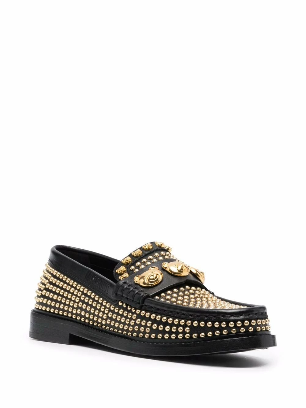 In typical eccentric style, the all-over stud detail of these leather loafers demonstrate Moschino’s maximalist approach to design. The brand’s signature Teddy emblem is presented in three gold-tone studs across the penny slot, for added boldness.
