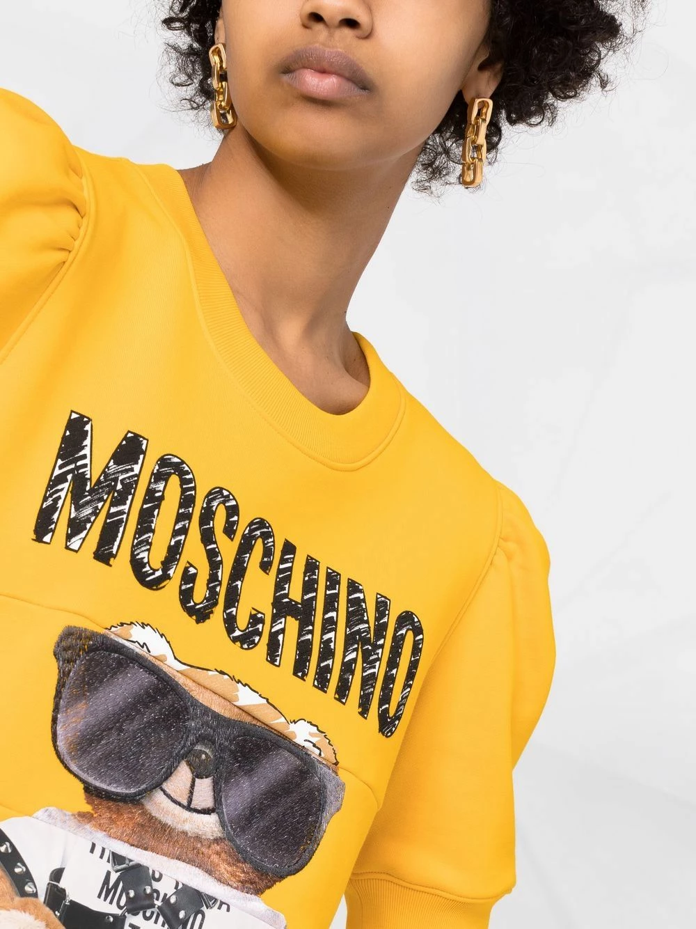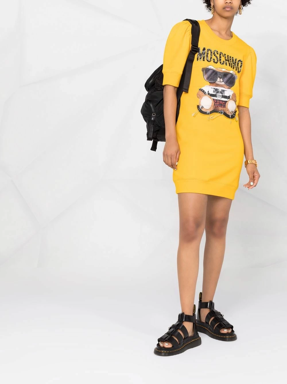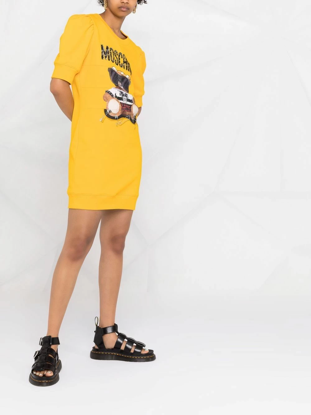 Donโt take life too seriously. Whenever you need a mood boost, this yellow-tone Moschino dress and its playful Teddy Bear motif will give you an instant uplift. Looking good, feeling good.