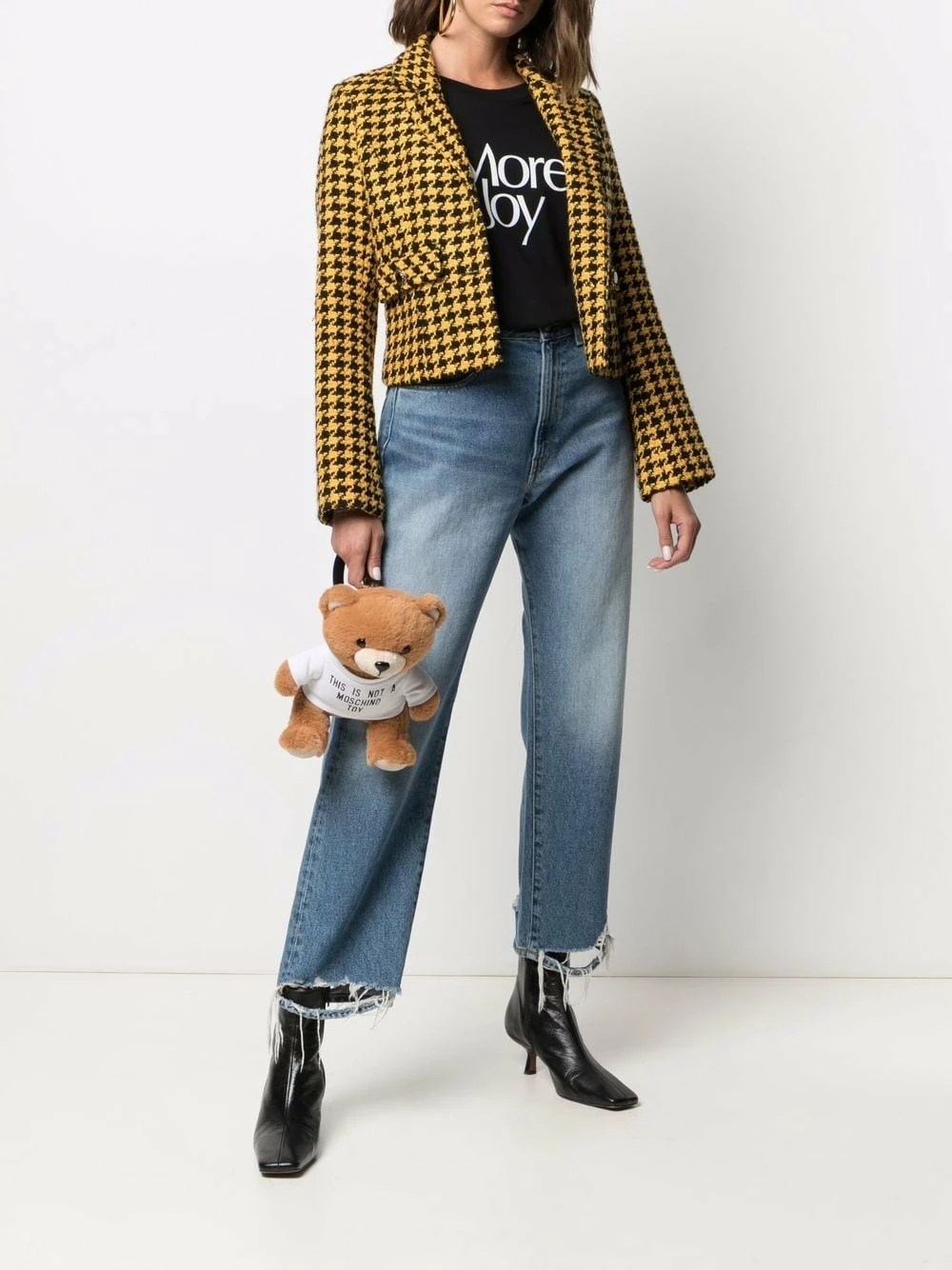 Moschino’s tote pays homage to the brand’s Toy Teddy motif. Embodying the brand’s playful sensibility, the soft toy takes centre stage.