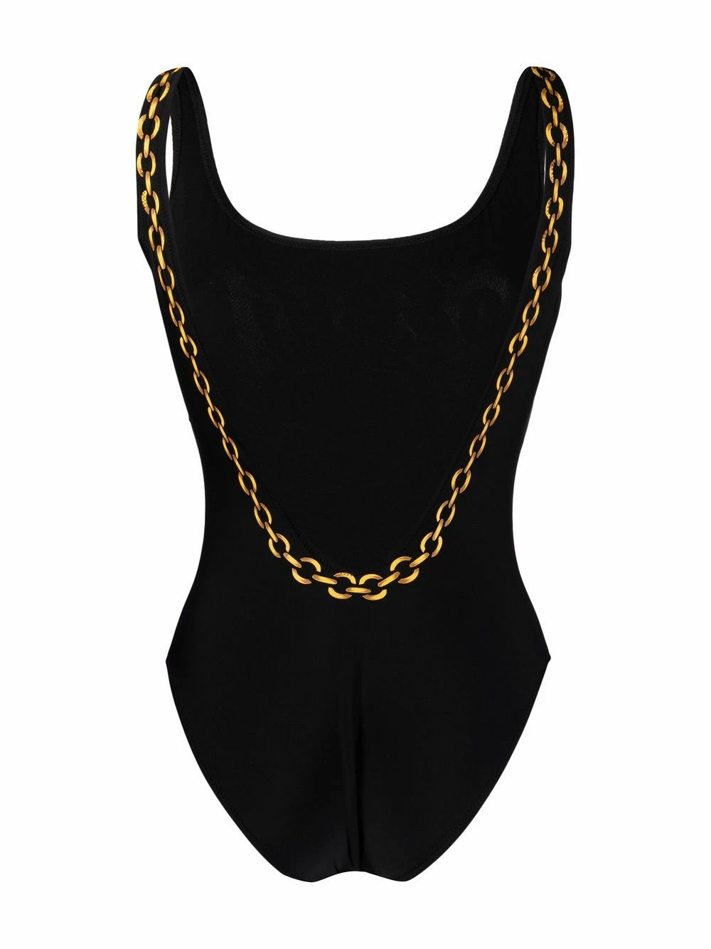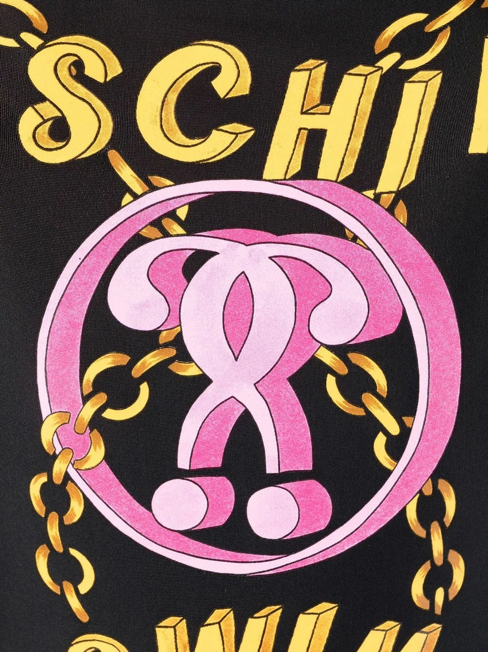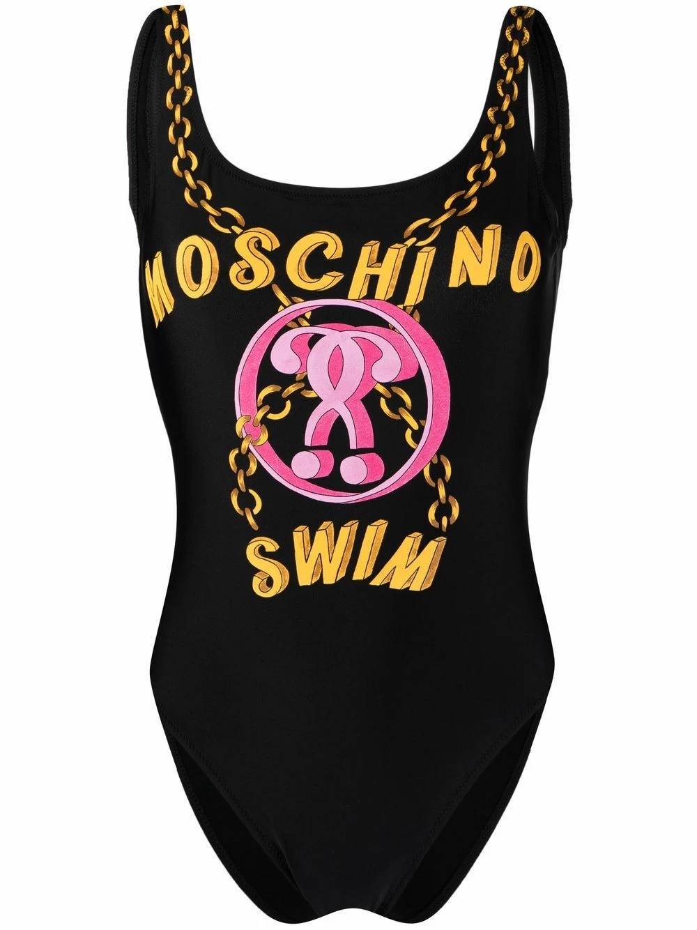 Looks like Jeremy Scott is not only a fashion designer but also a film director. Moschinoโs AW21 collection is an ode to old Hollywood glamour – as seen on this Double Question Mark logo swimsuit – featuring gold-tone chain accents, elegant black tones and a pink logo print.ย