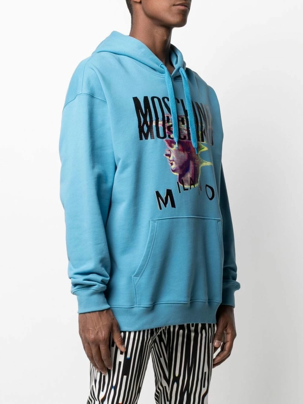 Update your leisurewear game. Moschino’s azure blue cotton hoodie is detailed with a graphic bust print and bold logo lettering. Stand out for all the right reasons.