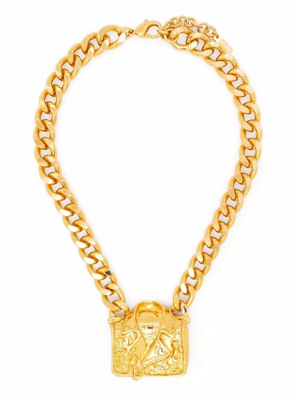 For Moschino’s AW21 jewellery edit, the label’s clothing and accessory hero pieces are re-imagined in metal. This necklace showcases a jacket pendant, an icon of the brand, gilded in a gold-tone hue.