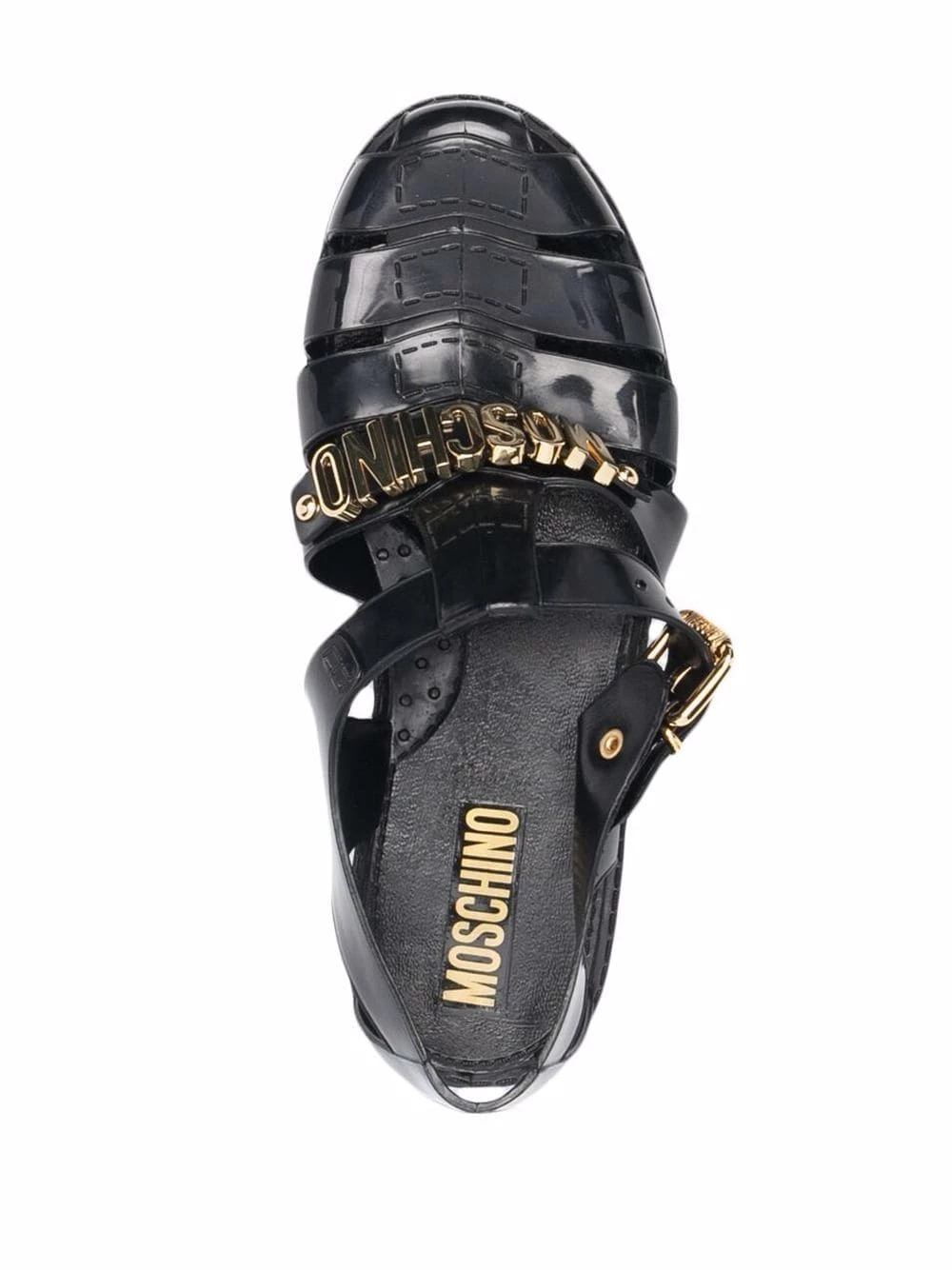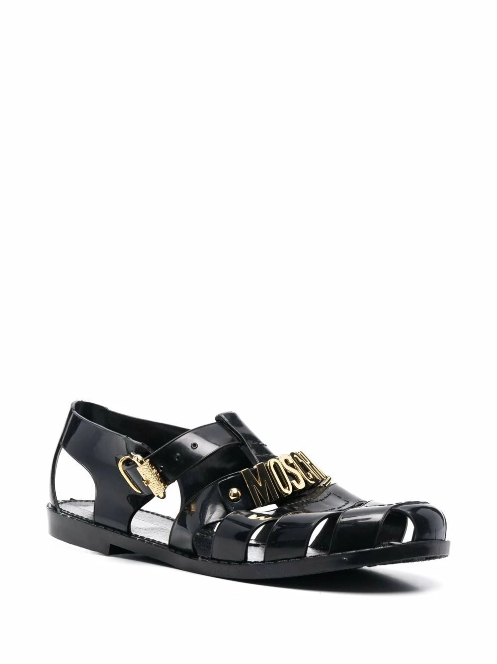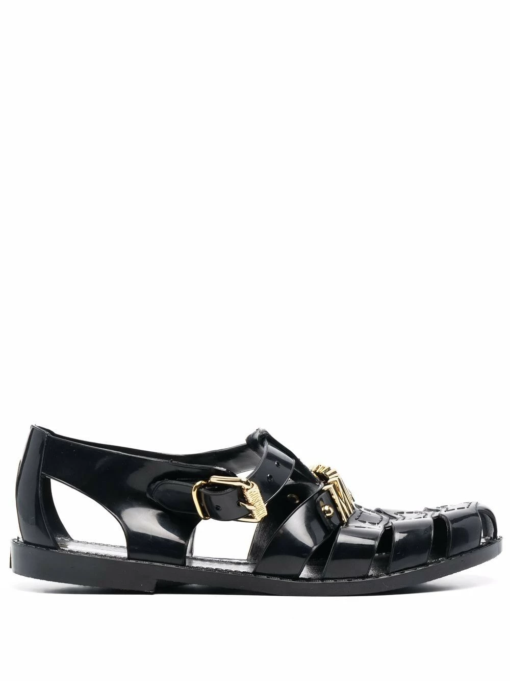 Stylish and versatile, these black logo-lettered strappy jelly sandals from Moschino feature the label’s signature gold-tone branding across the front foot. Set atop an easy-to-wear rubber outsole, they fasten with a side buckle closure and boast a breathable multi-strap design.