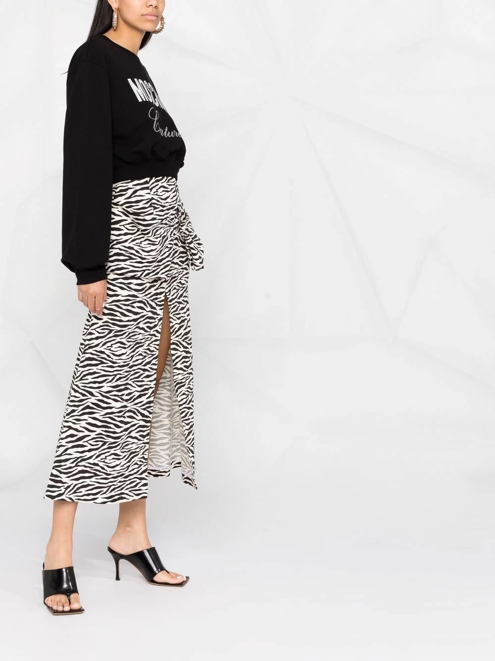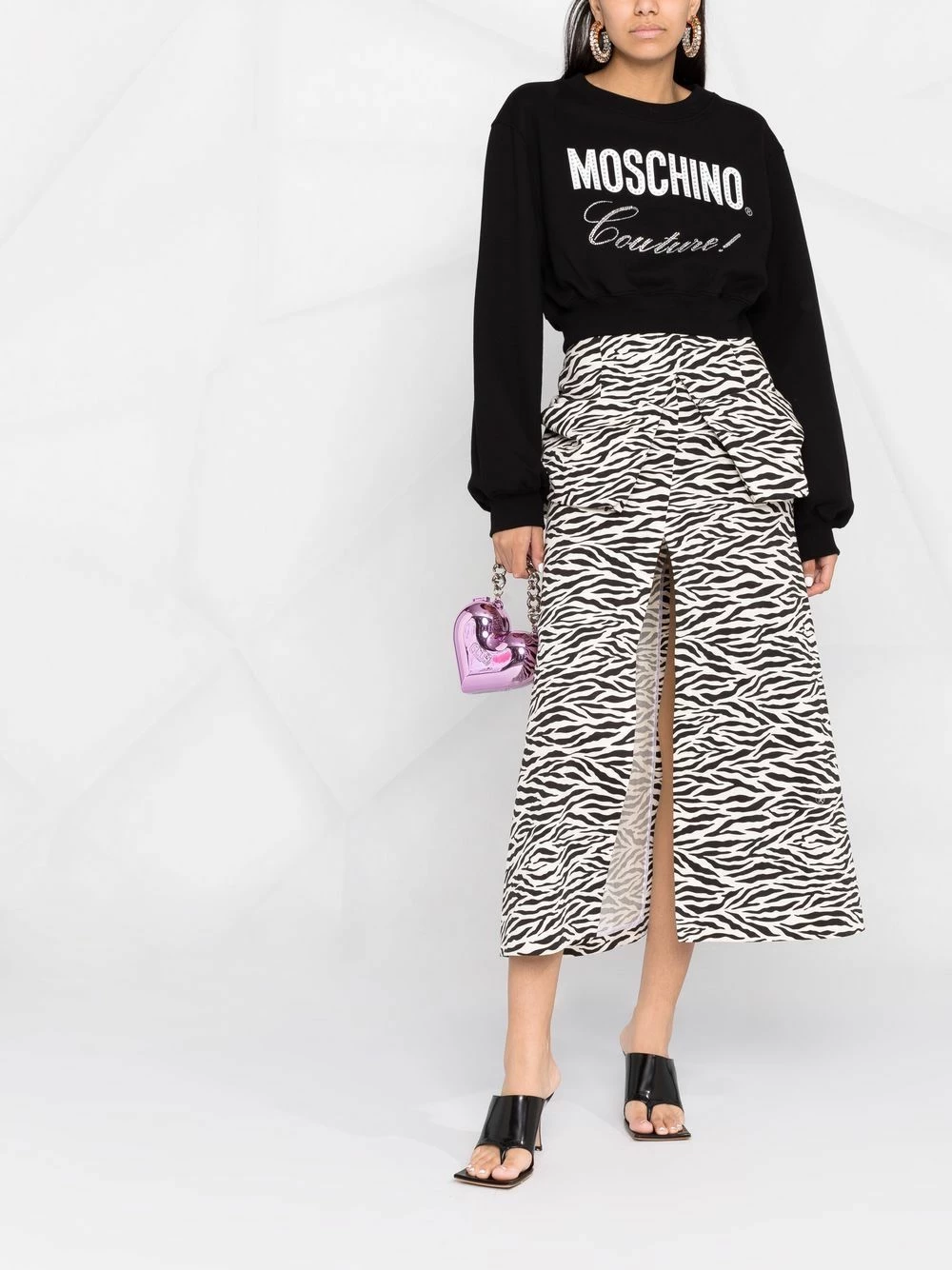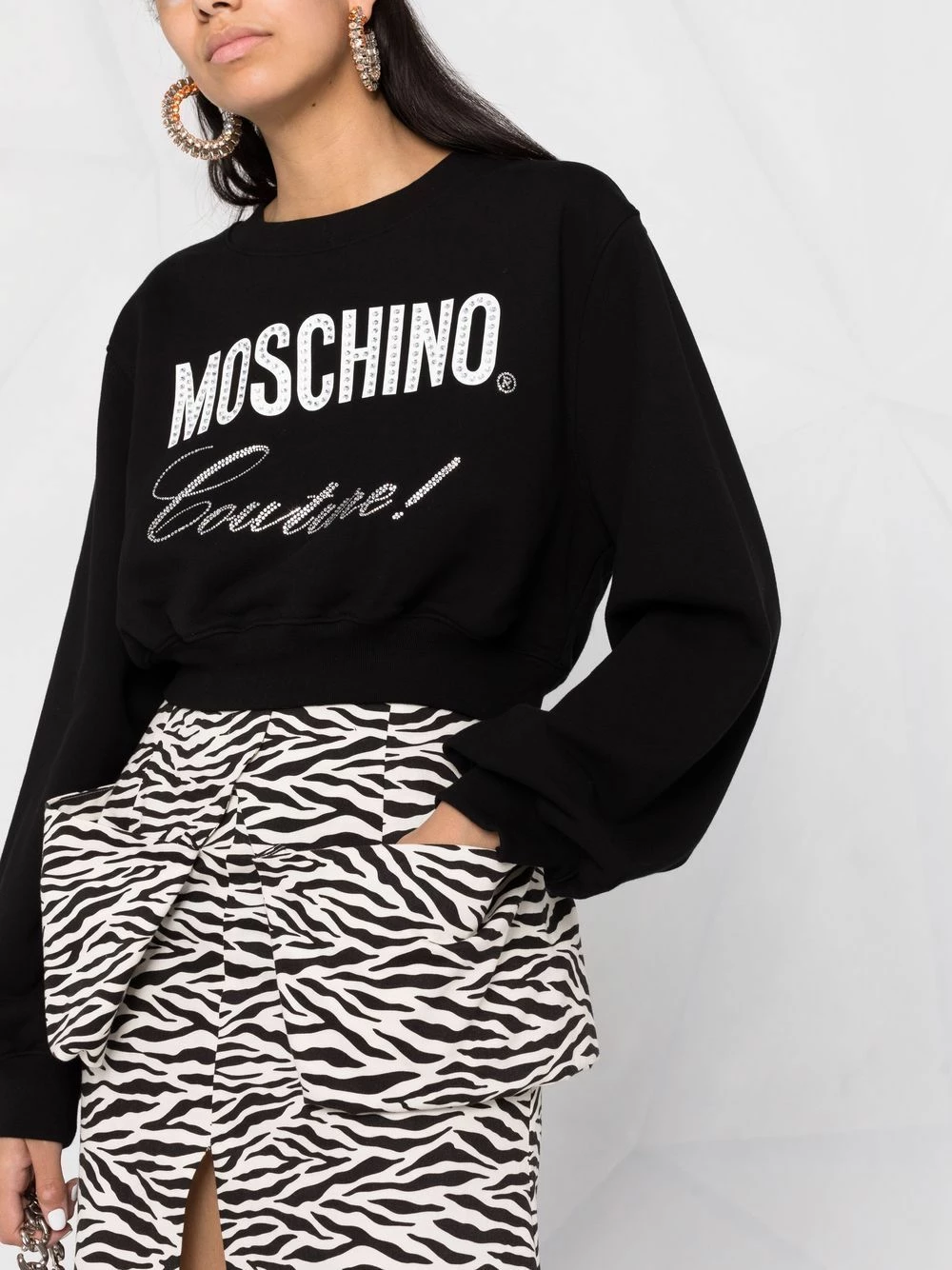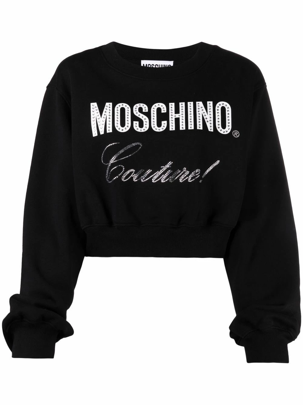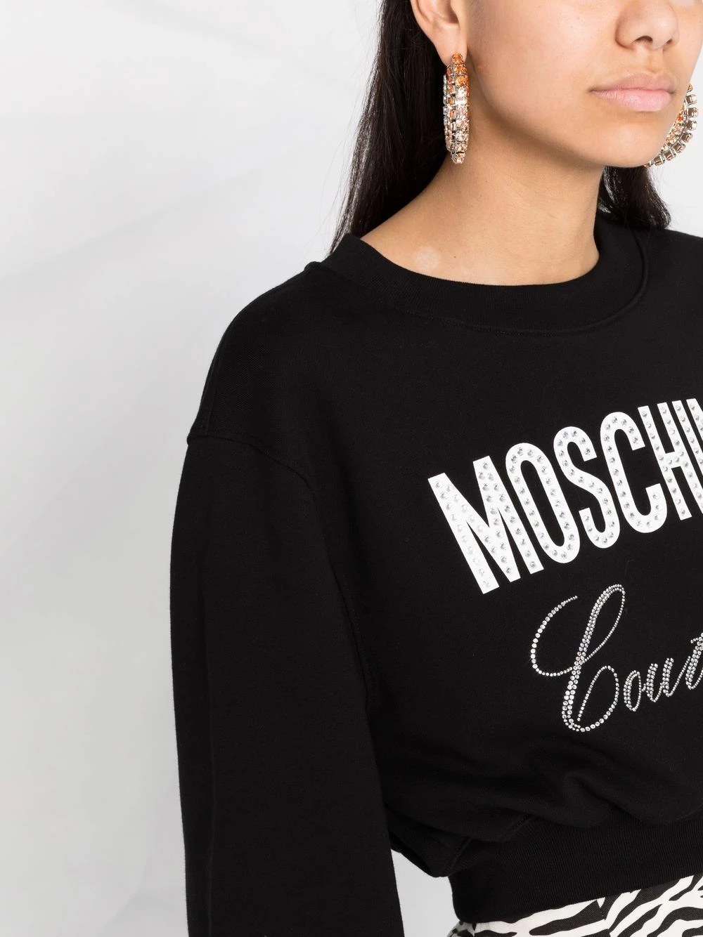 Moschino’s cropped sweatshirt bears the label’s Couture logo print across its front, embellished with rhinestone crystals. Produced in Portugal from soft cotton, the relaxed design is finished with ribbed trims and a crew neckline.