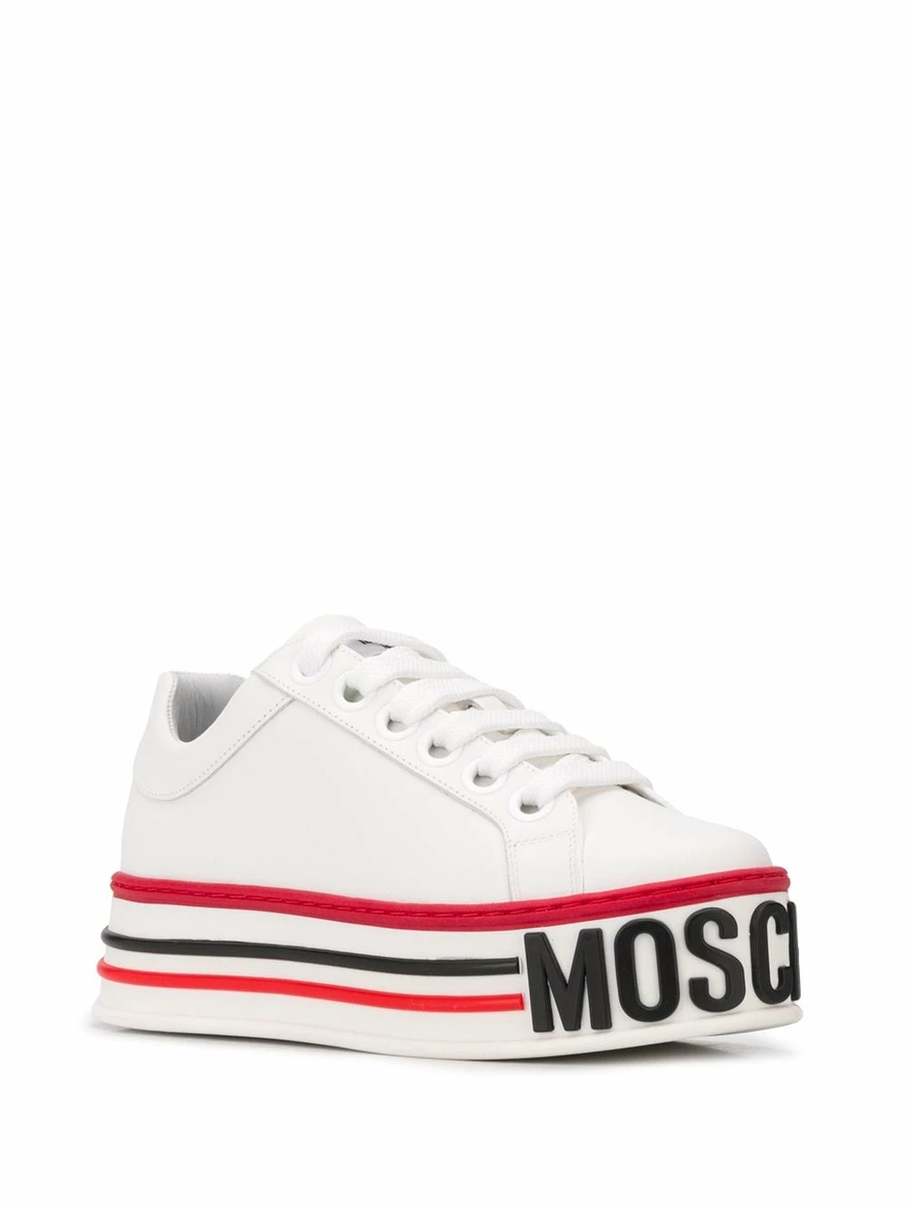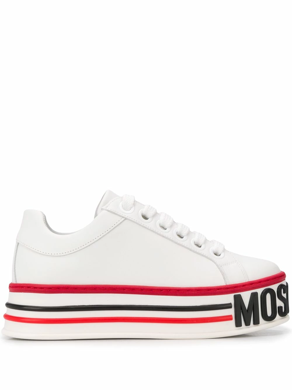 Don’t let others look down on you. These white, black and red calf leather striped flatform lace-up sneakers from Moschino will take you to new heights. How’s the view from up there? Featuring a lace-up front fastening, a round toe, a flatform sole, logo to the front, horizontal stripes, a logo patch at the tongue, stitching details and a mid-heel.
