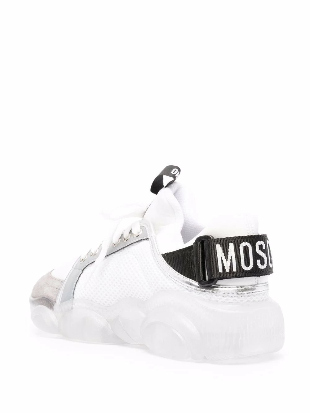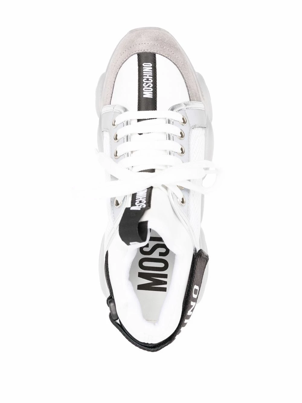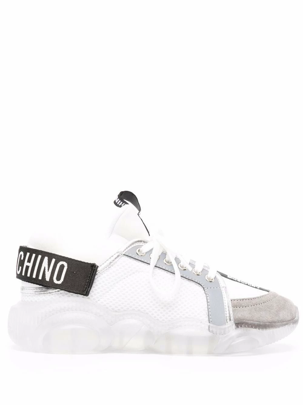 Reworked into a charismatic rubber sole, the iconic Teddy Bear motif makes a bold appearance on these white and grey-hued sneakers. Alongside a logo pull tab at the rear, this iteration of Moschinoโs iconography provides instant recognition.