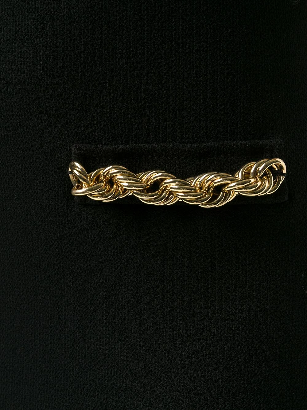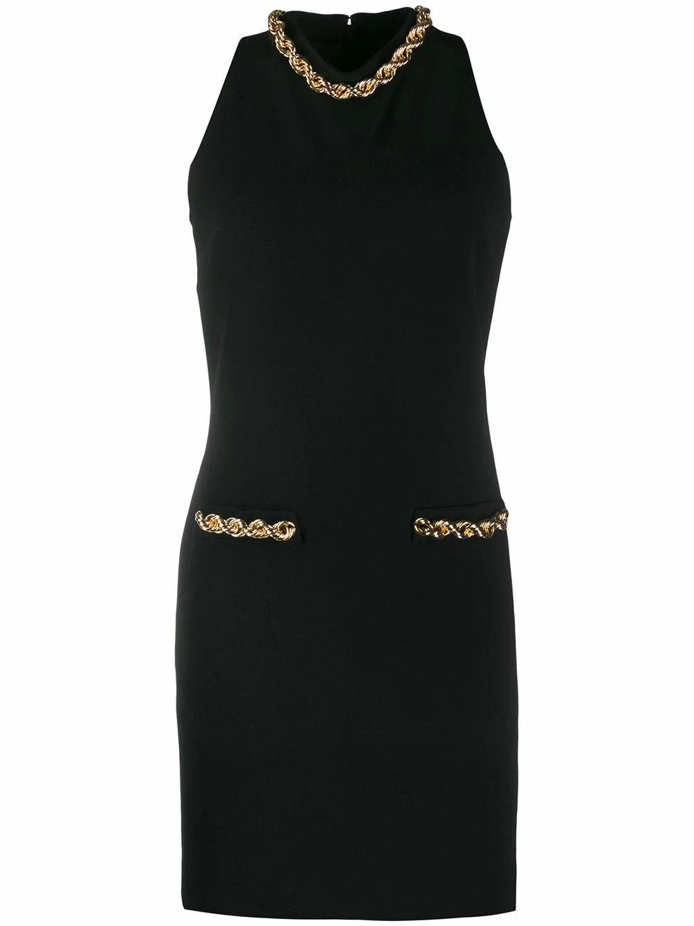 The flamboyant Moschino mode continues to be the perfect combination of pop culture humour and high-end Italian construction. This black virgin wool chain trim dress features a round neck, a sleeveless design, a gold-tone chain trim and a short length.