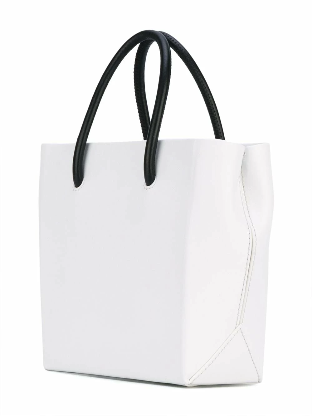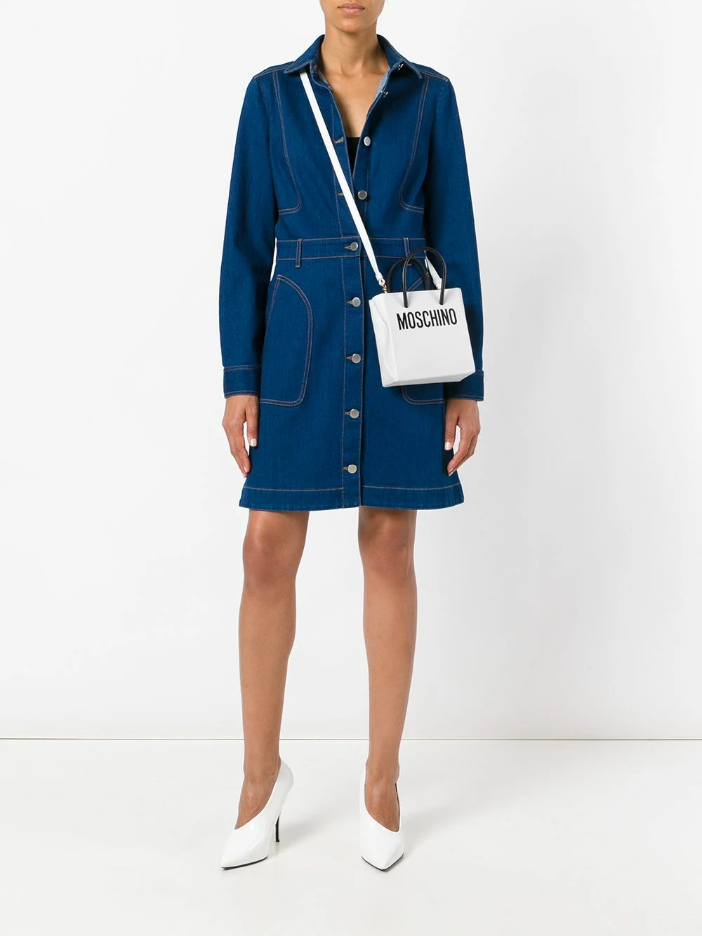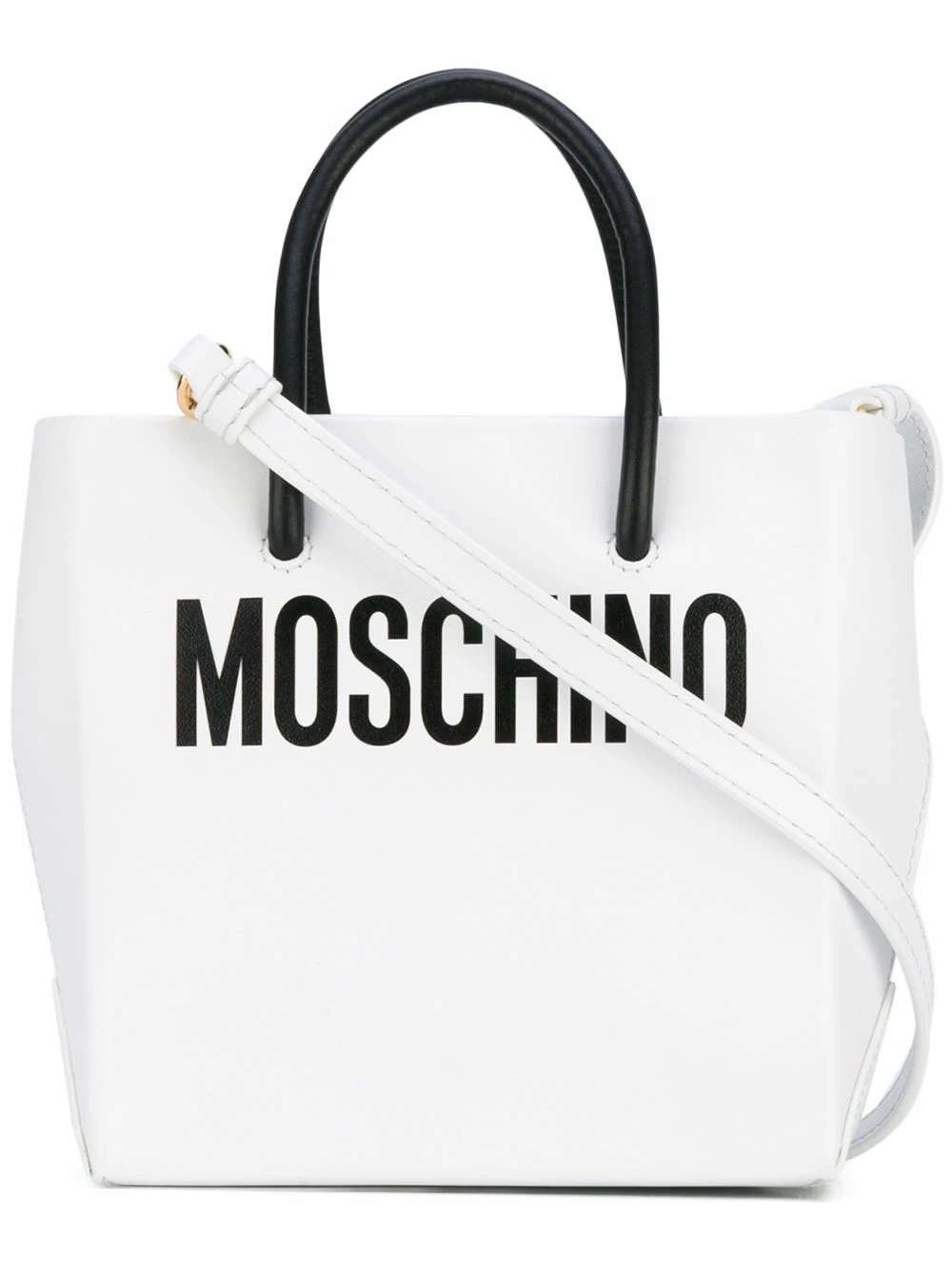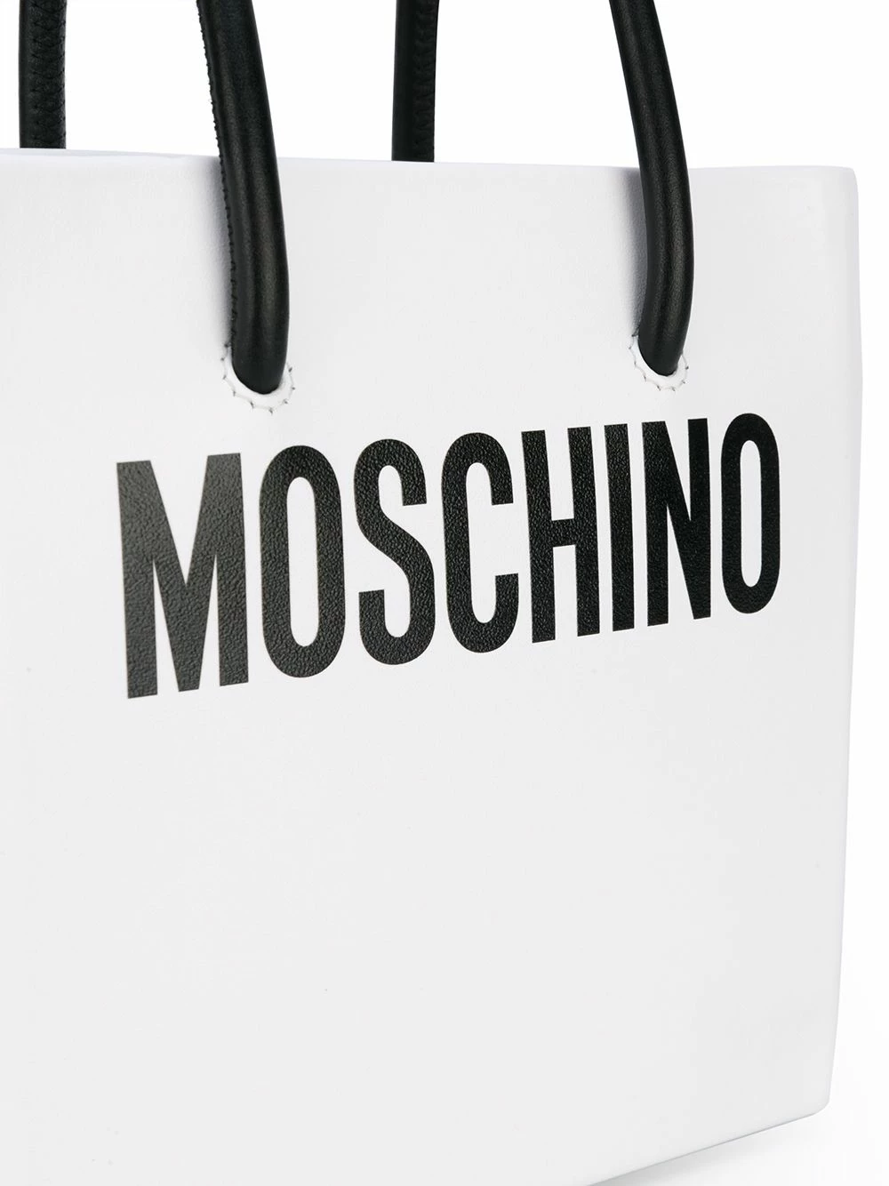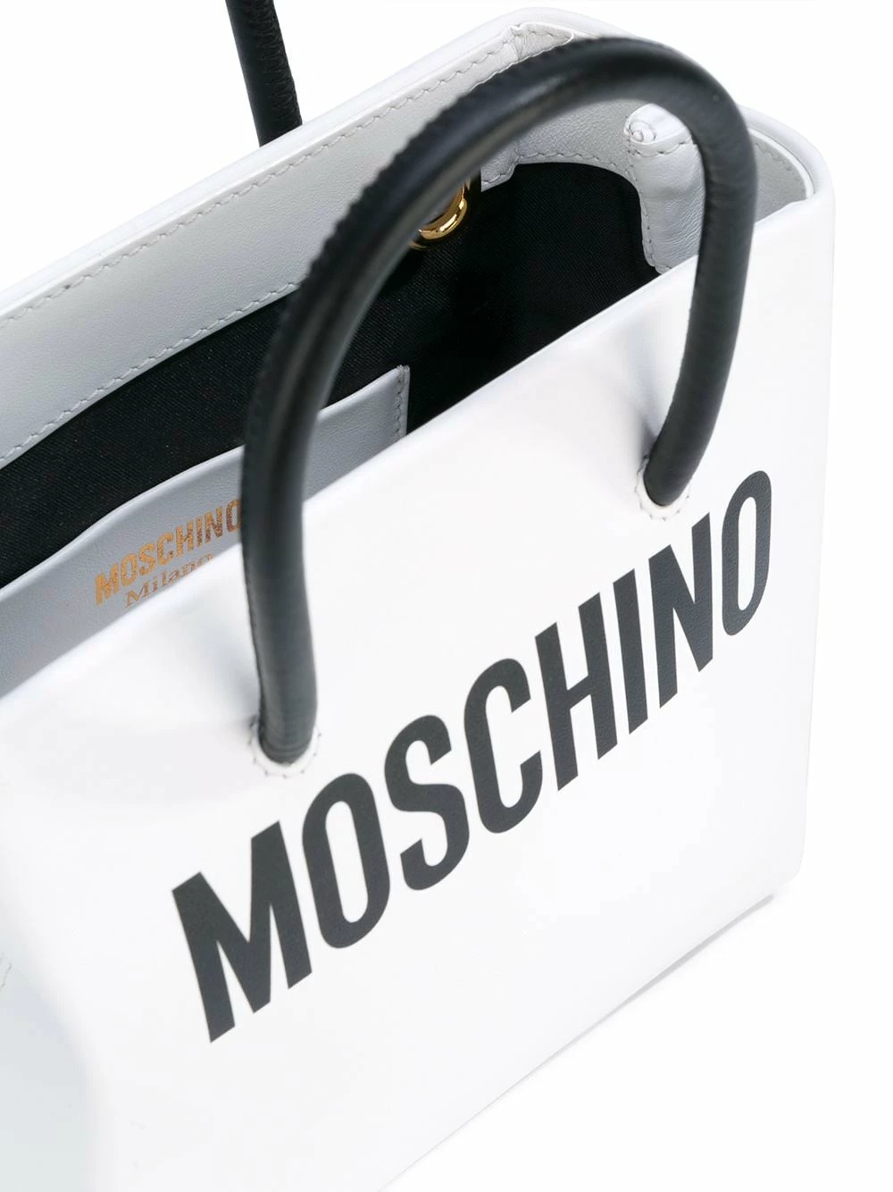White and black leather cross-body mini shopper bag from Moschino featuring top handles, an open top design, an internal slip pocket, a detachable and adjustable shoulder strap, a structured design and signature Moschino logo on the front.