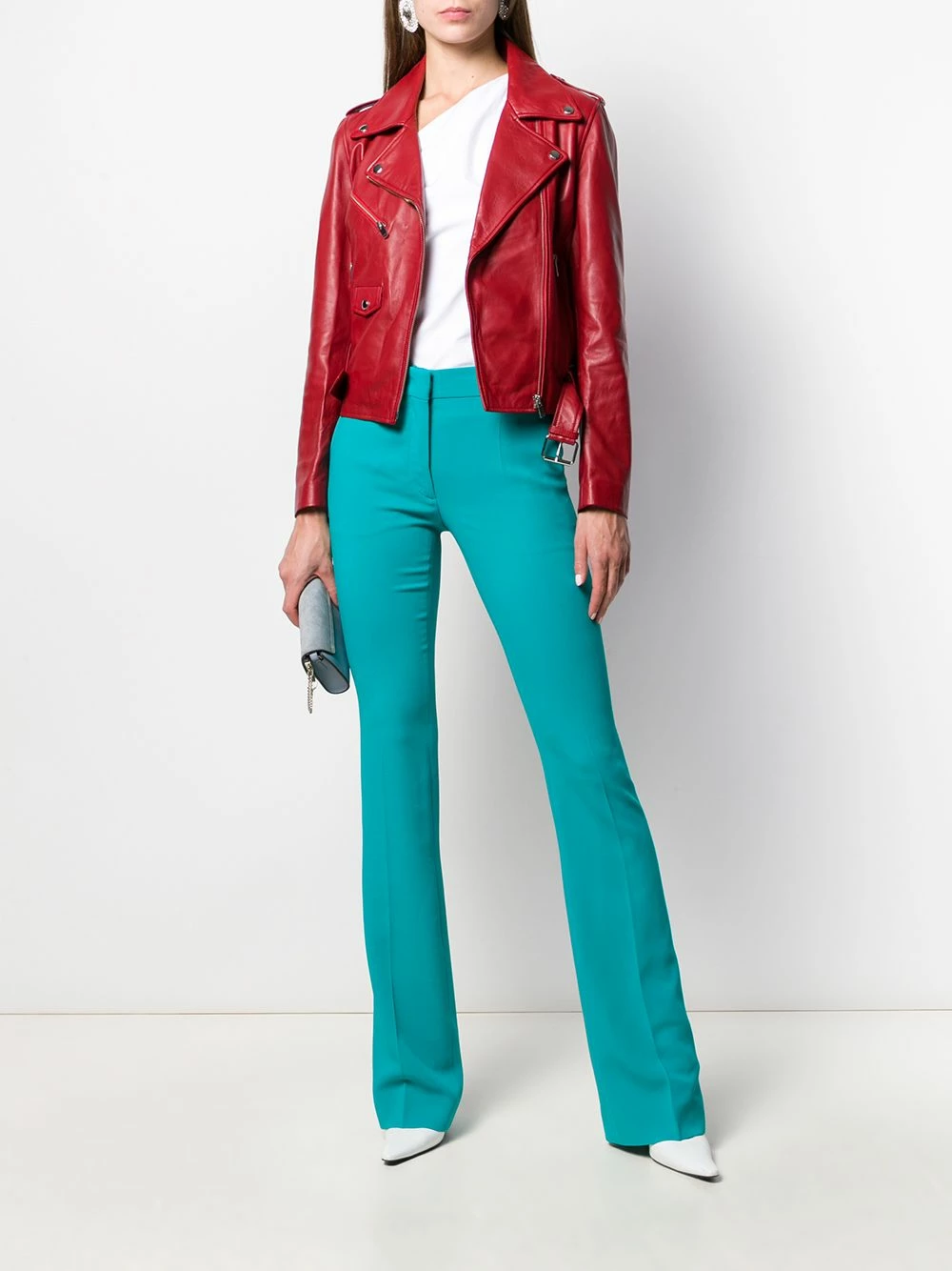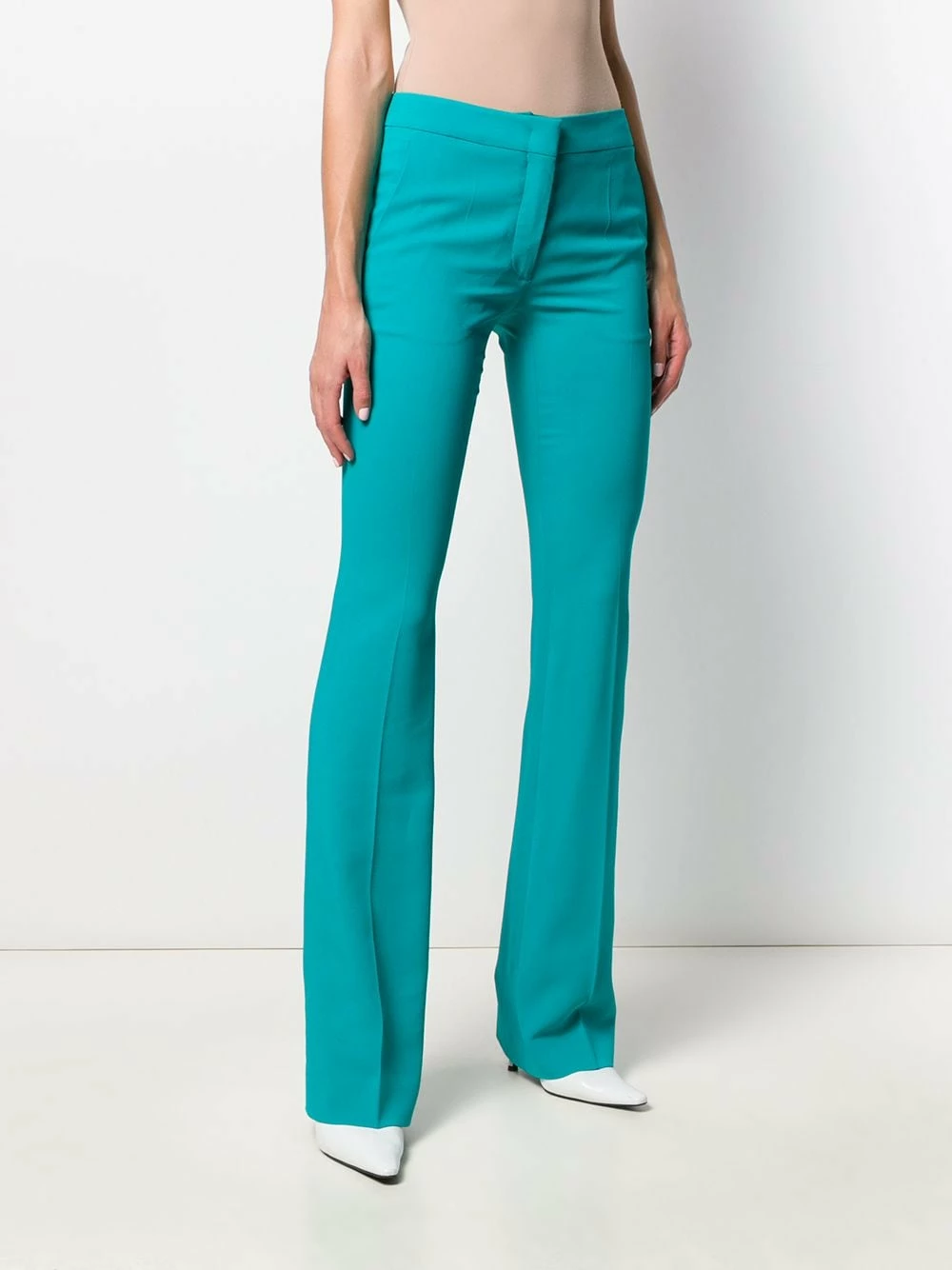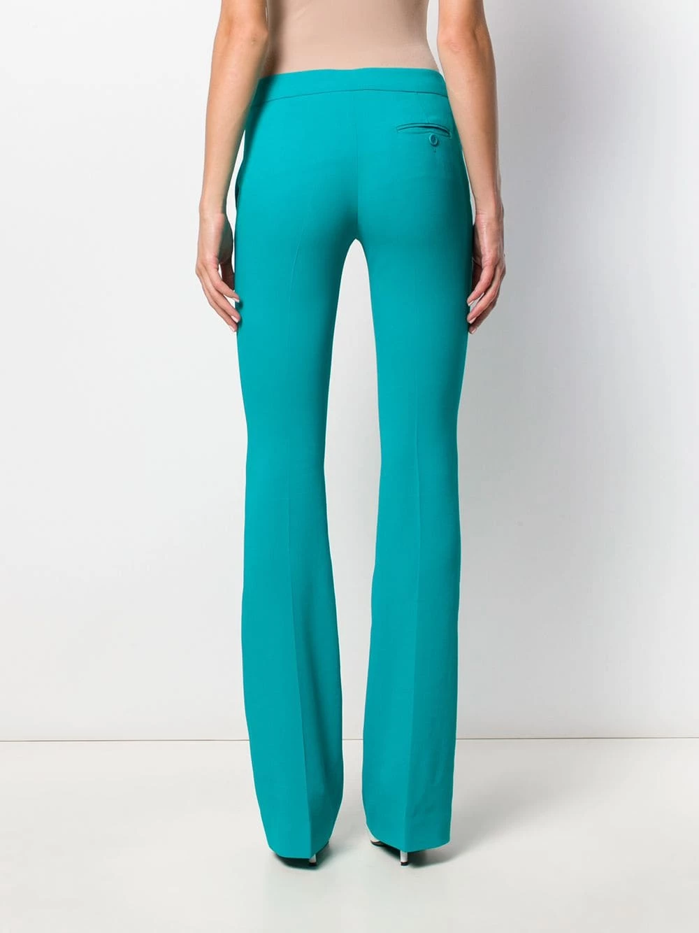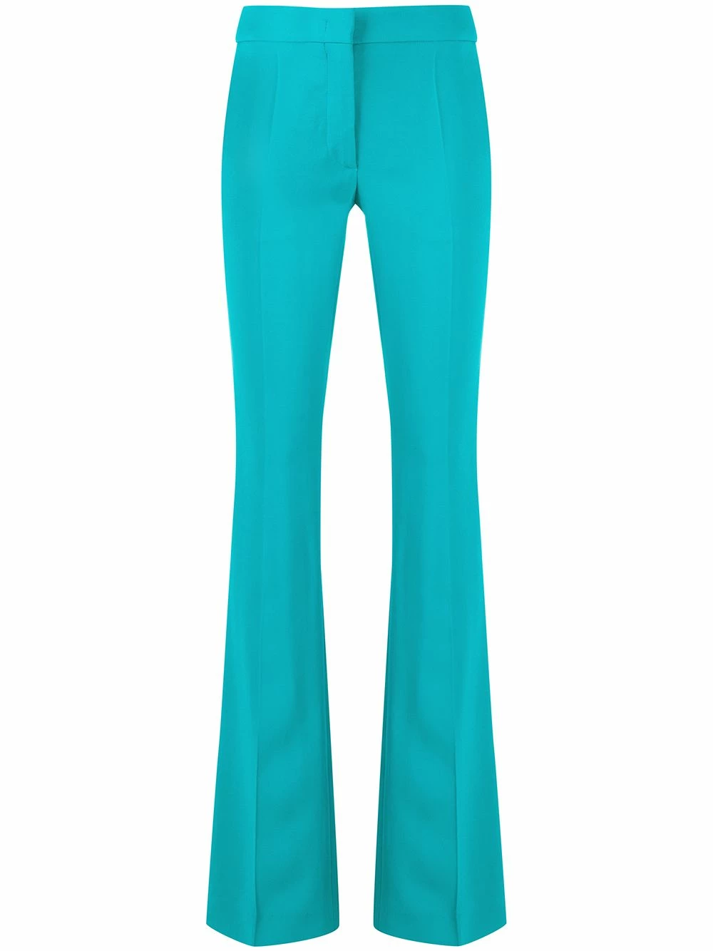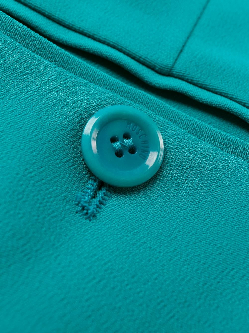 The Moschino aesthetic is provocative, daring and youthful. These cyan blue flared mid-rise trousers feature a button and zip fly, a back pocket, side pockets, a long length and tonal stitching.