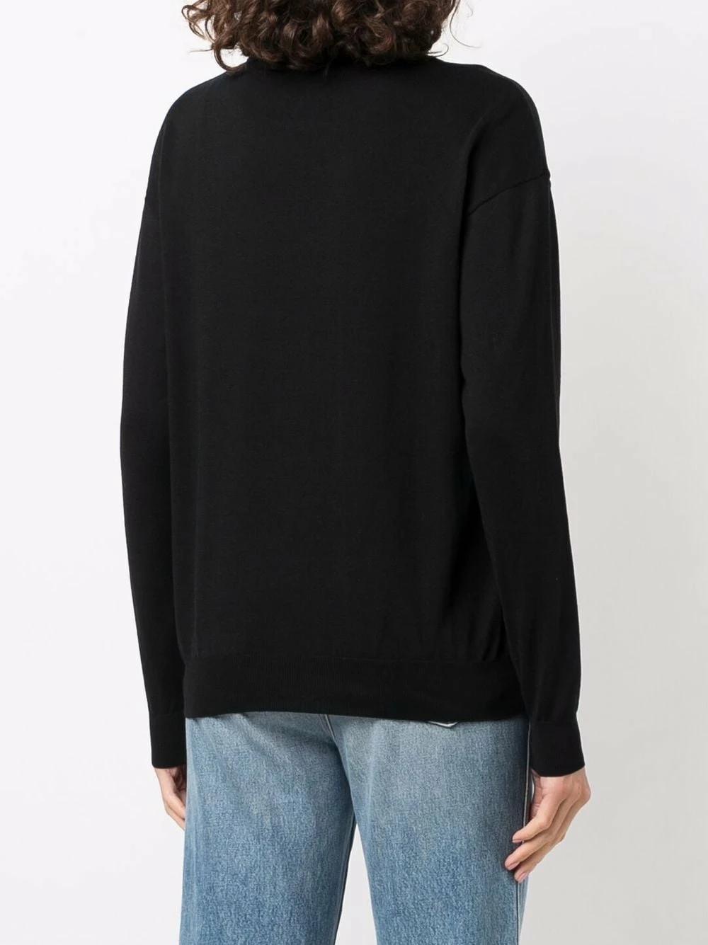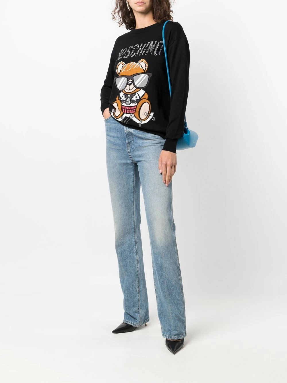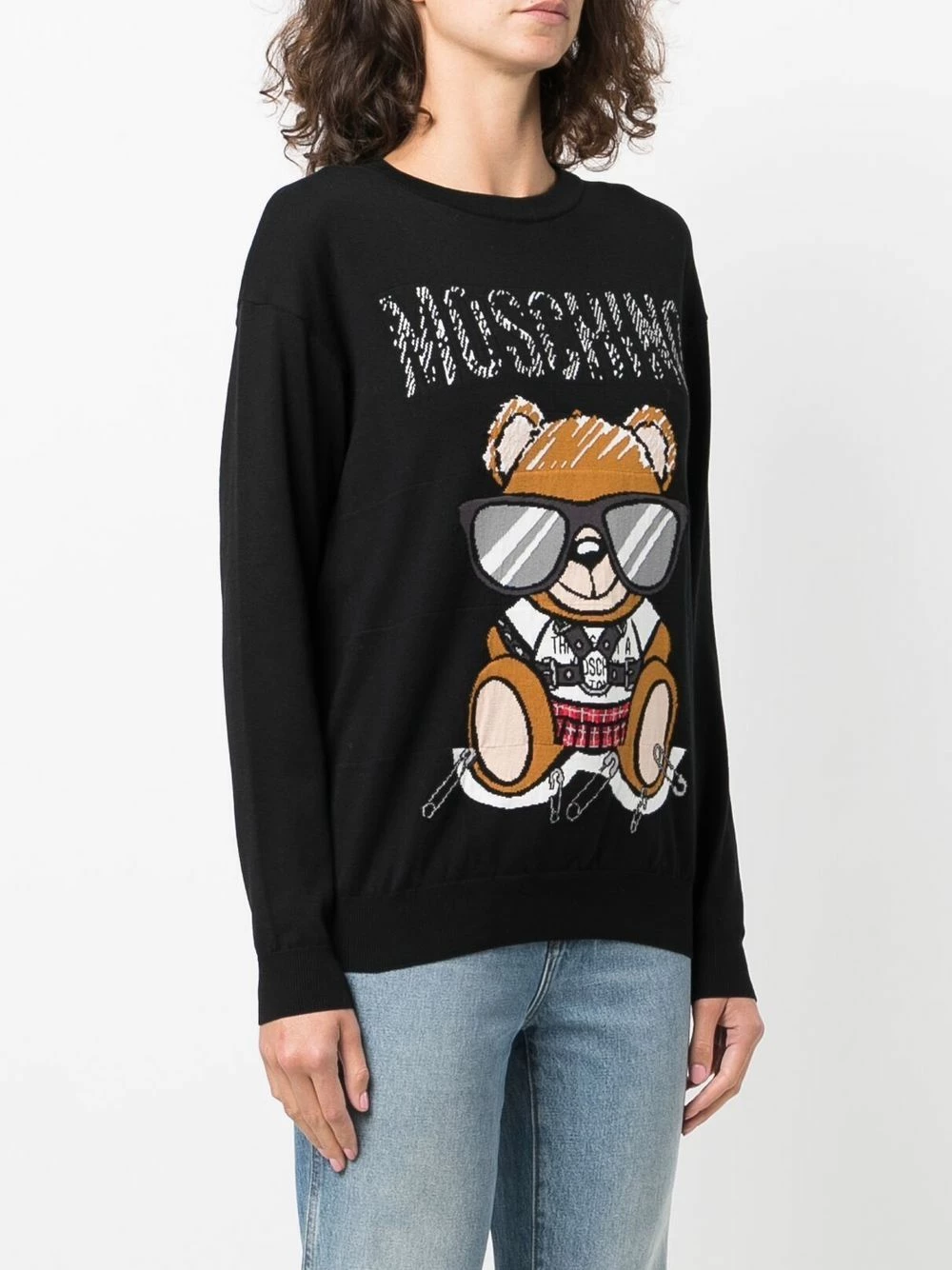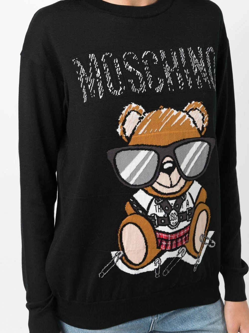 The teddy bear has established itself as a key motif for Moschino. Today it is presented as an intarsia on this jumper – adding bold branding to this black design.
