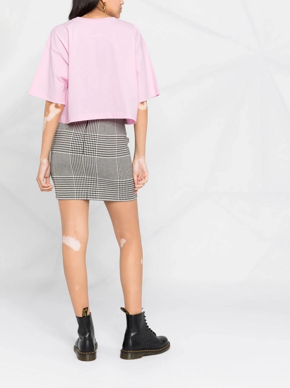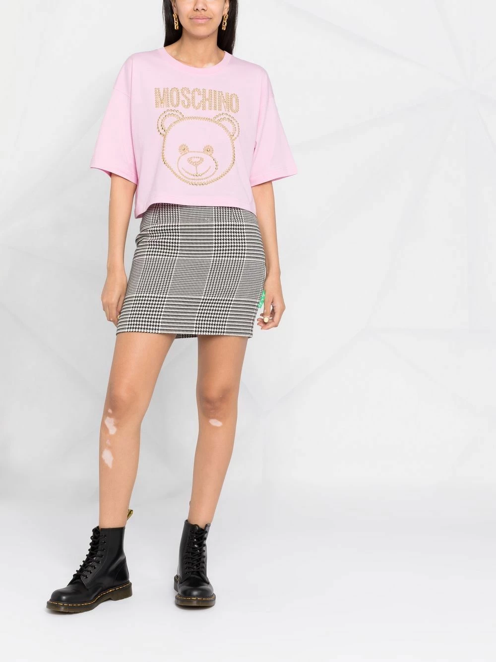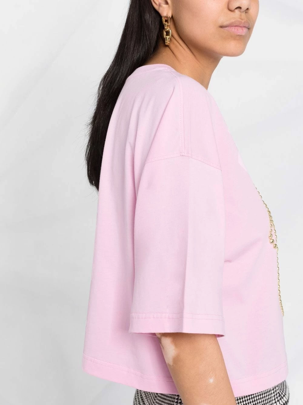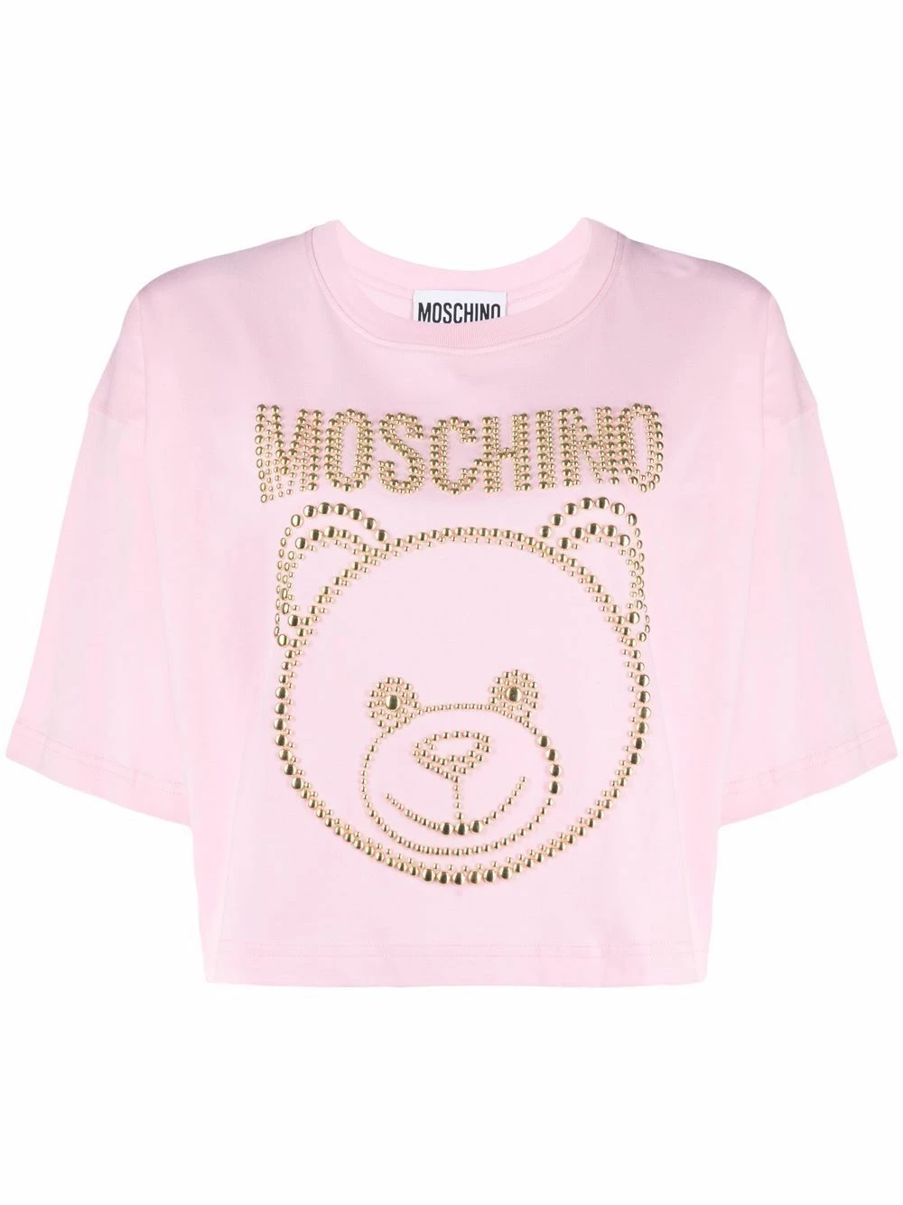 Moschino continues with its playful and decorative aesthetic this AW21. Adorned with gold-tone studs to form the shape of a teddy bear, this pale pink cropped T-shirt boldly celebrates the brand’s fun attitude to fashion.