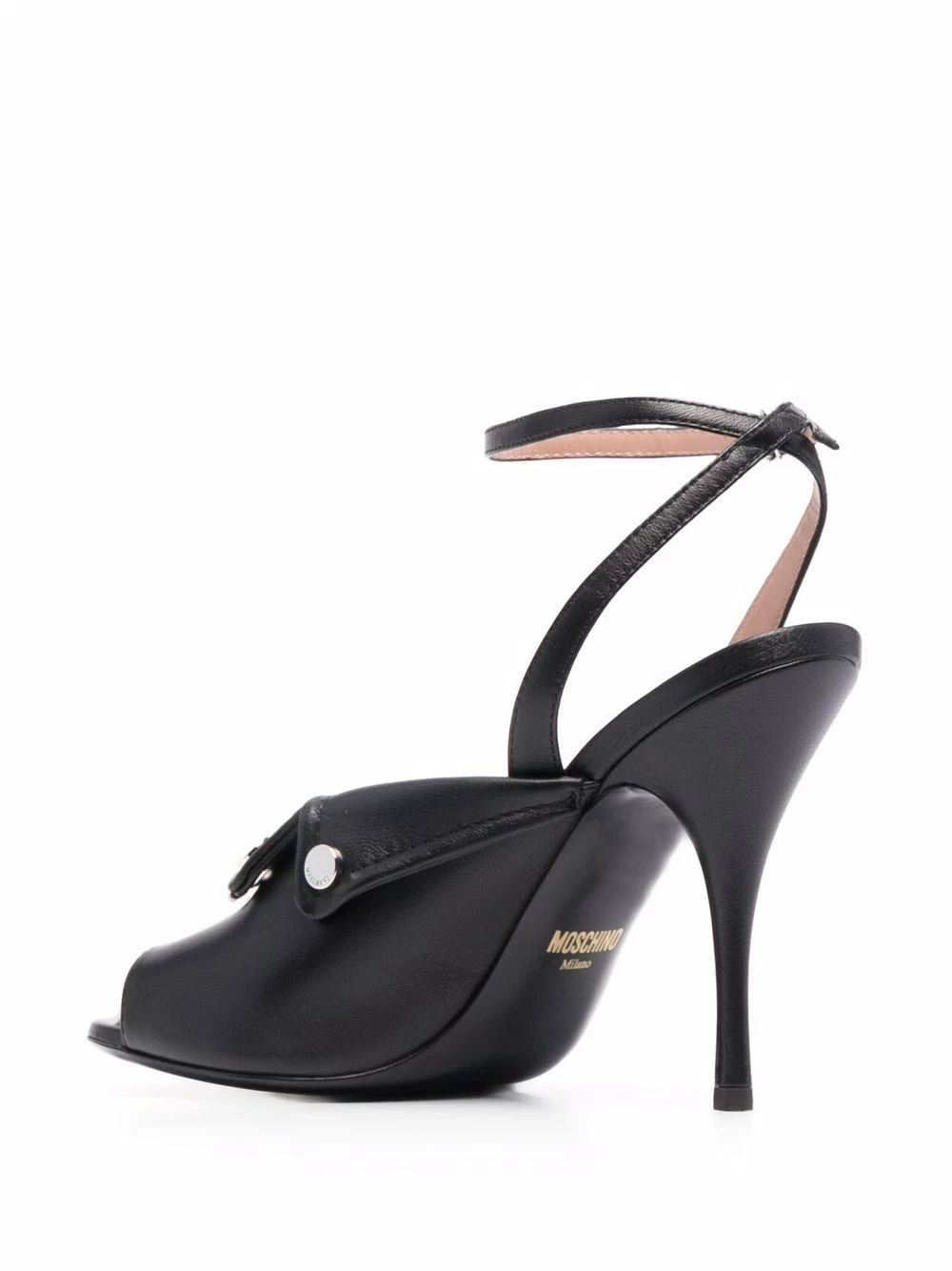 Moschino’s innovative design style can be seen in the construction of these open-toe sandals, with a polished finish and silver-tone hardware detailing such as snap buttons and a zip, adding a biker jacket inspired edge.ย