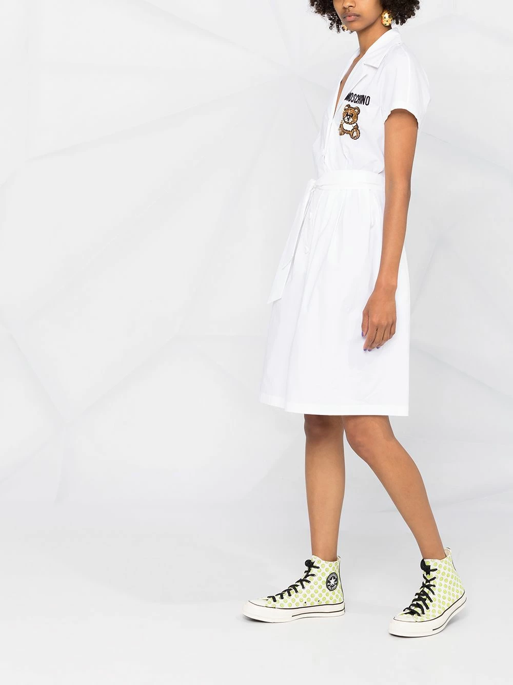 Summer’s calling your name. And Moschino makes sure you bring the heat in this belted shirt dress, decorated with a bead-embellished logo and the fashion house’s signature teddy bear motif at the chest. Winter can’t be over any sooner…