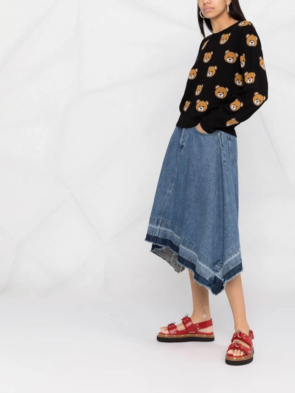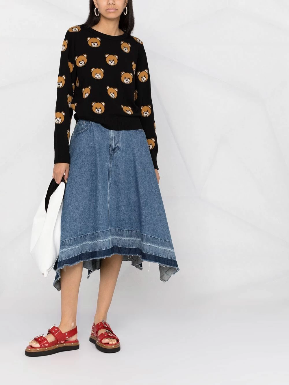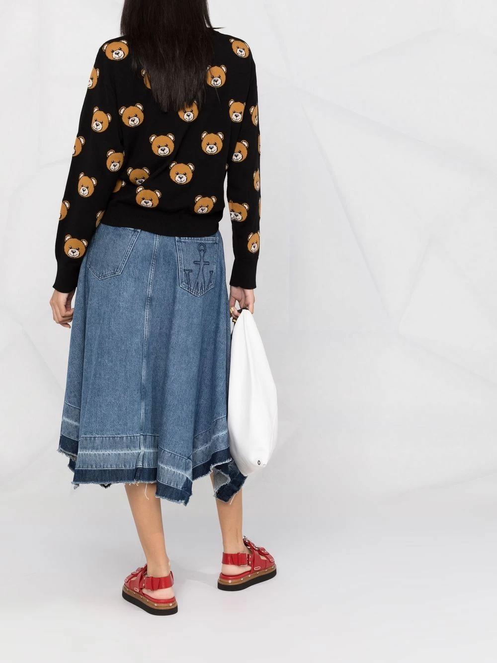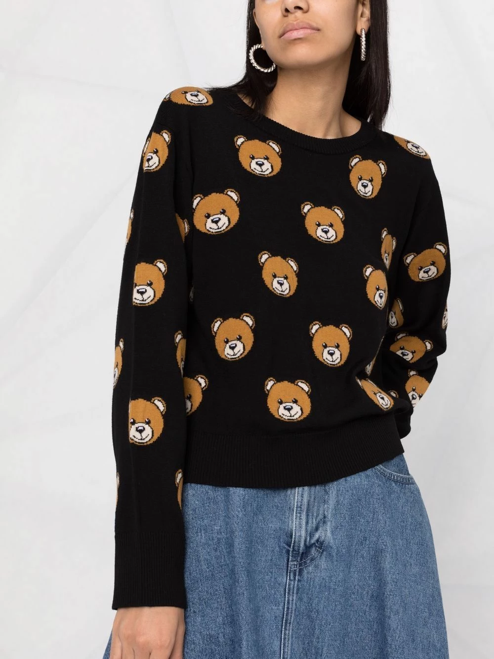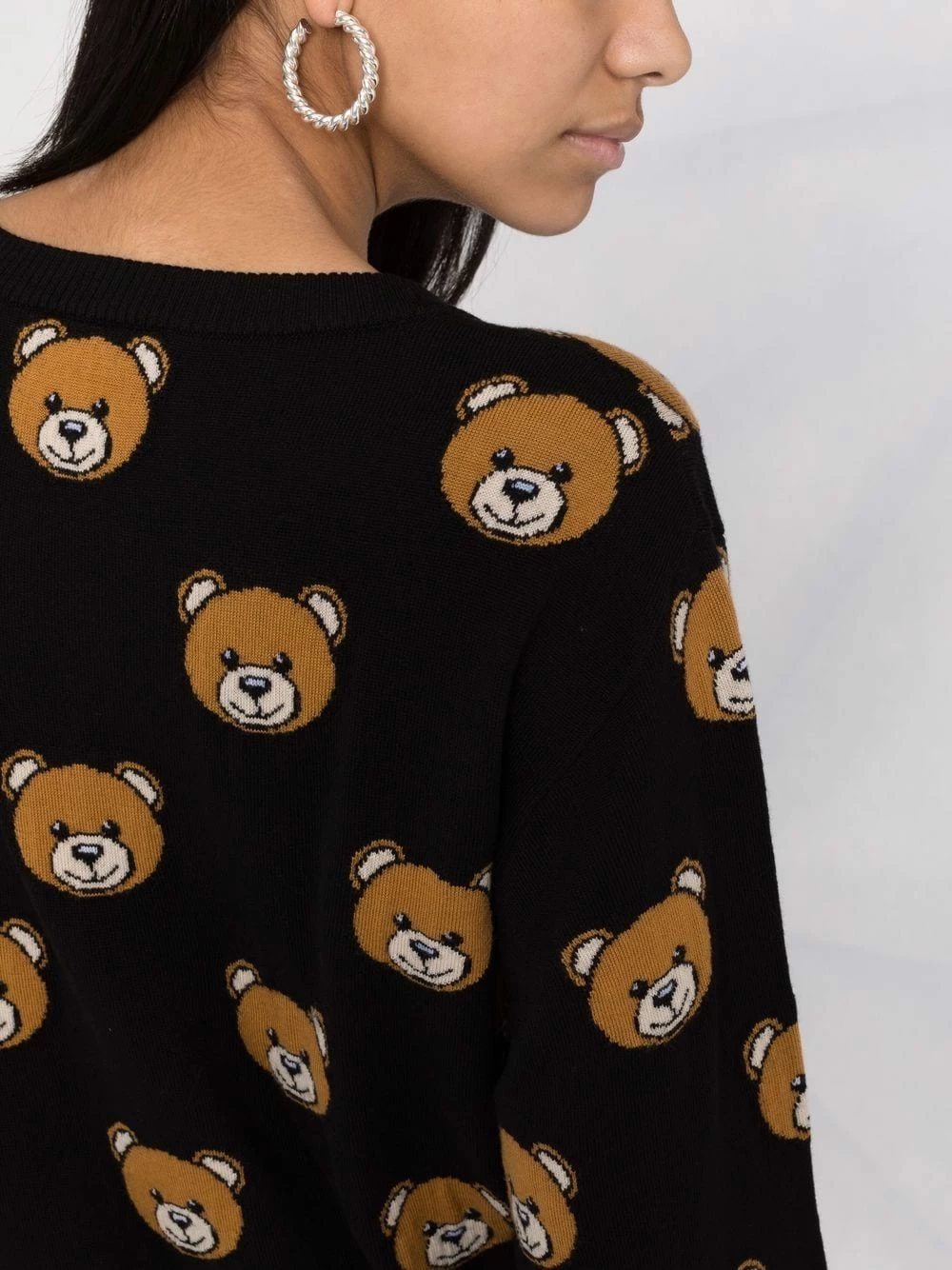Moschino’s jumper showcases the House’s penchant for playful design. This virgin wool iteration is intarsia-knitted with the brand’s signature Teddy Bear for a youthful touch.