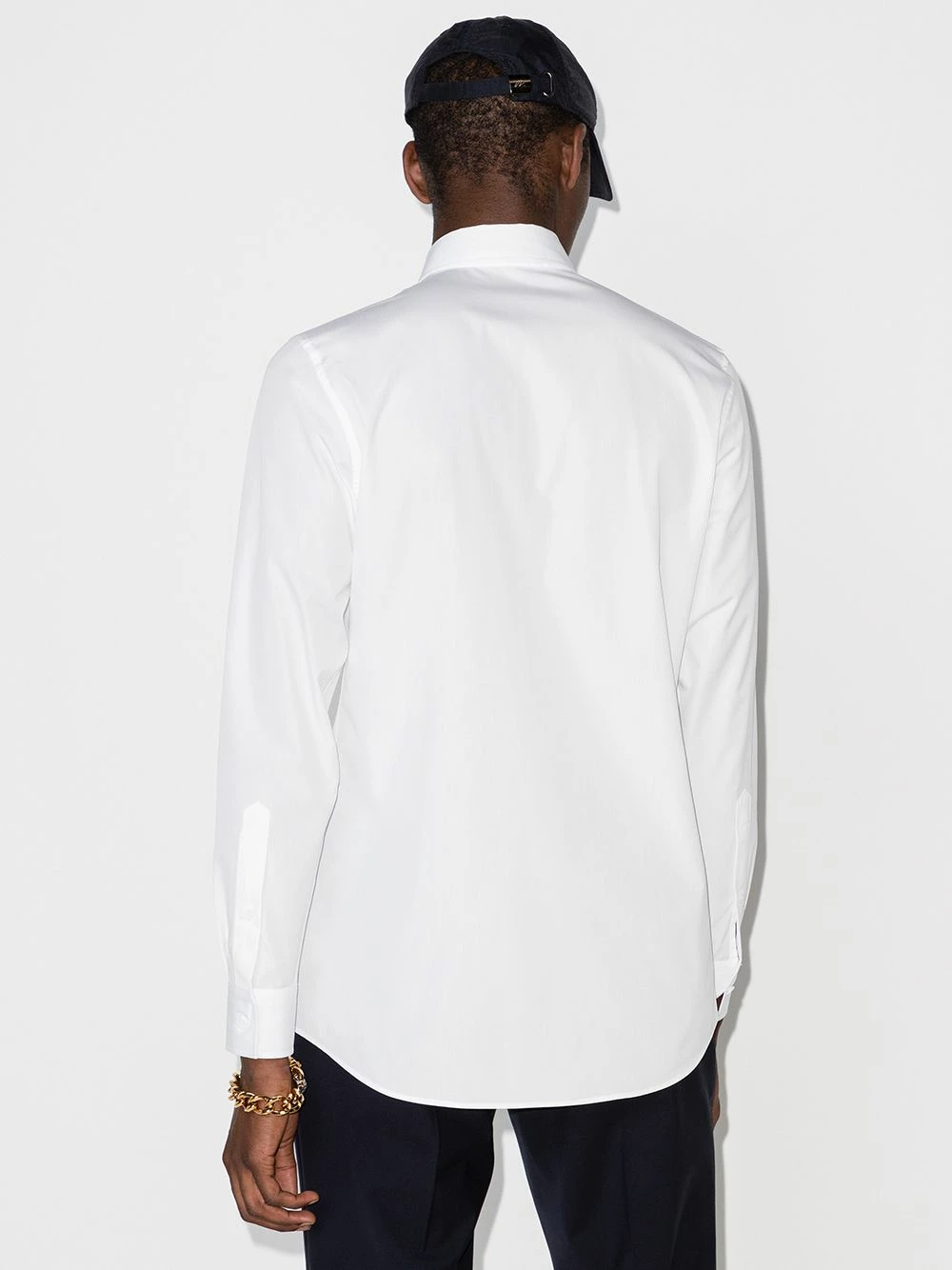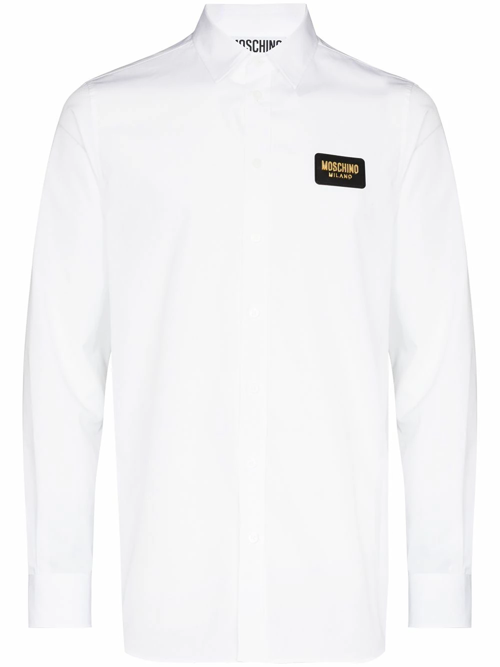 White cotton logo-patch cotton shirt from MOSCHINO featuring logo patch at the chest, classic collar, front button fastening and buttoned cuffs.