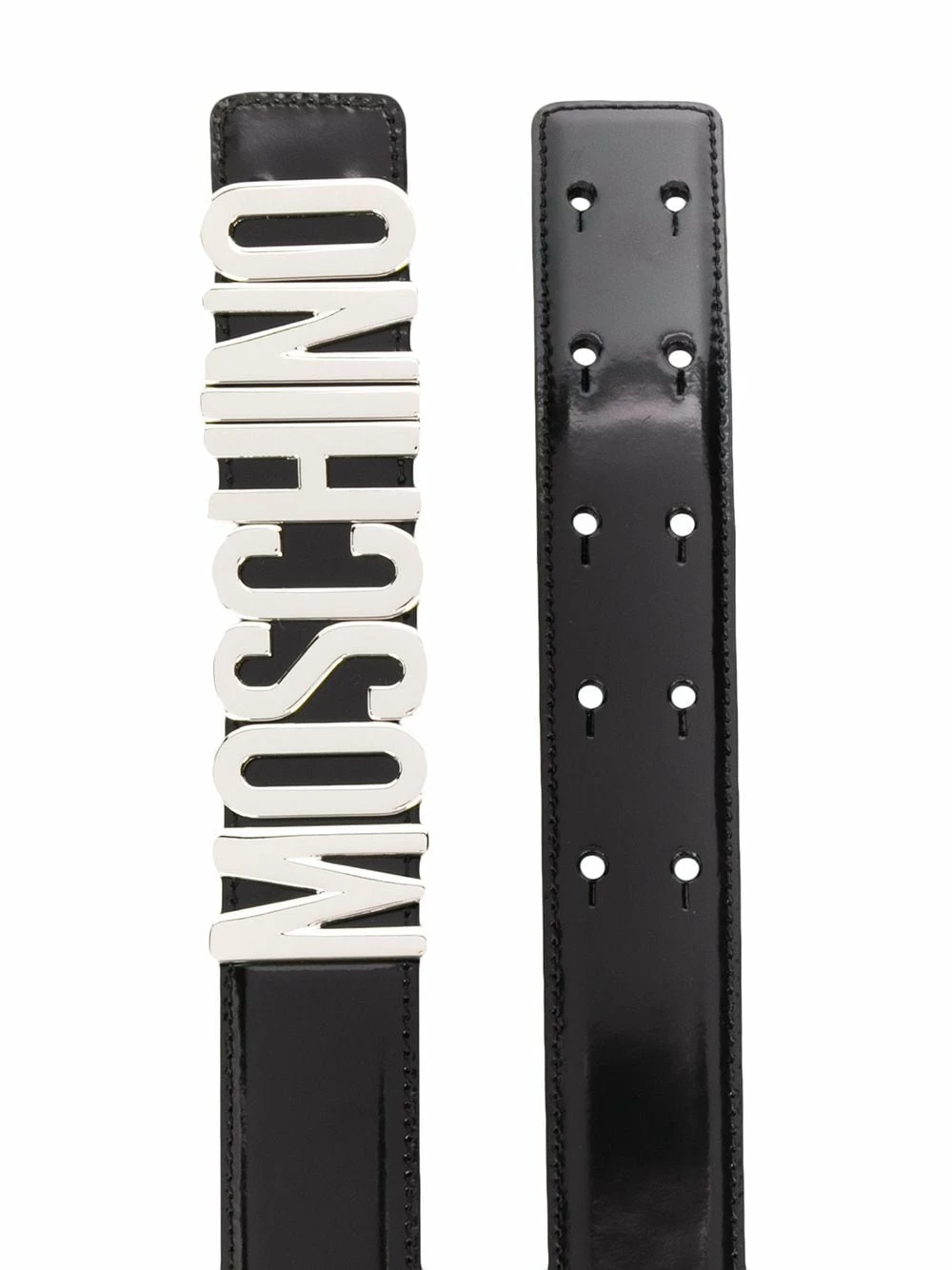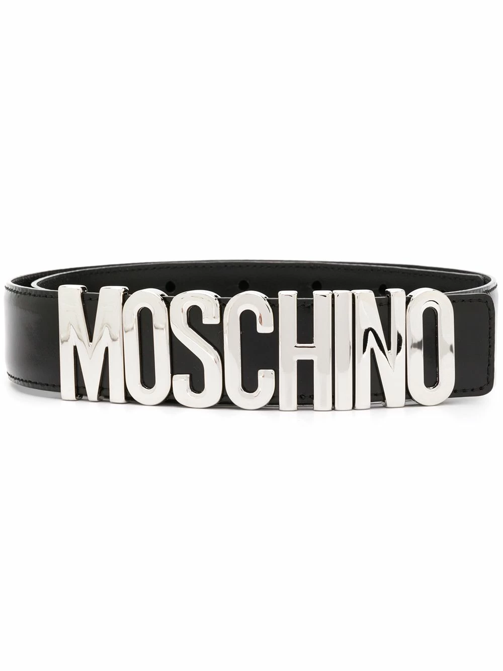 Pull your outfit together, literally and figuratively, with this black leather logo buckle belt from Moschino.