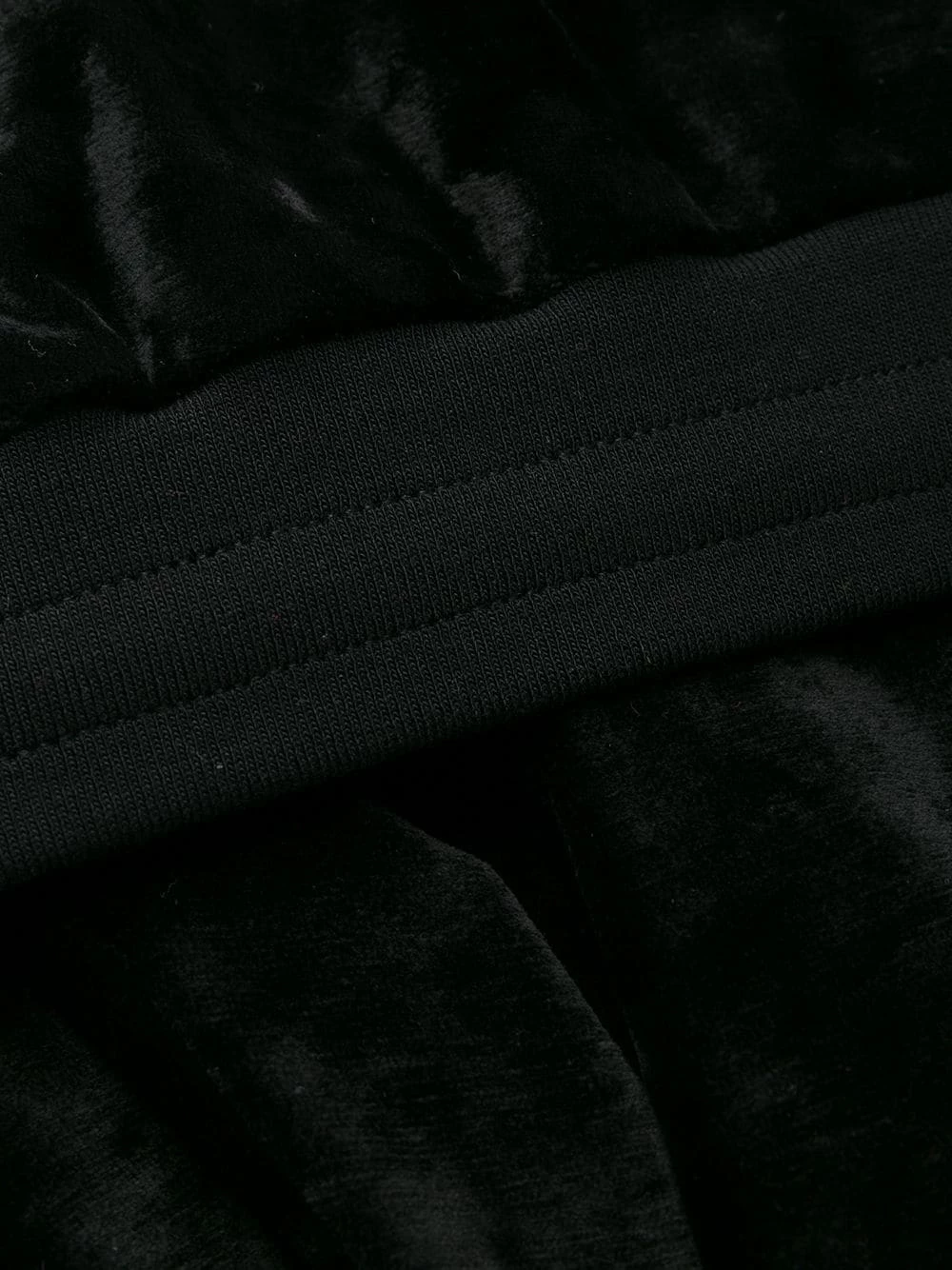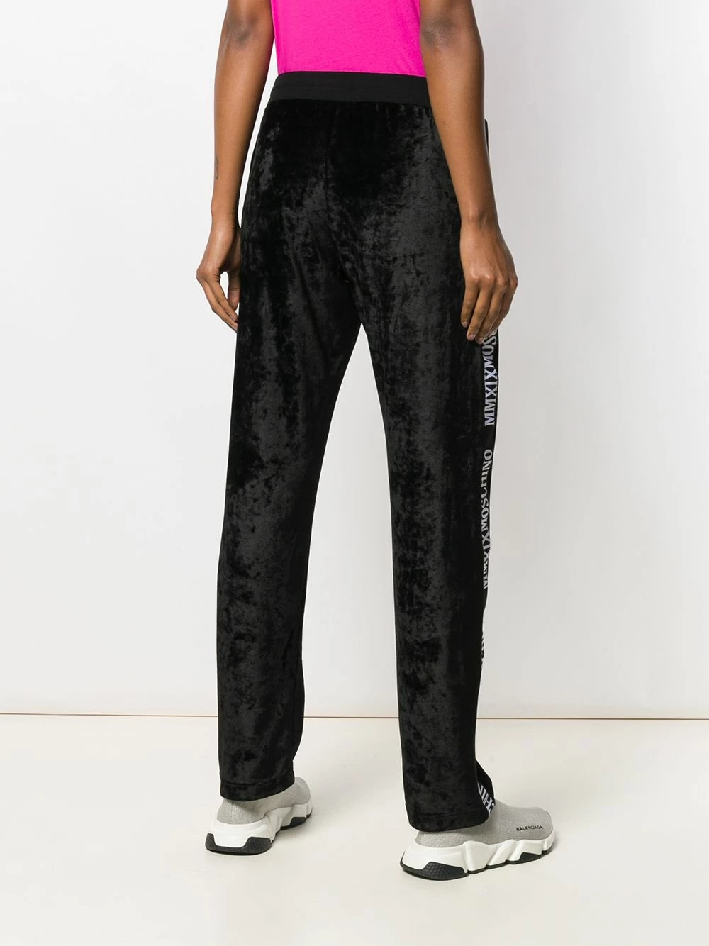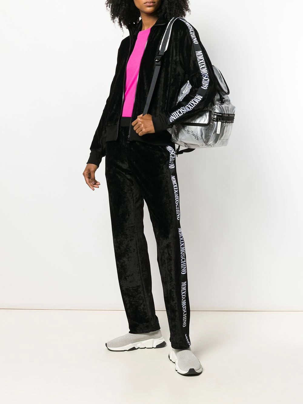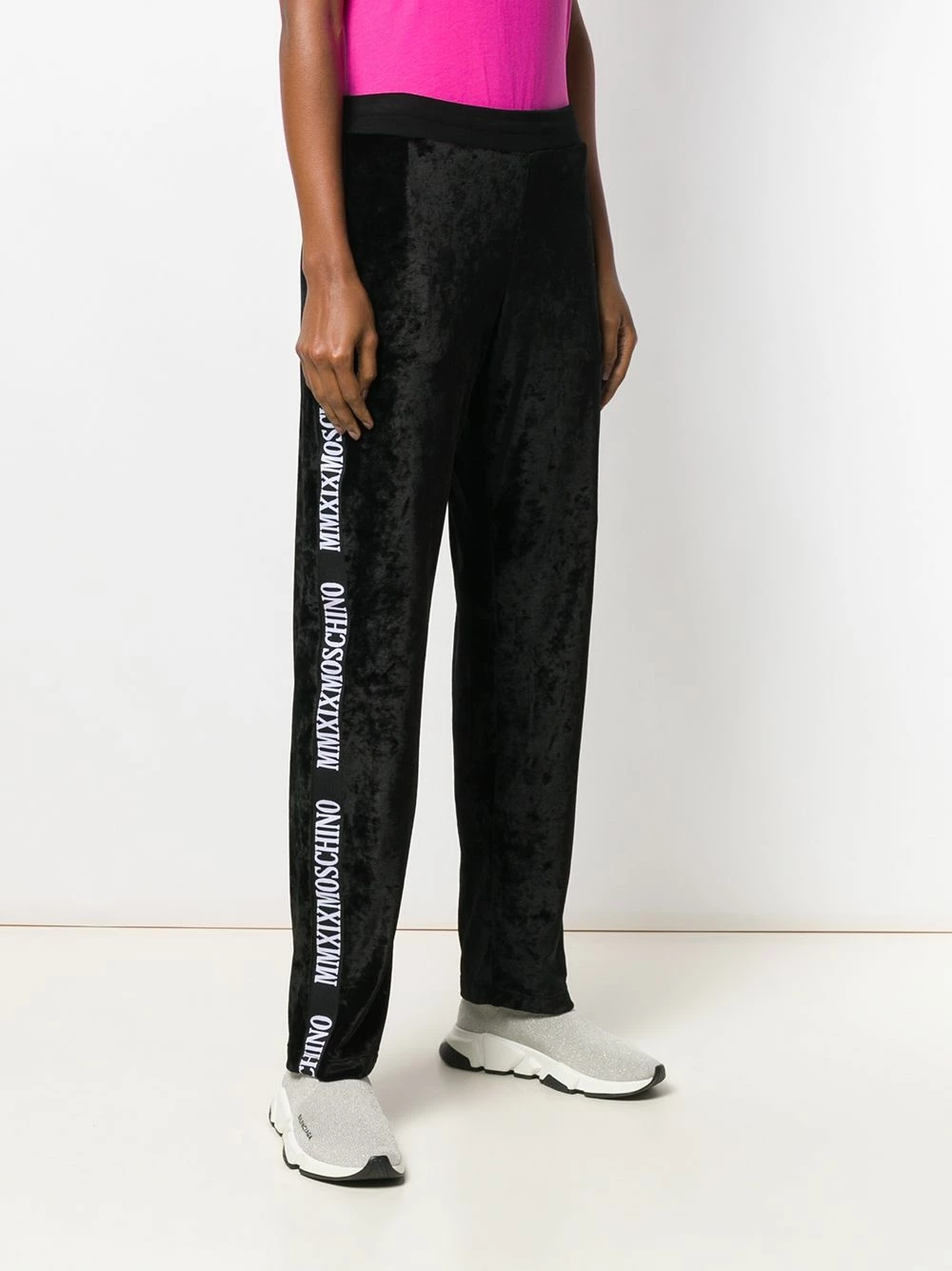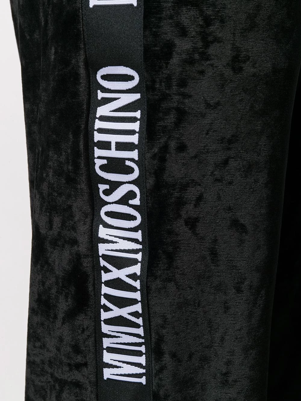 Black logo stripe track pants from Moschino featuring an elasticated waistband, a flared style, a regular length, a velvet finish and logo print stripe down the legs.