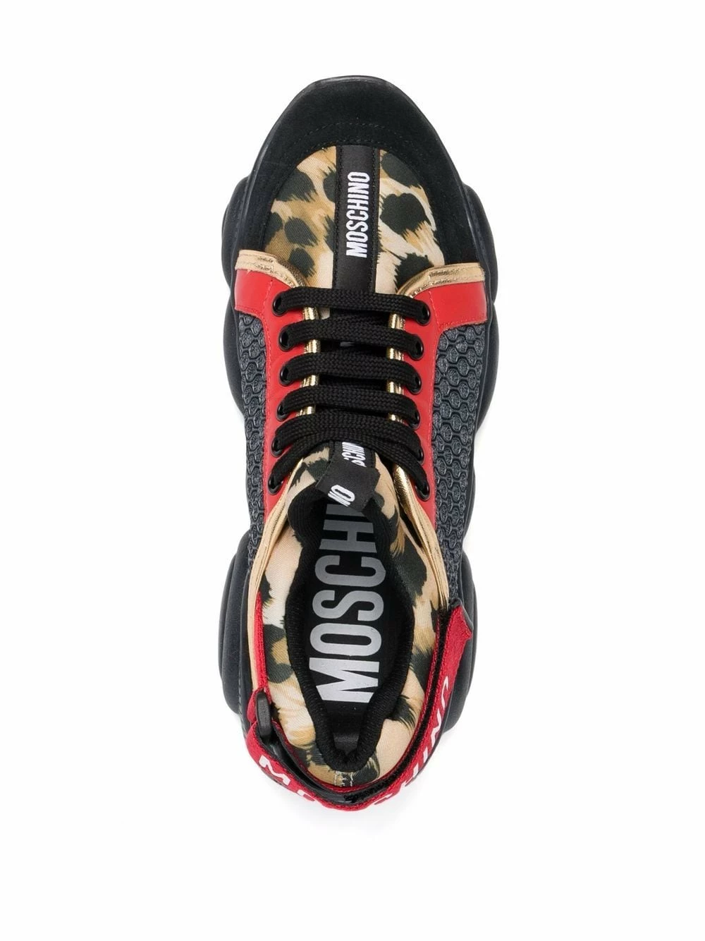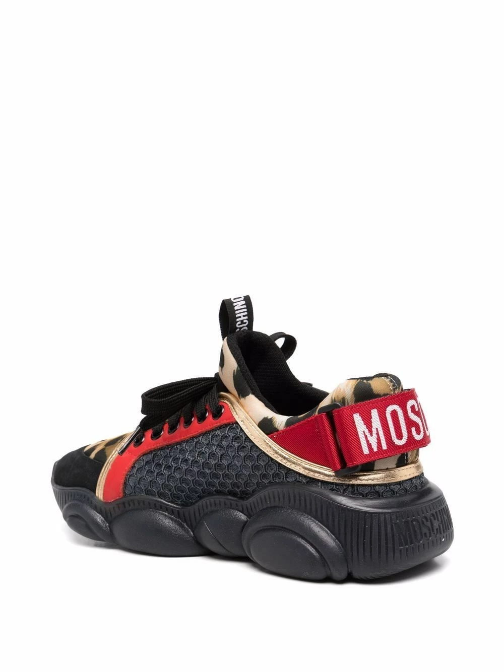Drawing the eye in thanks to the branded Logo Tape rear strap and contrast panelled design, these leopard print sneakers from Moschino are set atop the brand’s signature Teddy Bear rubber outsole ensuring a playful tread wherever you step.