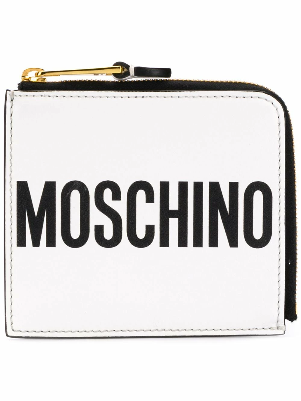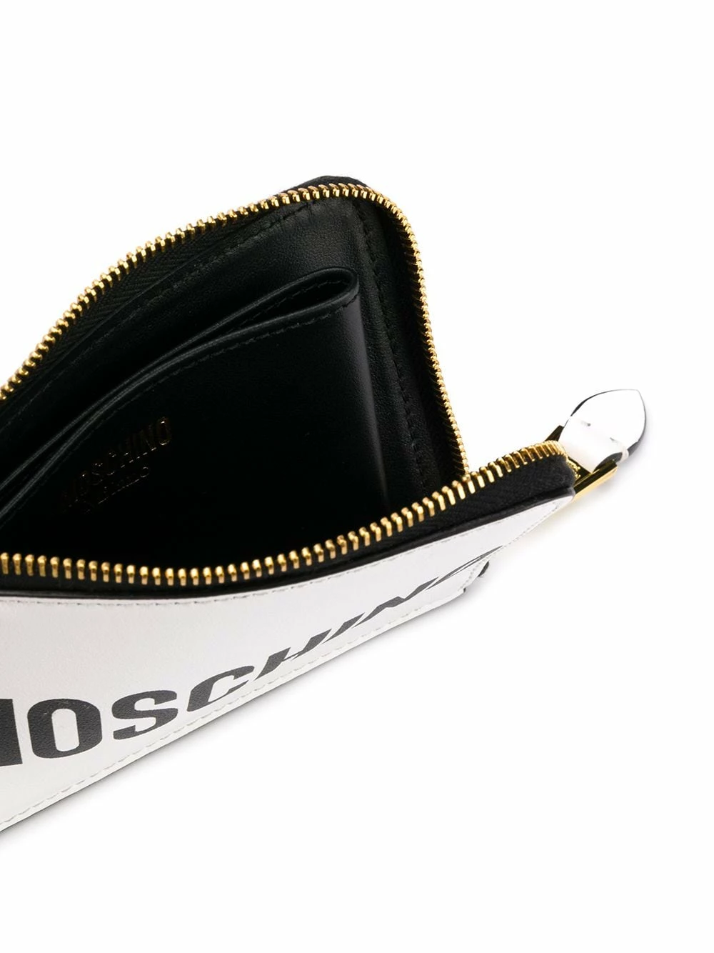 Logo-loving Jeremy Scott ensures his playful spirit and high energy are captured in the Moschino collection. This season is all about being casual, comfortable and cool. This white and black leather logo zipped wallet from Moschino features an all around zip fastening, an internal slip pocket and a printed logo to the front.