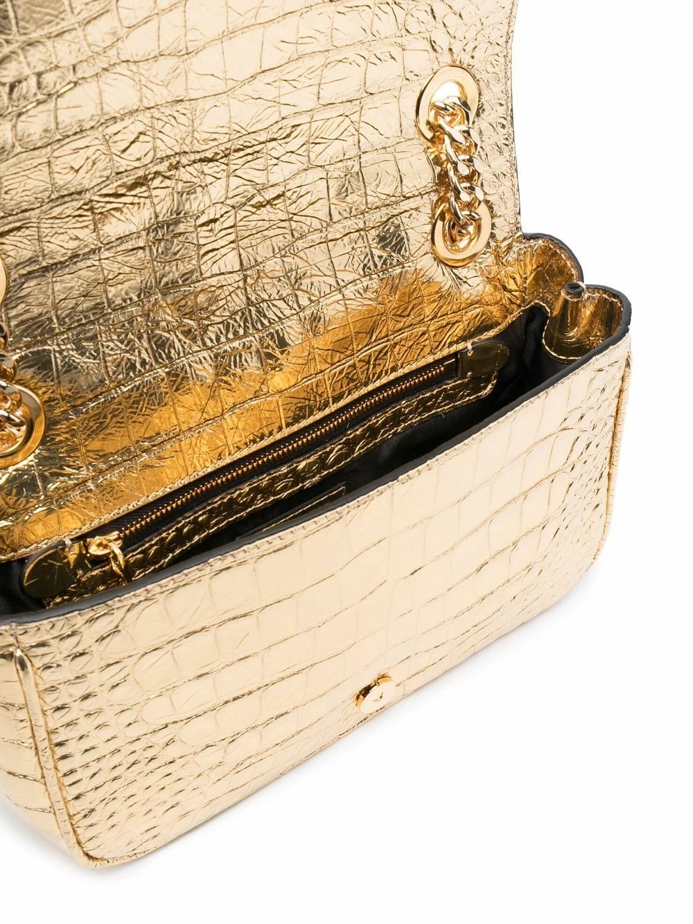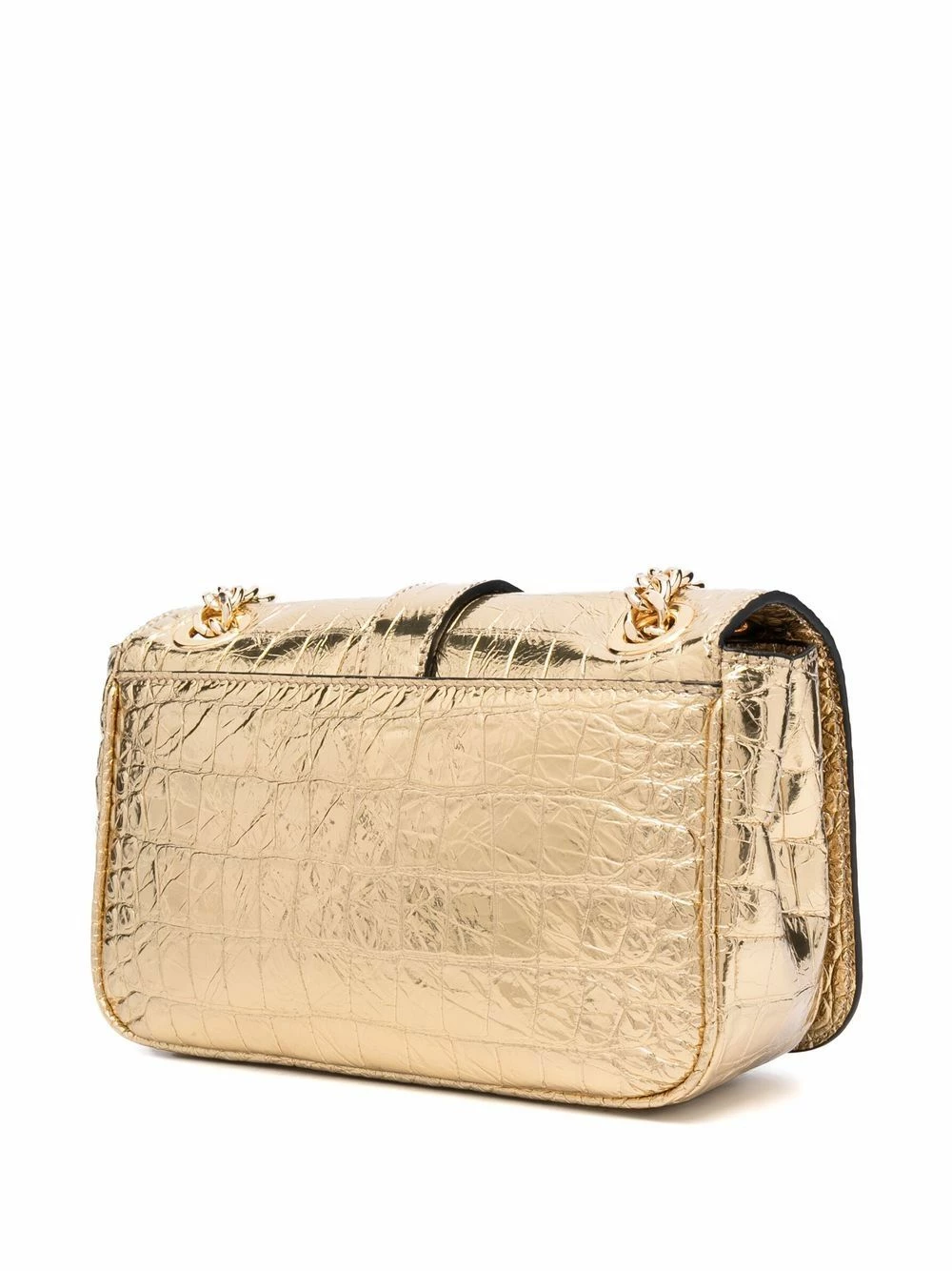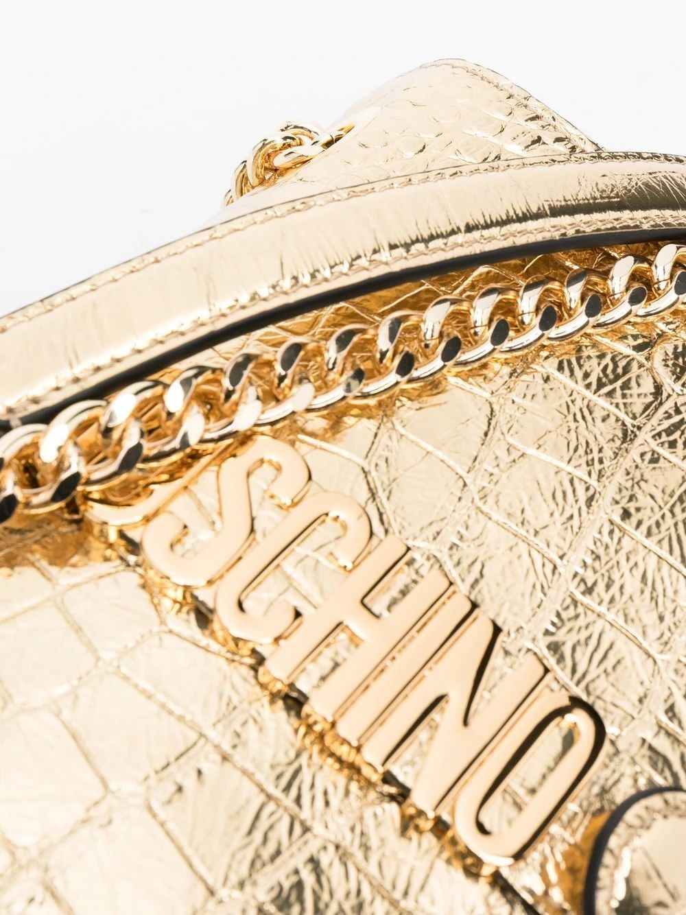 Moschino’s crossbody bag showcases the Italian brand’s penchant for maximalism. Crafted from metallic gold leather, this tactile croc-effect iteration is topped with the brand’s polished logo plaque.