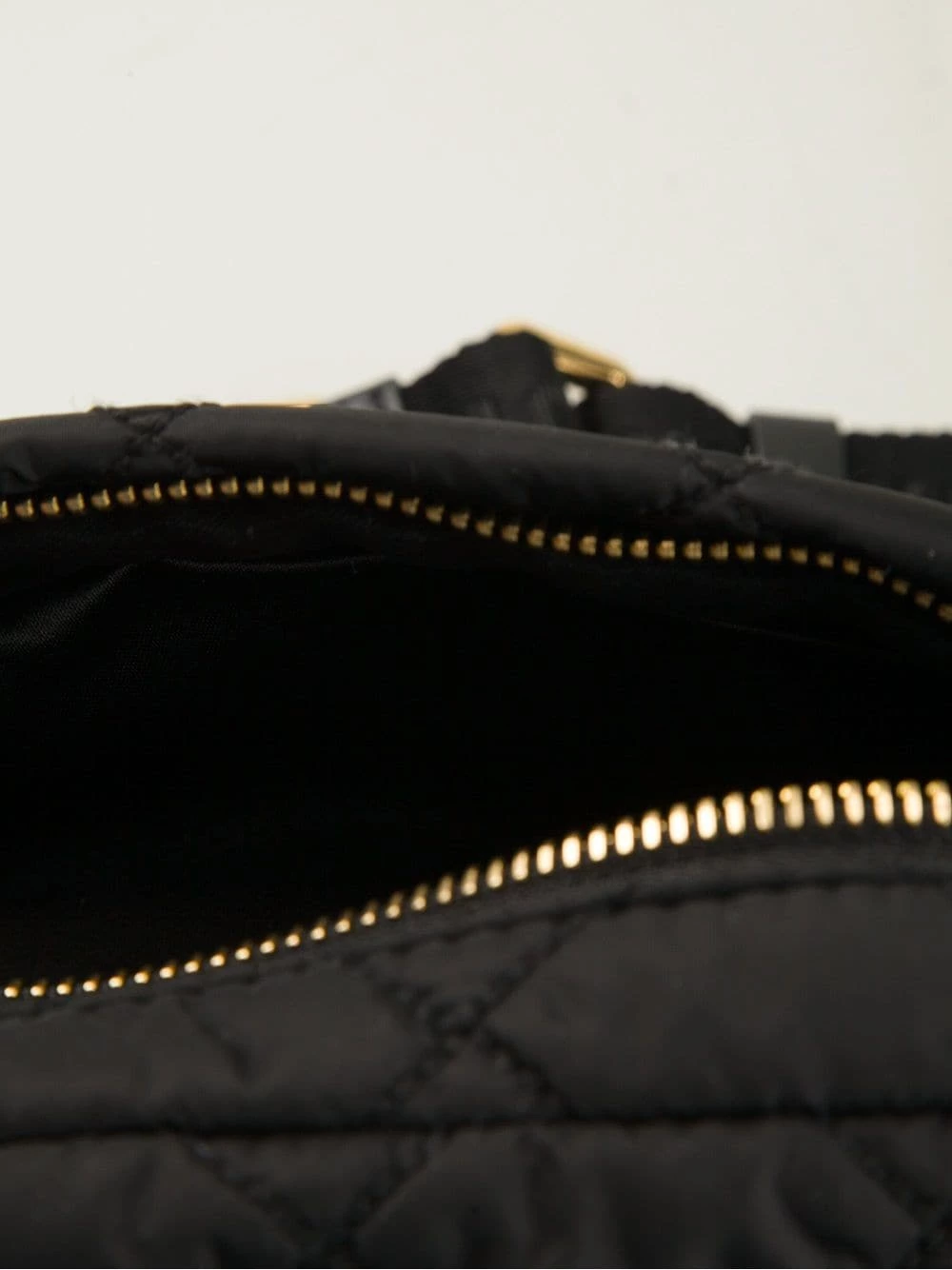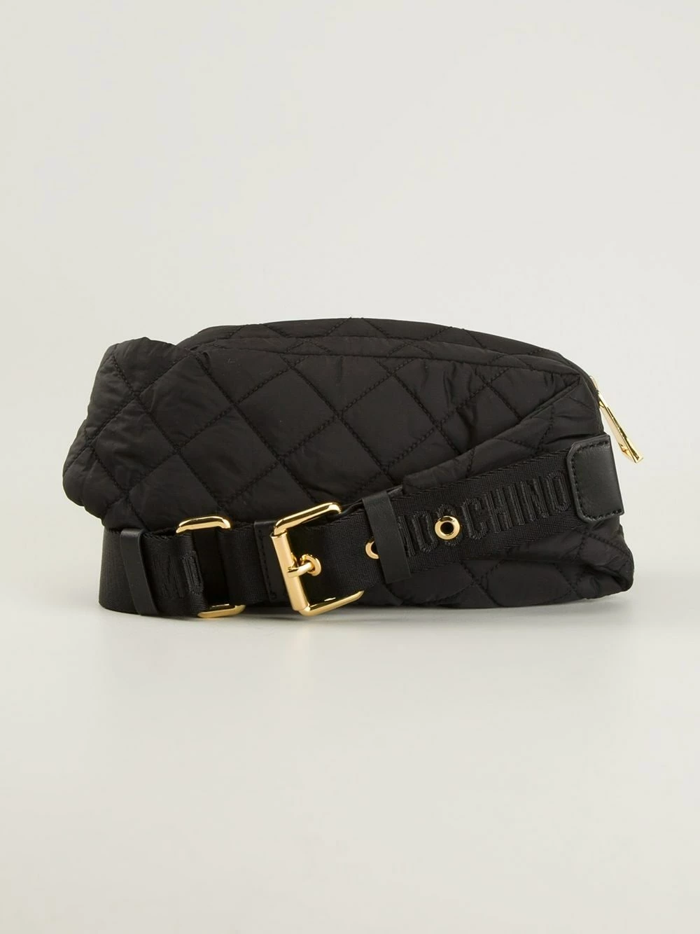 Black quilted bumbag from Moschino featuring a square body, a top zip closure, an adjustable fastening, a front zip pocket and a contrast stitched logo at the front.