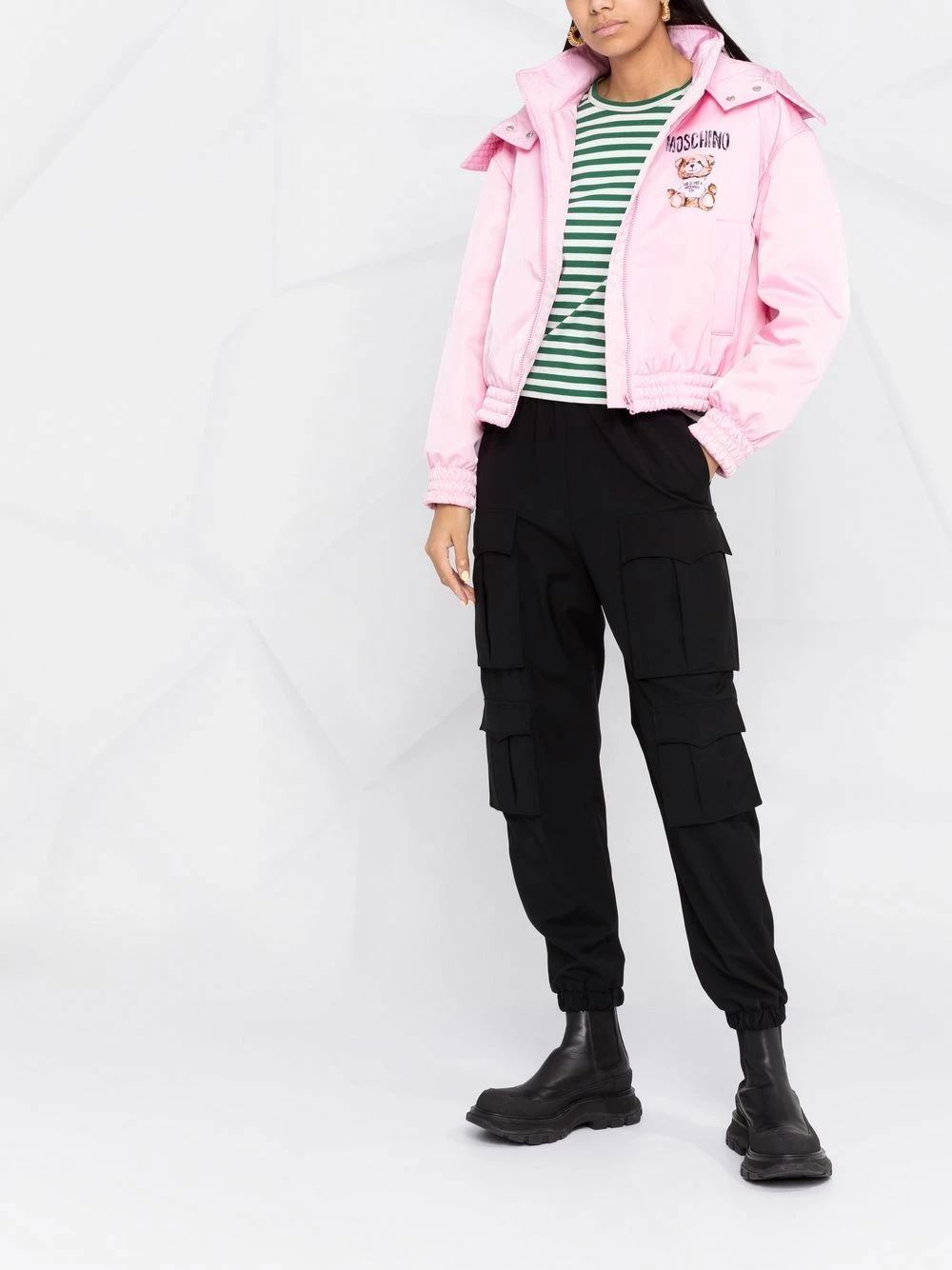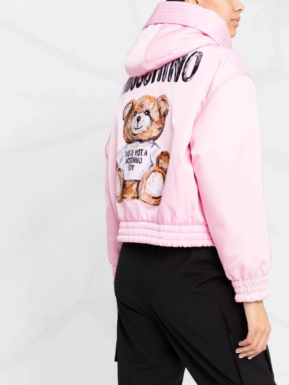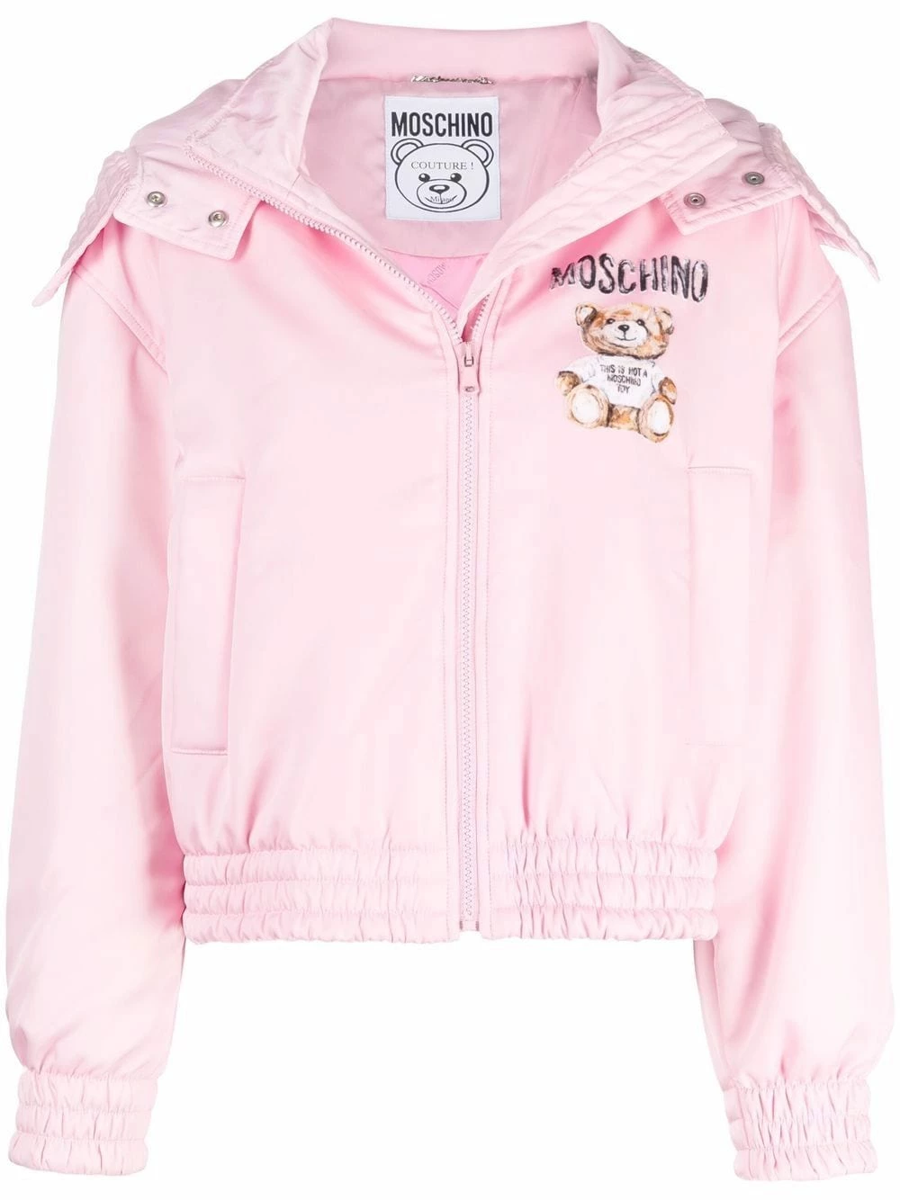 First debuted in 1988 by founder Franco Moschino, the iconic Teddy Bear is used season after season. In this light pink jacket, the brand’s instantly recognisable motif is seen printed on the chest and the rear. The elasticated cuffs and the detachable hood add a functional twist to this layering piece.