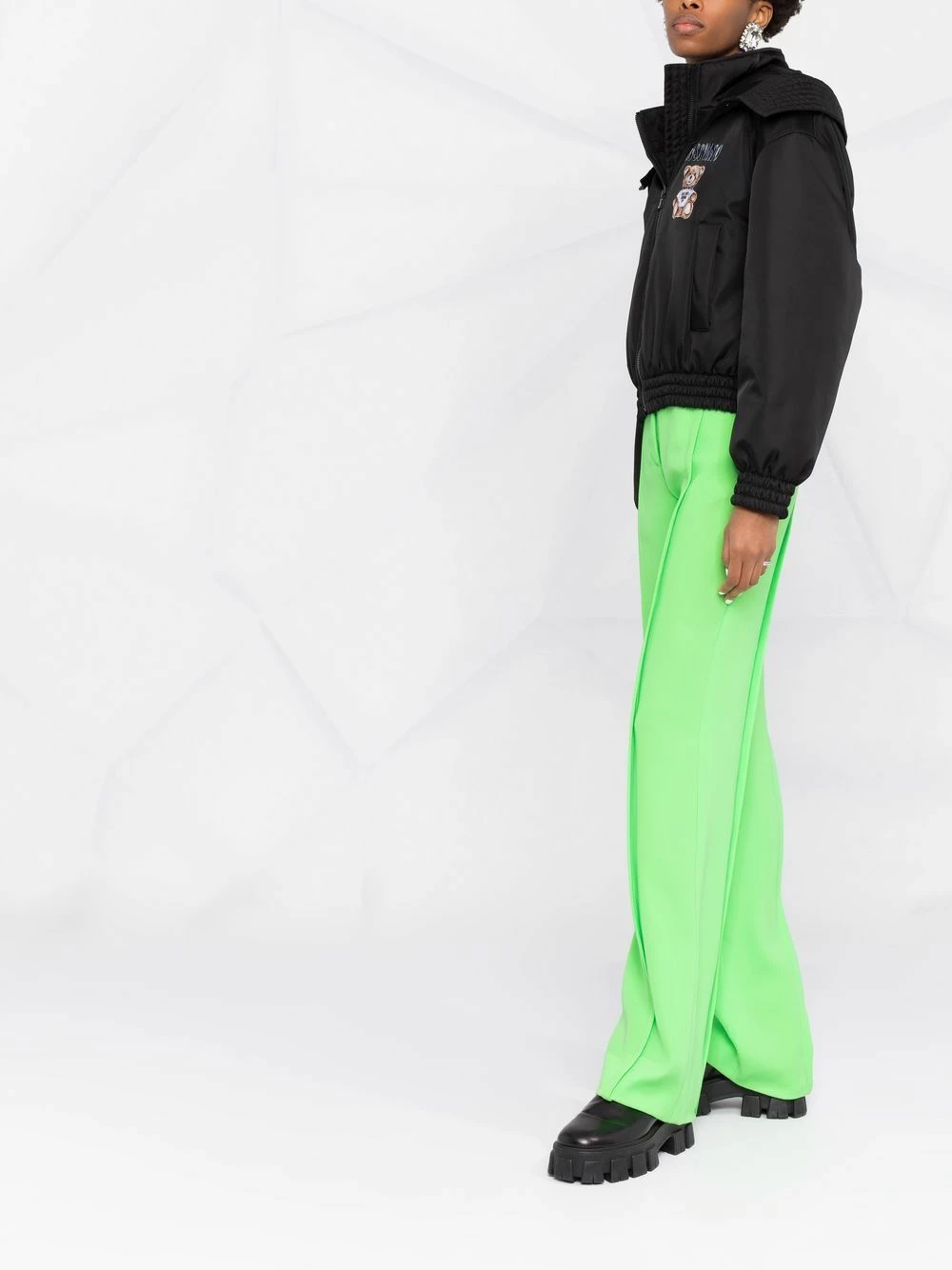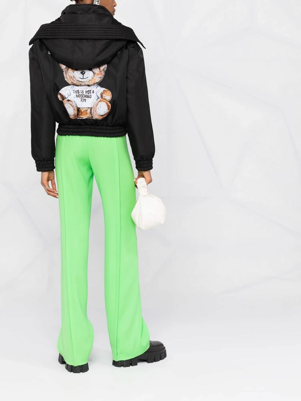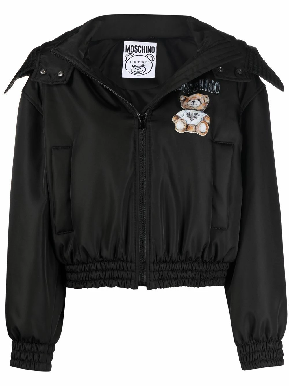 Moschino’s tongue-in-cheek spirit is exemplified by this black jacket. The hooded design is printed with the signature Teddy Bear motif at the chest and on the rear.