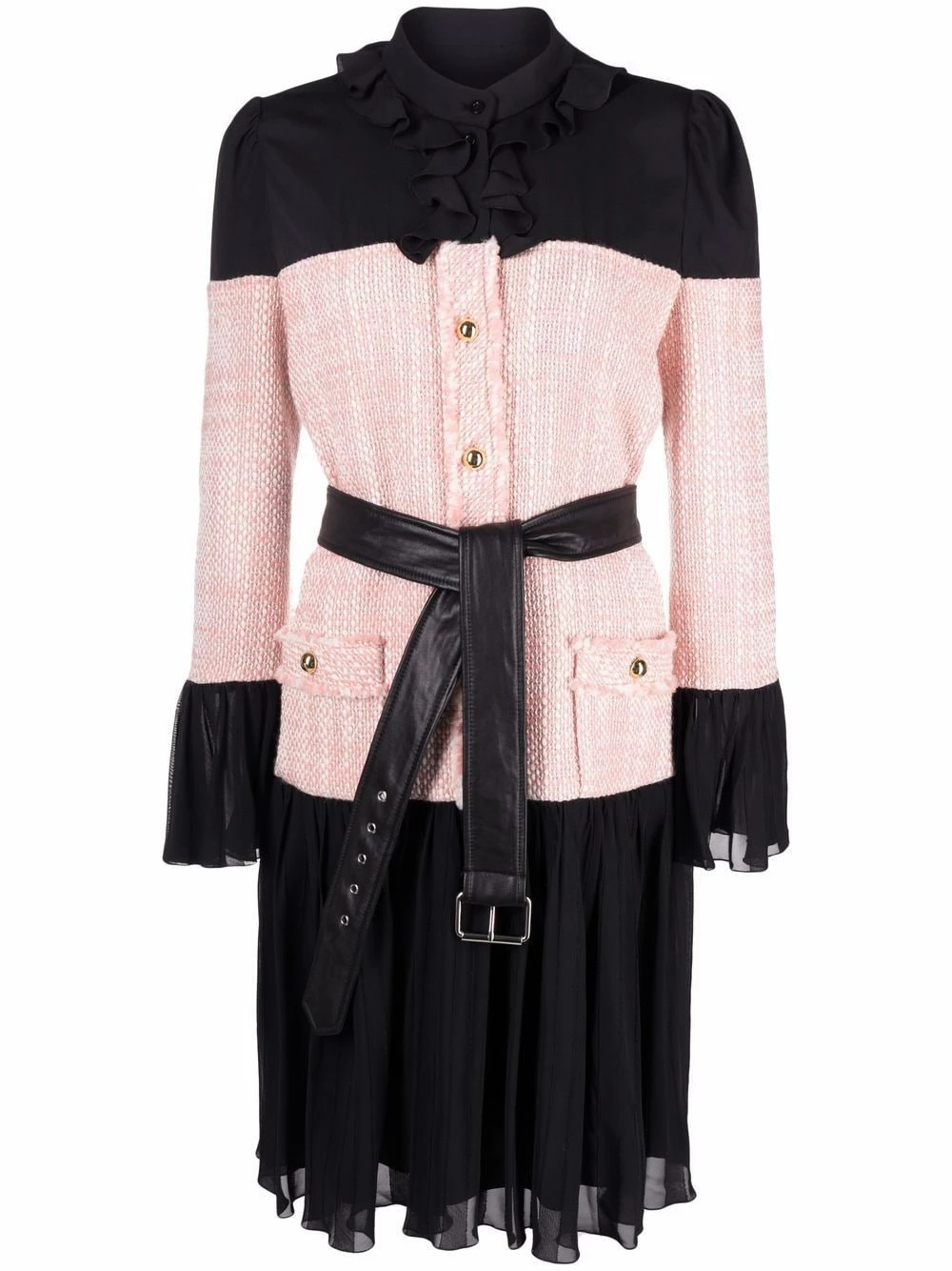 An LDB with a twist. In a two-tone design, this shirtdress features a belted waist for an edgier touch. Go Moschino or go home.