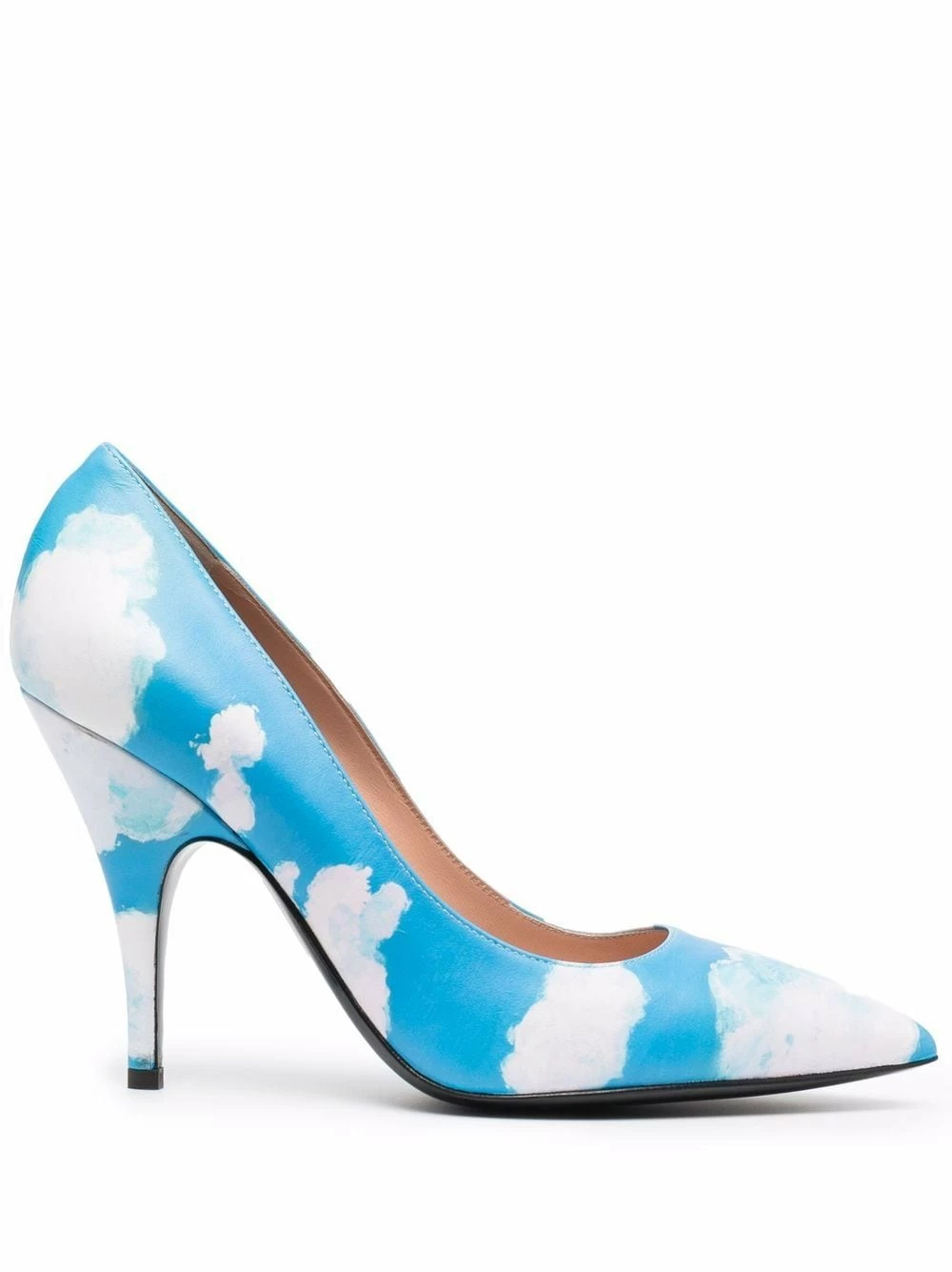 In the brand’s classic audacious fashion, Moschino presents these leather pumps. Adorned with a blue and white cloud print, this pair captures the spirit of a label that refuses to blend in.