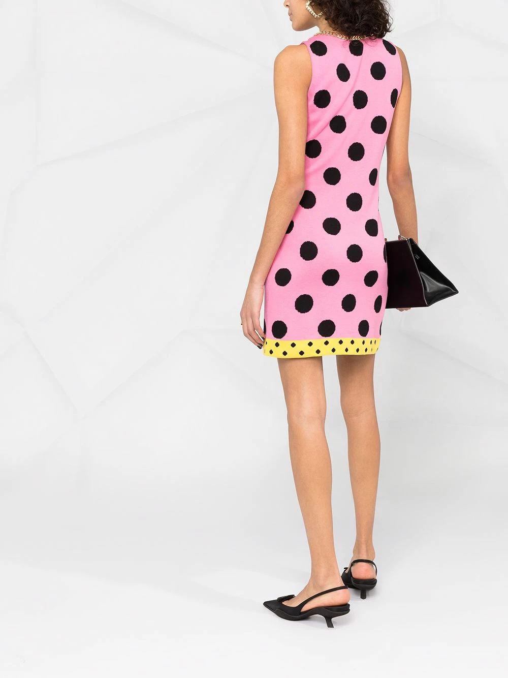 No bad mood can resist the joy of polka dots. Moschino’s dress is punctuated with chain-link detailing and the brand’s bold logo plaque at the neck. Pretty in pink.