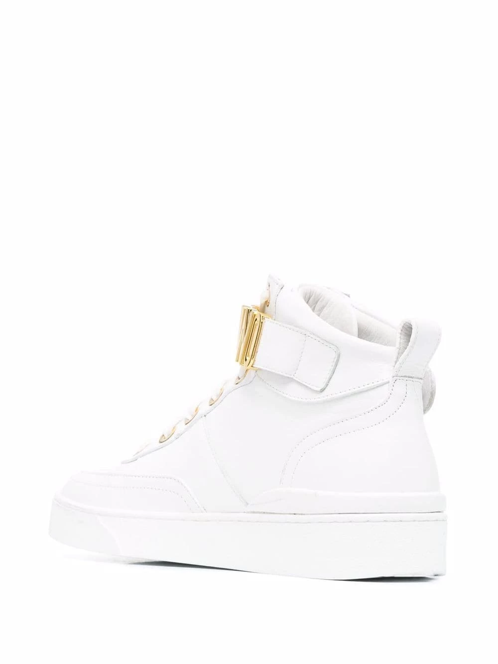 These sleek white calf leather sneakers from Moschino AW21 are punctuated by the brand’s signature gold-tone logo lettering at the ankle. Designed to be detachable thanks to a buckle fastening ankle strap, this lace-up pair are a versatile choice for the new season.