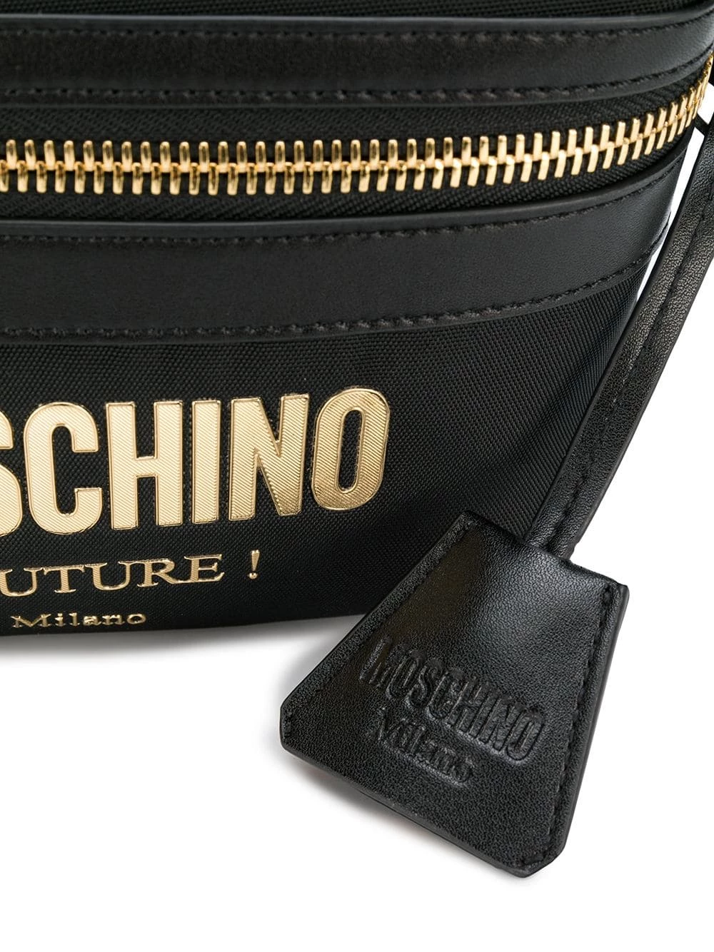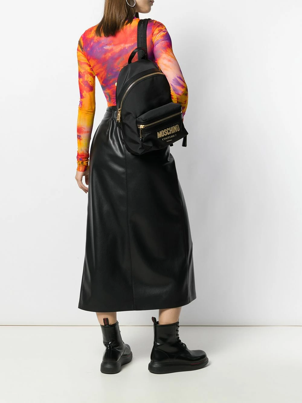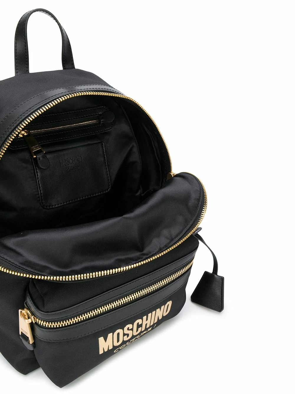 Moschino is known for its playful, subversive and nostalgic aesthetic. Inspired by pop culture, the Italian labelโs collections are defined by their provocative approach iconography and tongue-in-cheek sensibility. This black logo plaque backpack from Moschino features a round top handle, adjustable shoulder straps, a top zip fastening, a gold-tone logo plaque and a front zip pocket.