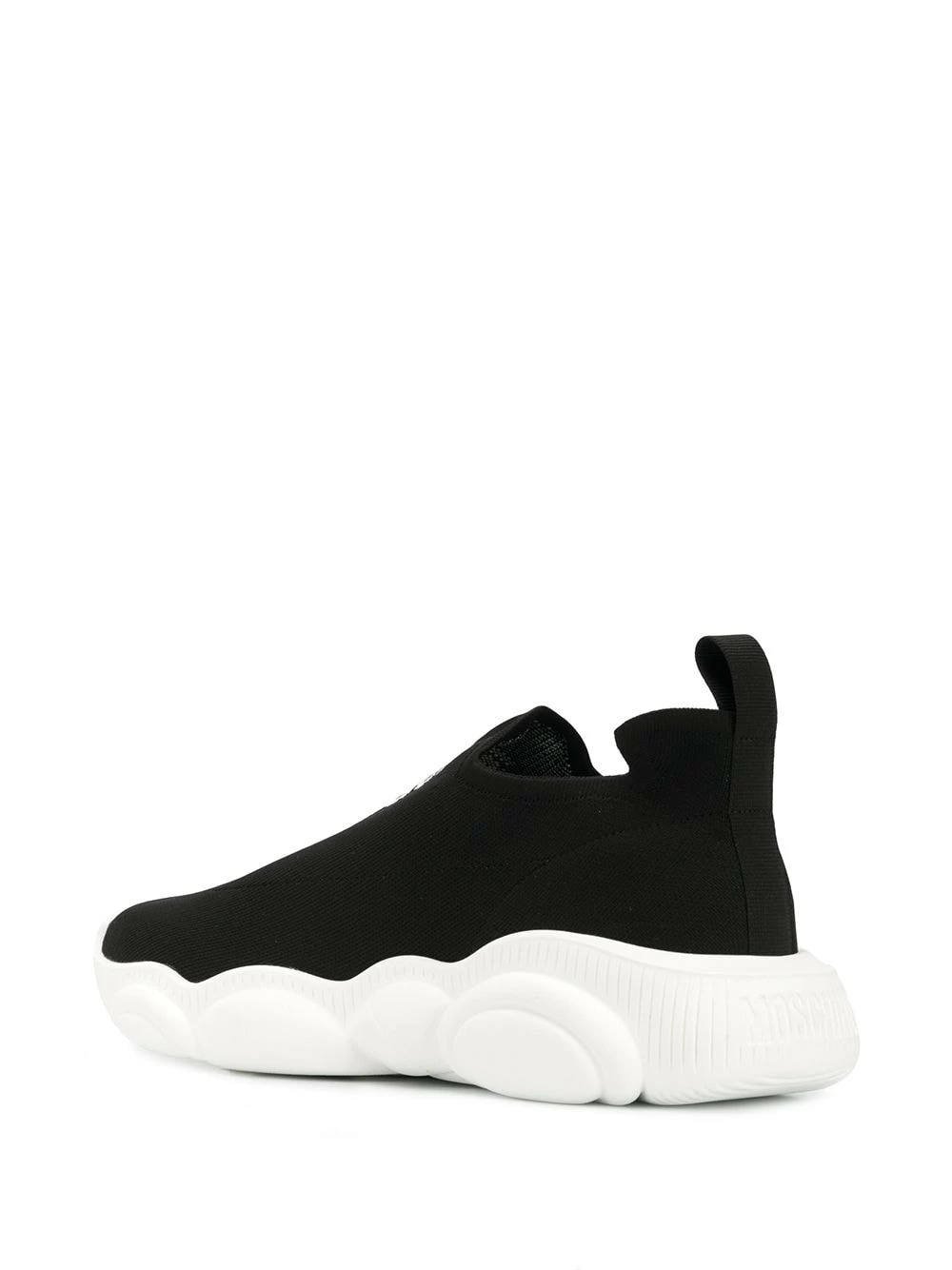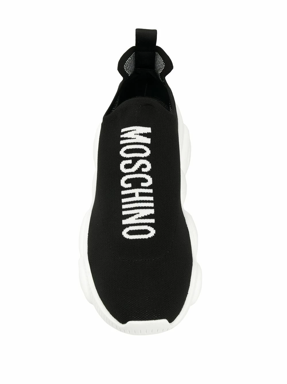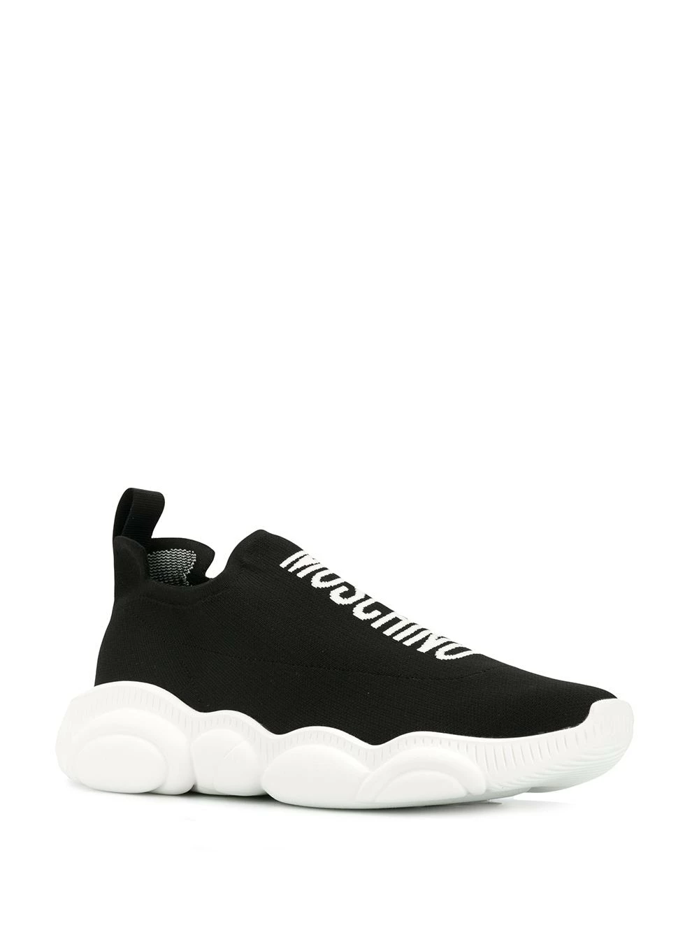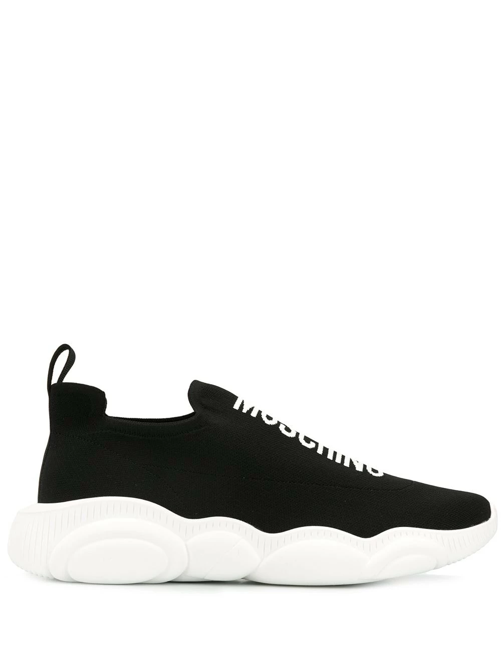The Moschino collection has built a reputation on a youthful aesthetic that doesn’t take itself too seriously. These black and white logo slip-on sneakers are crafted from leather and feature a round toe, a flat rubber sole, a pull tab at the rear and a front logo detail.