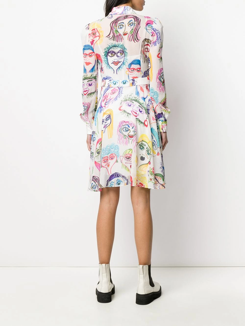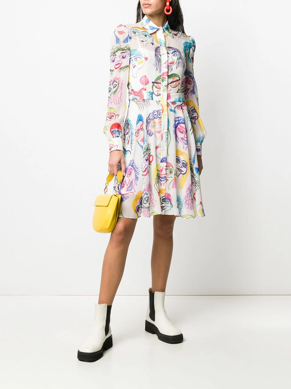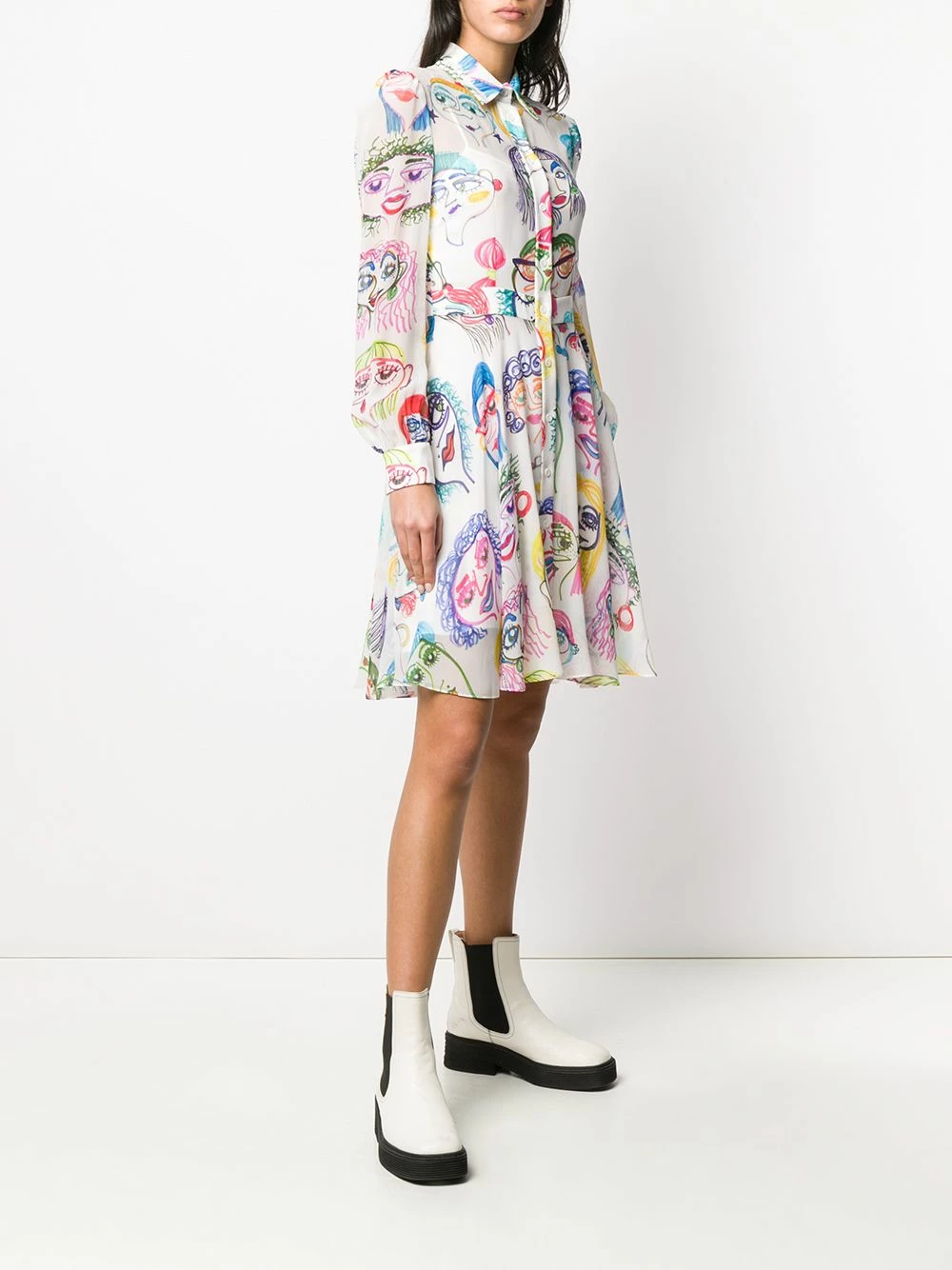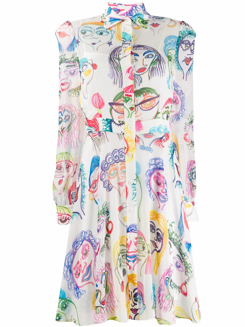 What is art? Ever the artist that Moschino is, this white dress is covered entirely in portrait doodle prints we like to think by Jeremy Scott himself. Featuring a classic collar, a front button fastening, long sleeves, button cuffs and an a-line shape skirt.