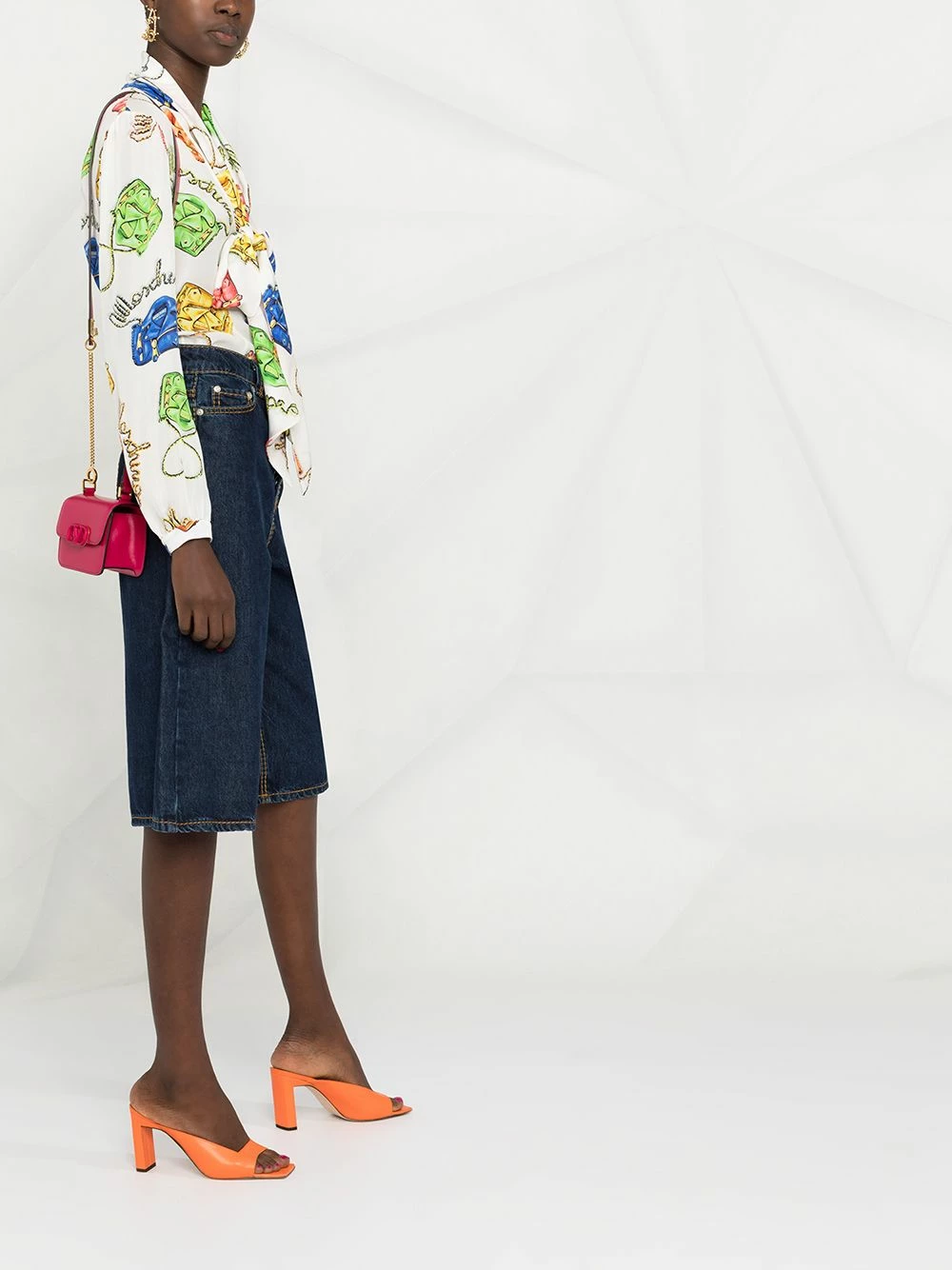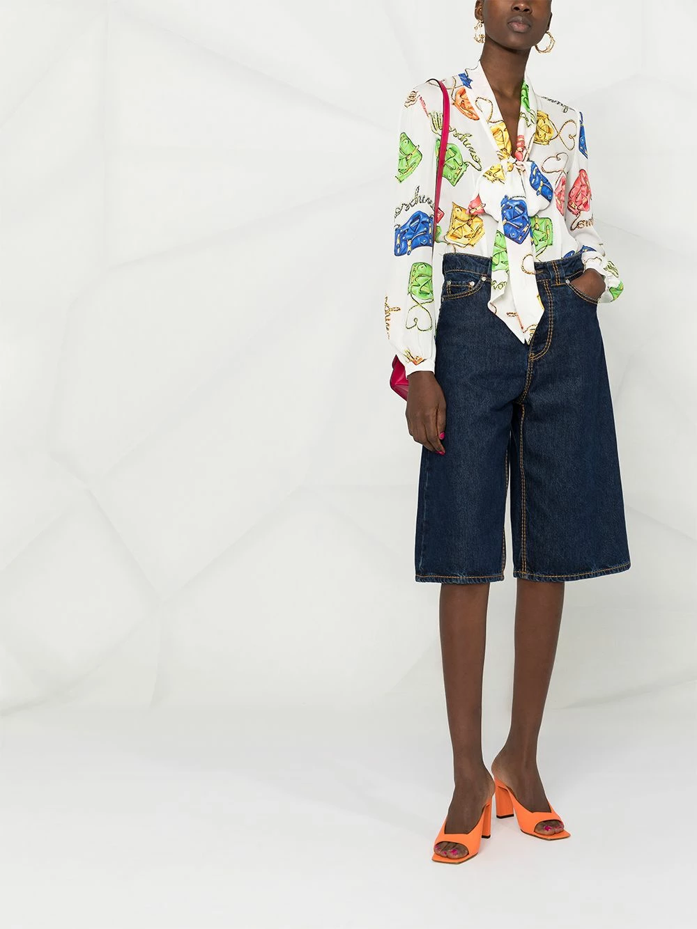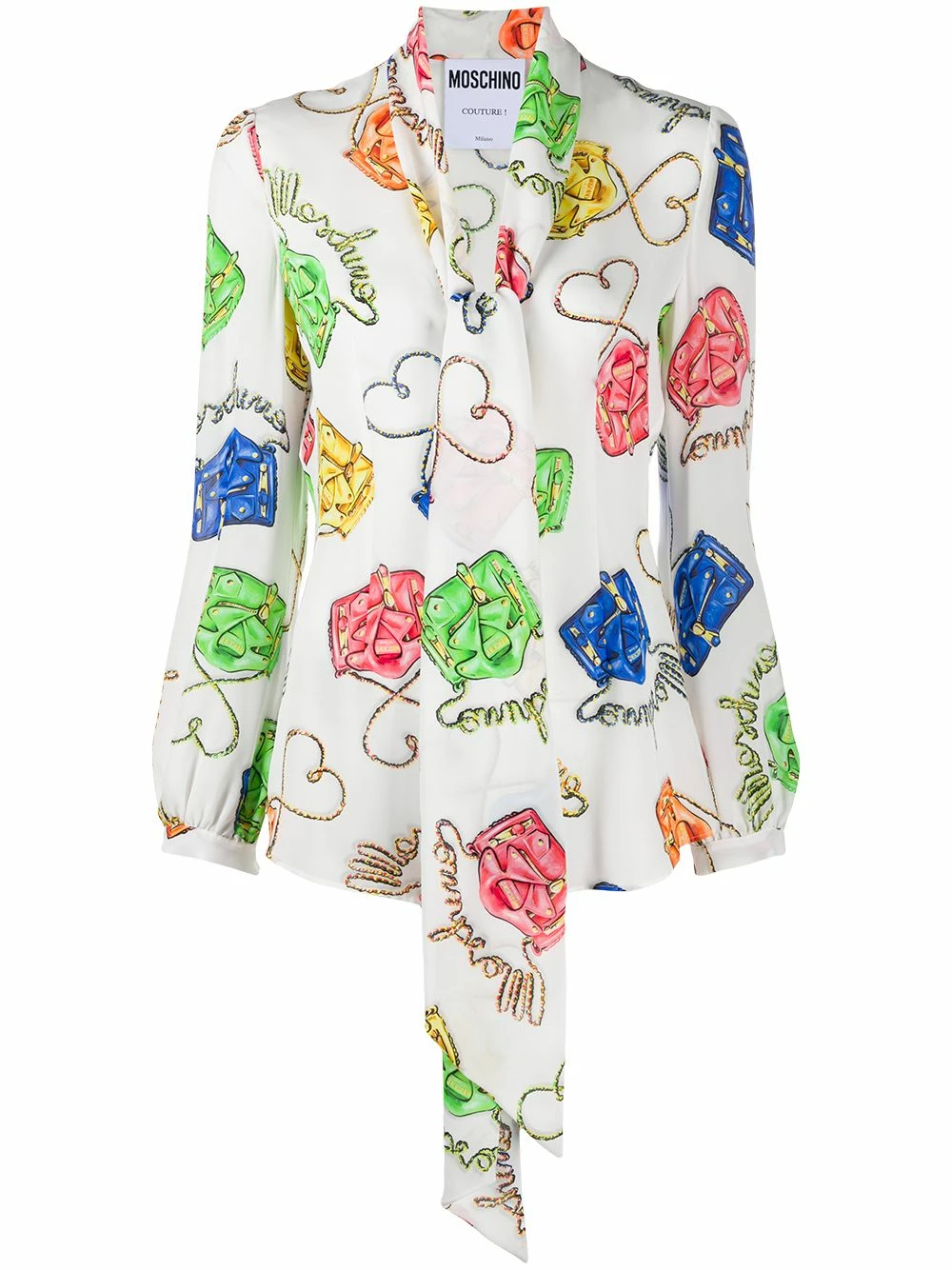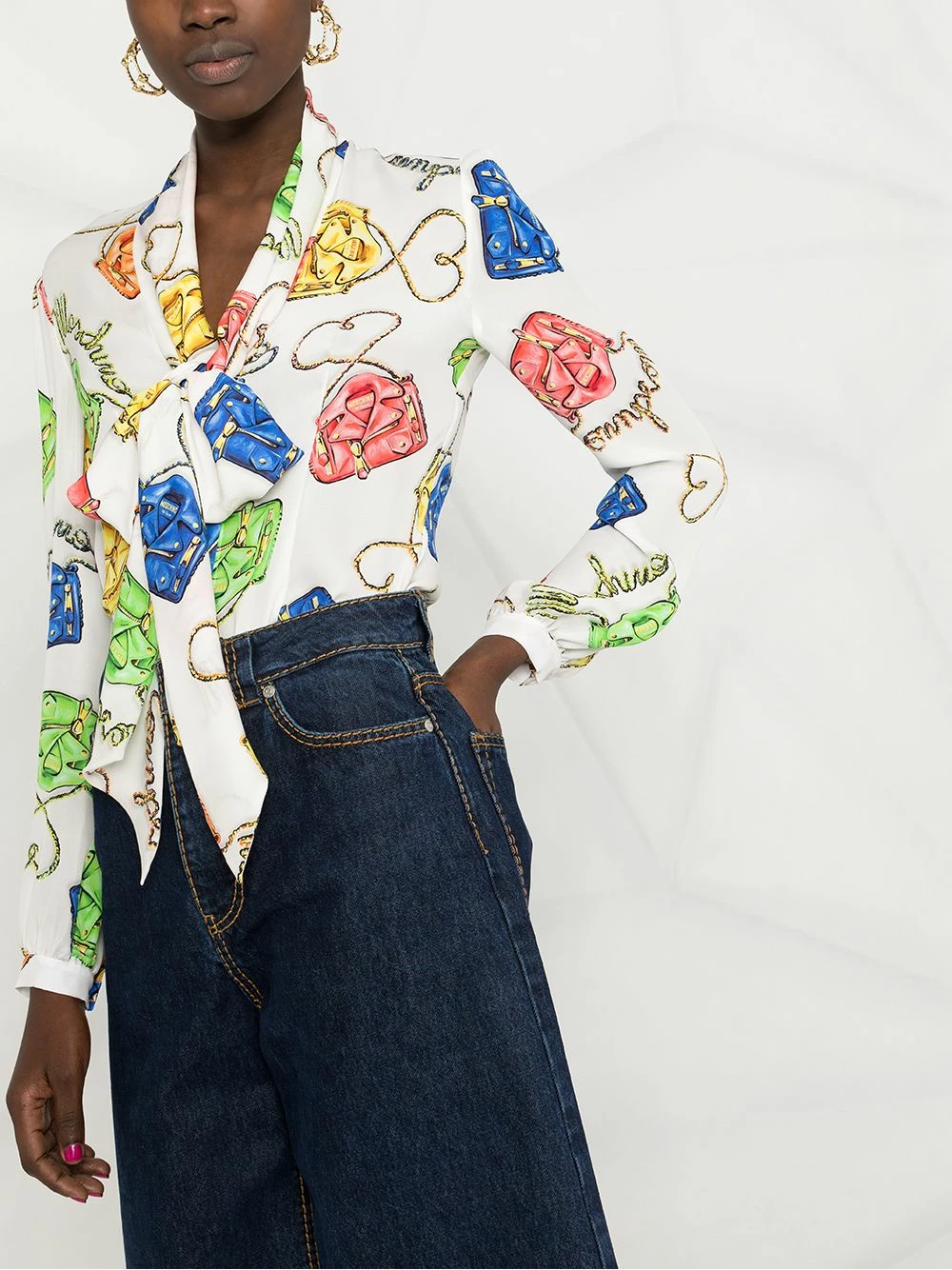 Moschino mad? Spread the Moschino-love, even at the office in this silk blouse printed with the Italian fashion house’s signature biker jacket bag and decorated with a pussybow fastening. Workwear need’nt be boring.ย