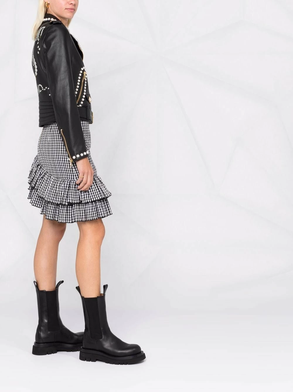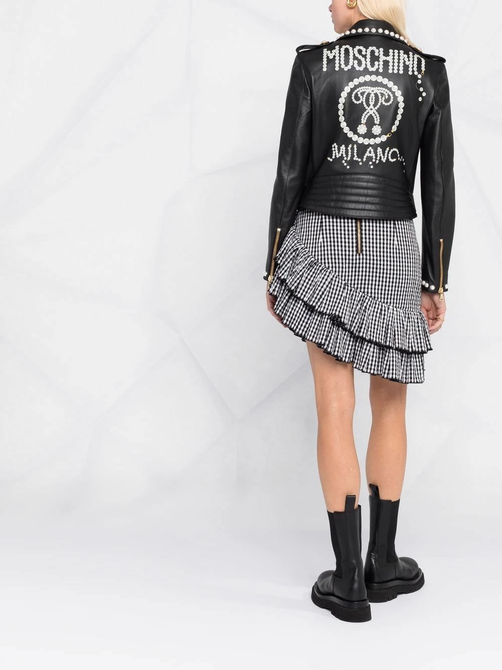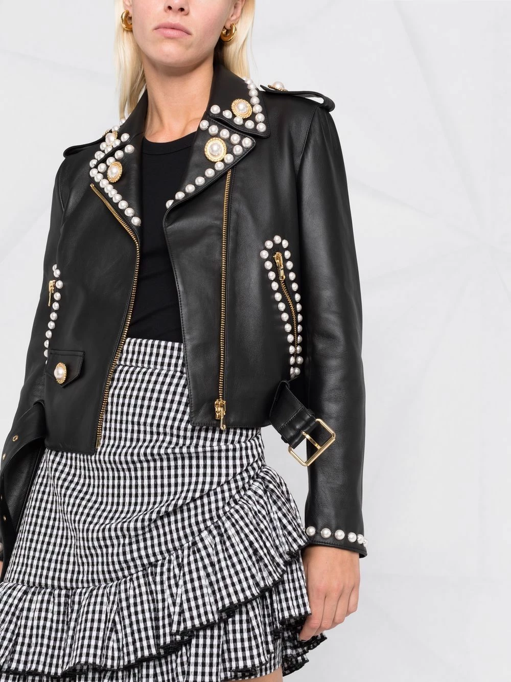 Moschino’s signature Double Question Mark logo is presented in a pearl print to the back of this cropped sheepskin leather biker jacket for AW21. Detailed with faux-pearl embellishments and gold-tone hardware, this casual silhouette boasts an off-centre front zip closure and side zip pockets.