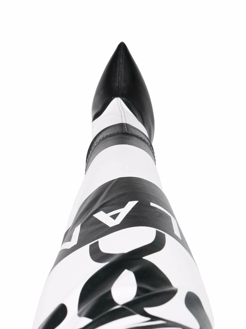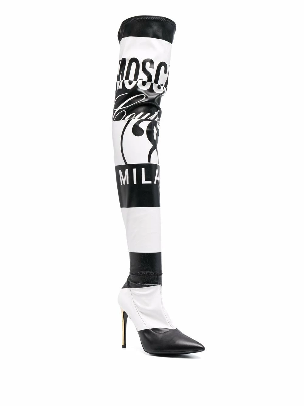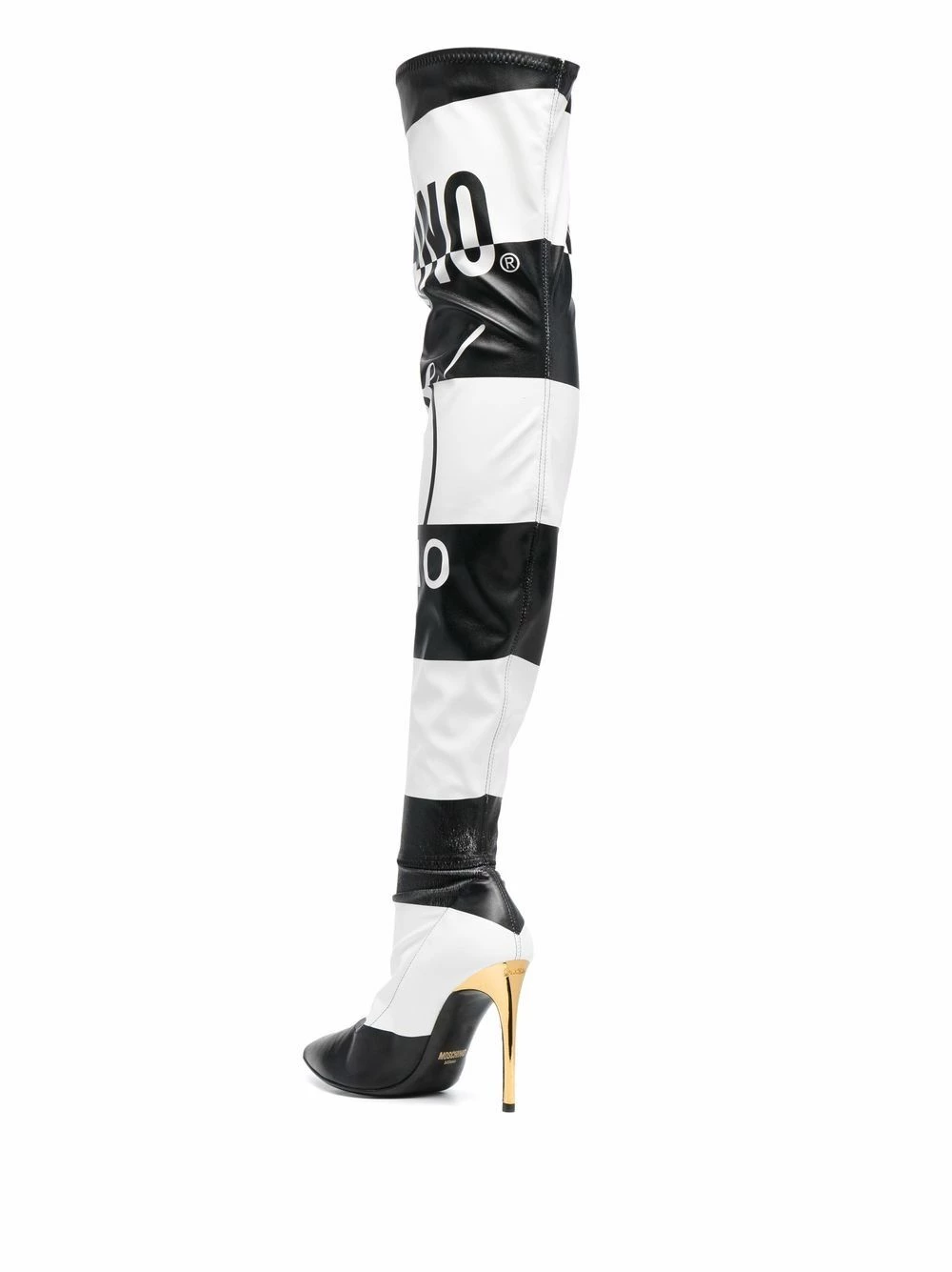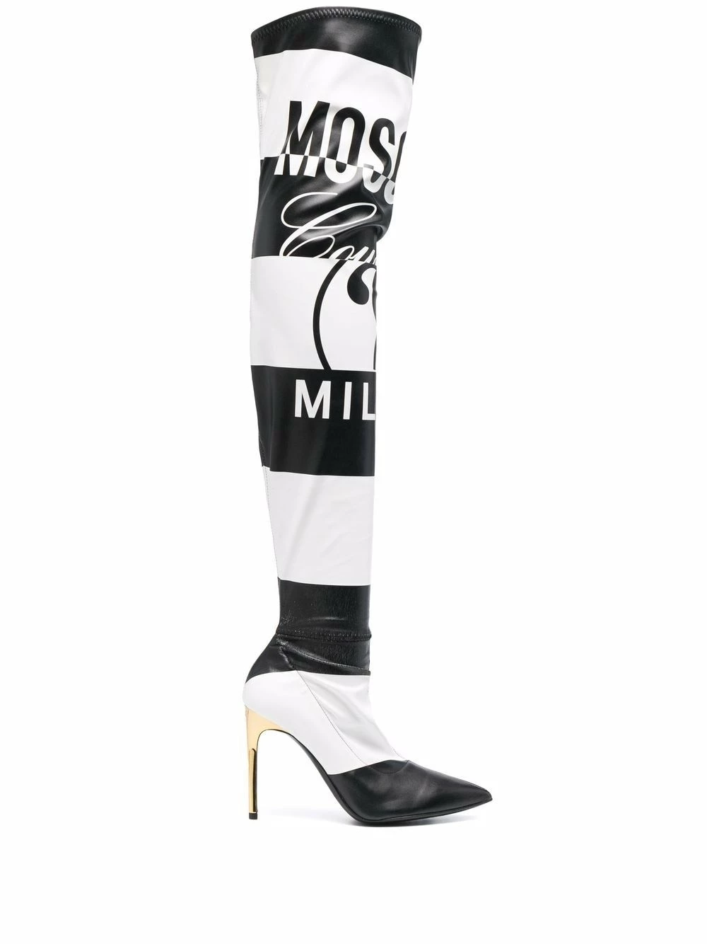 Playful label Moschino presents these thigh-high stiletto boots as part of their AW21 collection. Designed in a striking black and white hue, these leather boots feature the brand’s signature Double Question Mark logo print to the front alongside a bold horizontal stripe print.