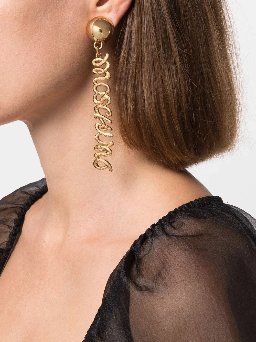 Moschino is known for its statement designs and this pair is no exception. Crafted from gold-tone metal, these shiny drop earrings with their large logo are striking.