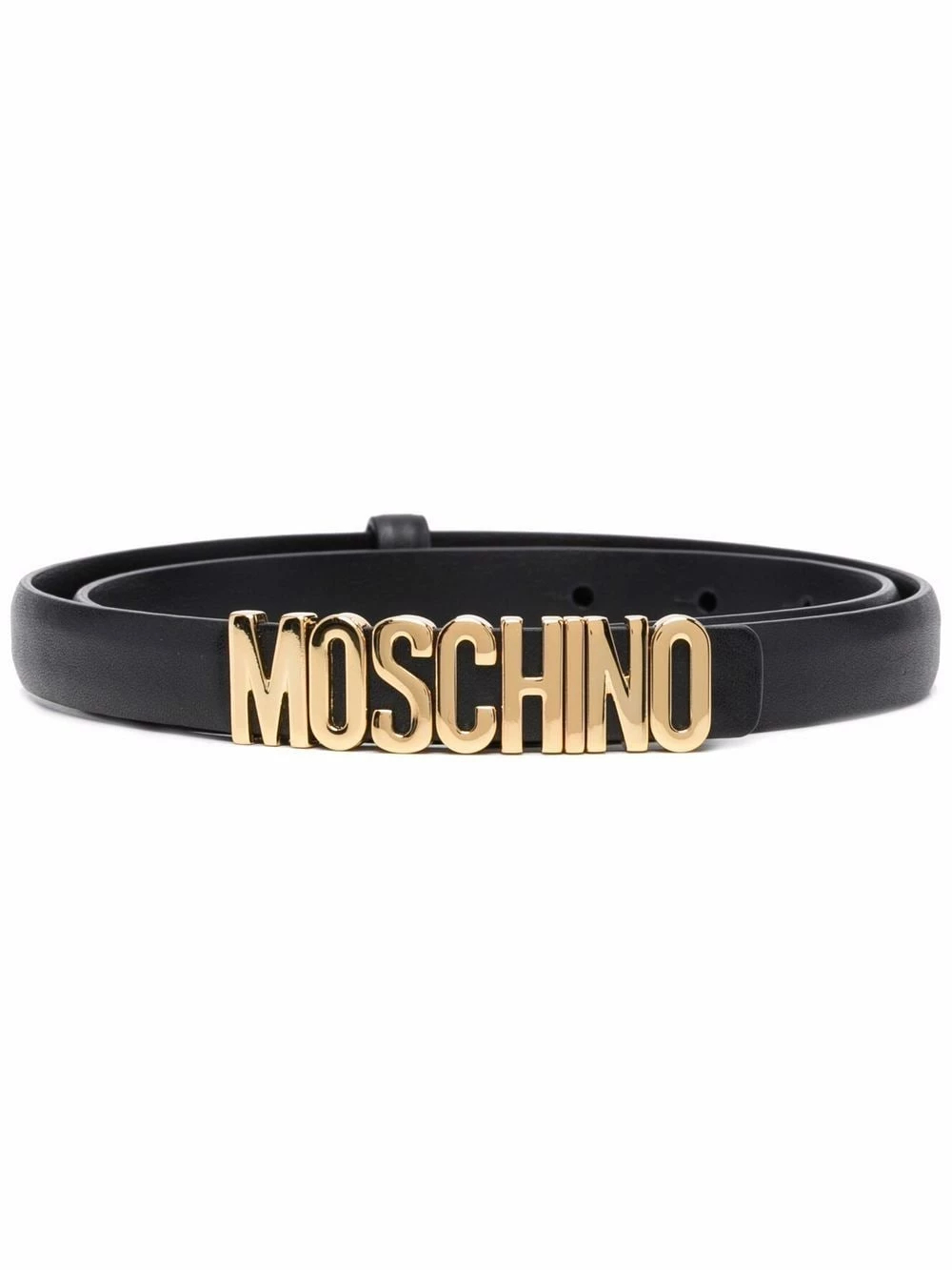Black leather logo-lettering leather belt from MOSCHINO featuring gold-tone logo lettering, punch-hole detailing and press-stud fastening.