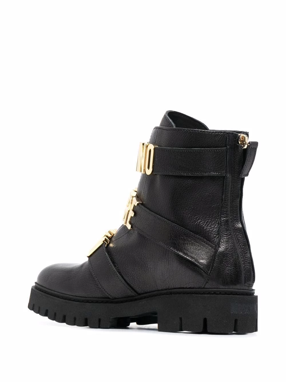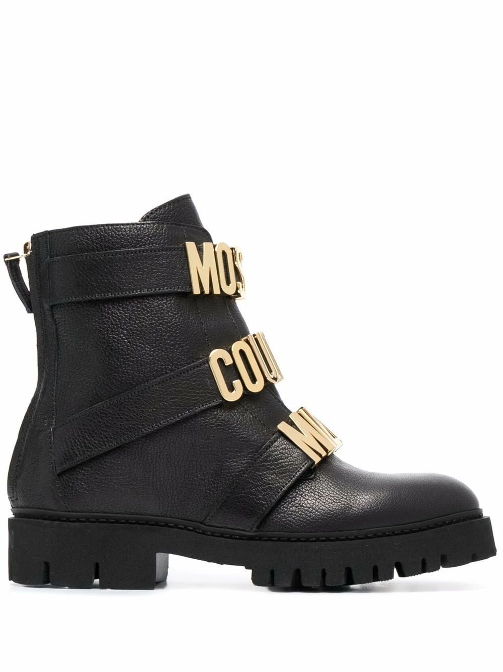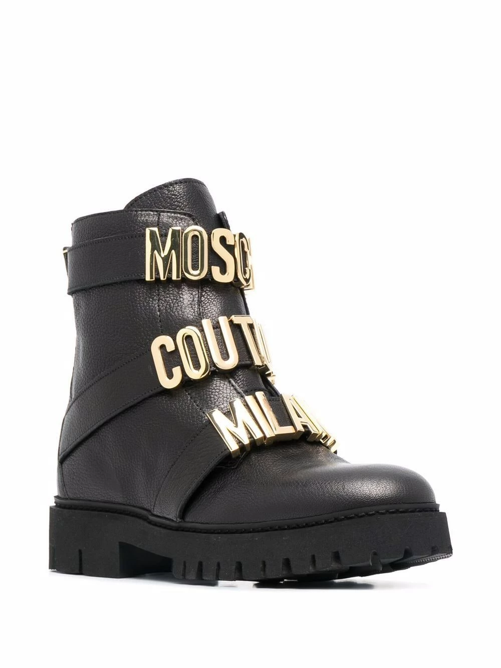 A champion in vibrant colour palettes and playful prints, Moschino takes a step back to present these chunky leather boots. Detailed with gold-tone logo letter charms, the ankle-high silhouette still carries a distinct Moschino edge.
