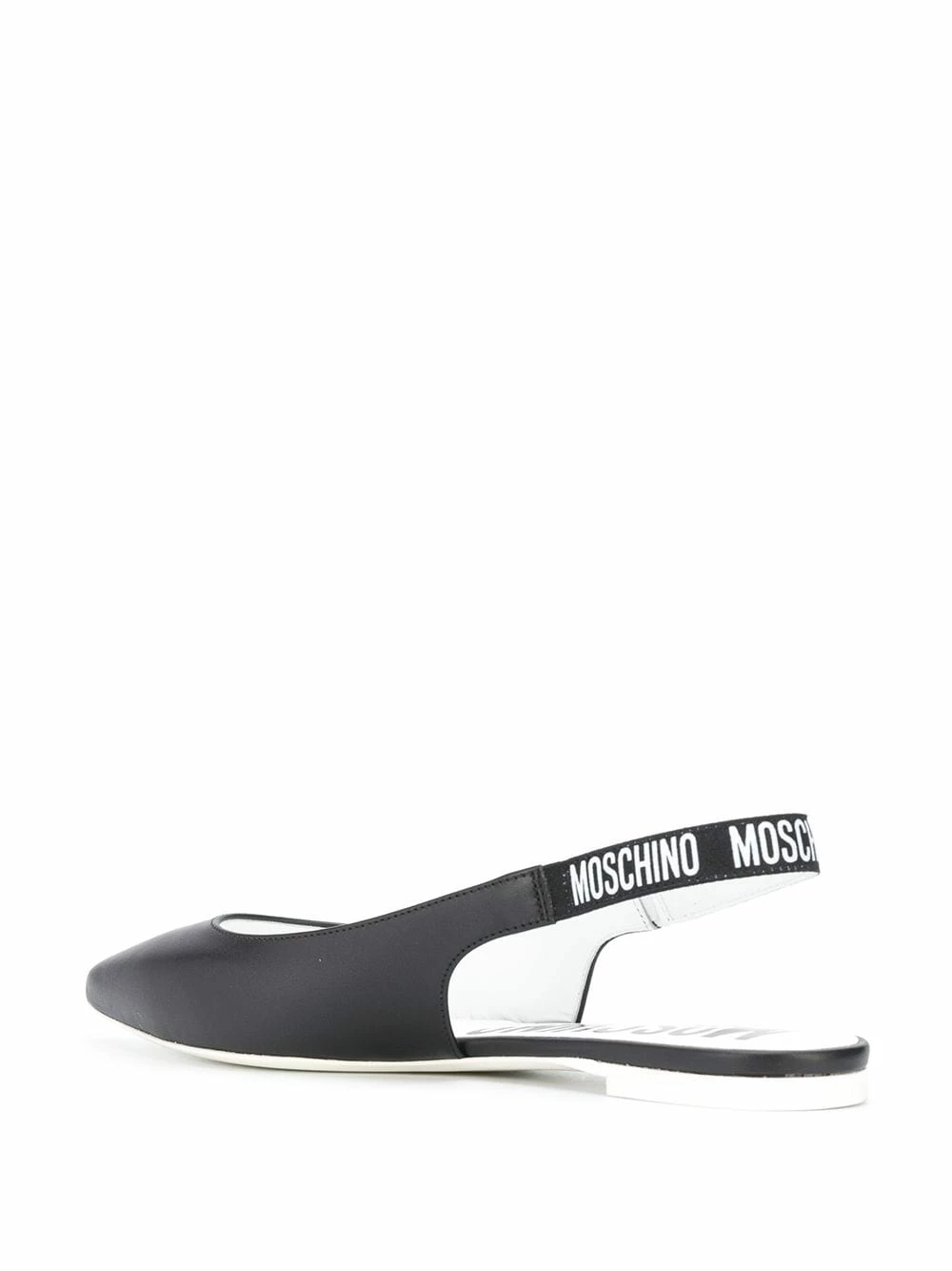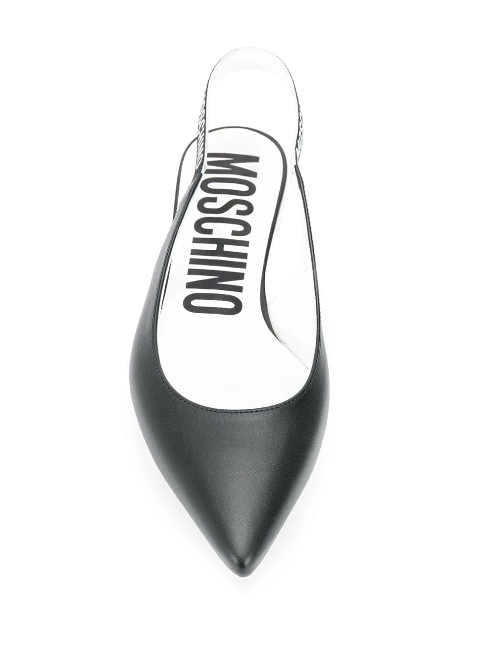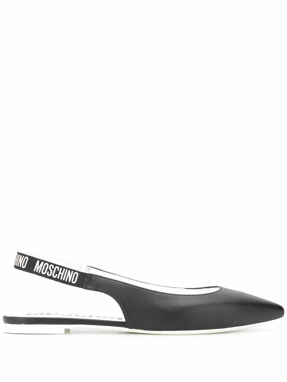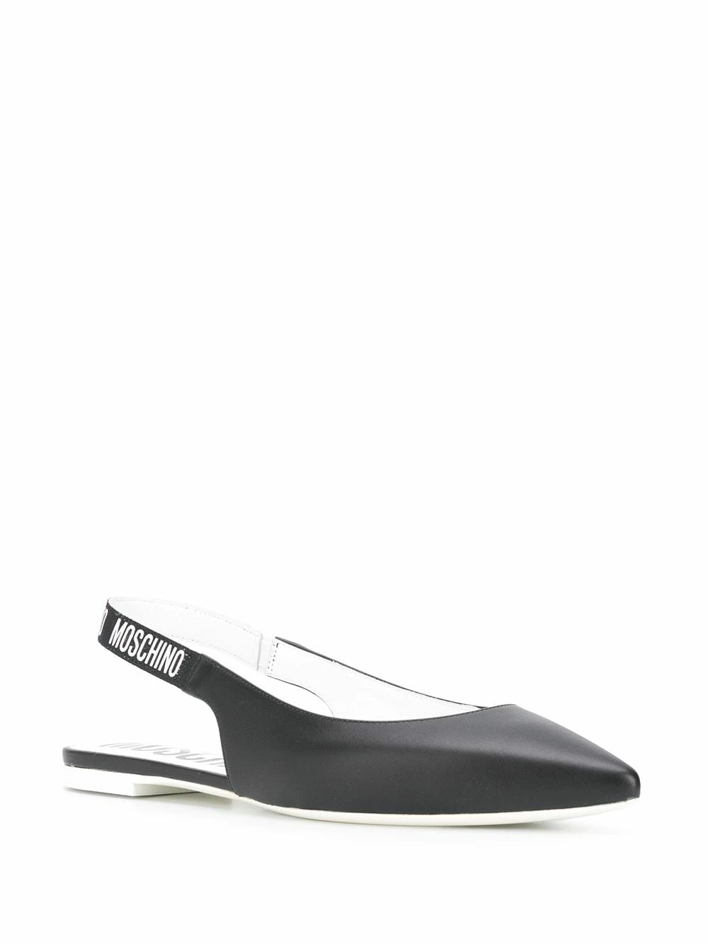 Allow us to point you in the right direction, towards these black leather ballerina shoes from Moschino! Designed with an elegant pointed toe, they have logo-embellished slingback straps. A minimalist take on logomania.