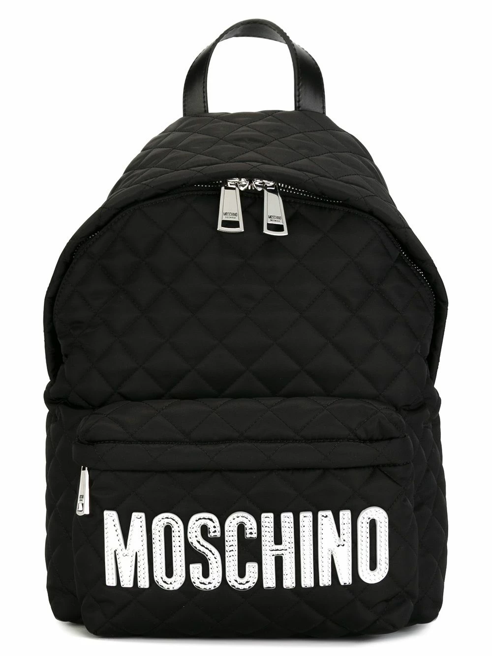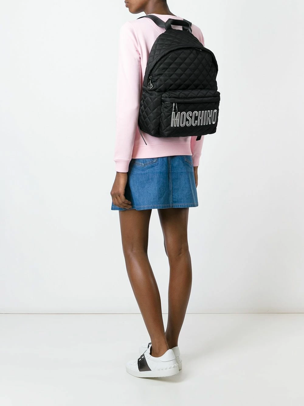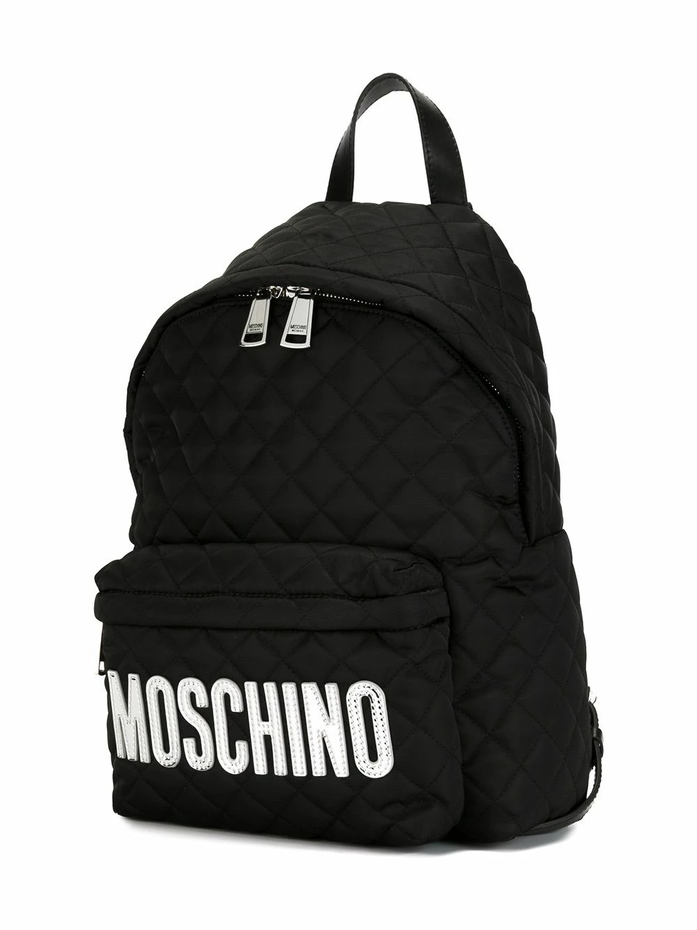 Black quilted backpack from Moschino featuring a two way zip fastening, a front logo plaque, stitching details, a front zip pocket, a top handle, adjustable shoulder straps, an internal zipped pocket and an internal logo patch.