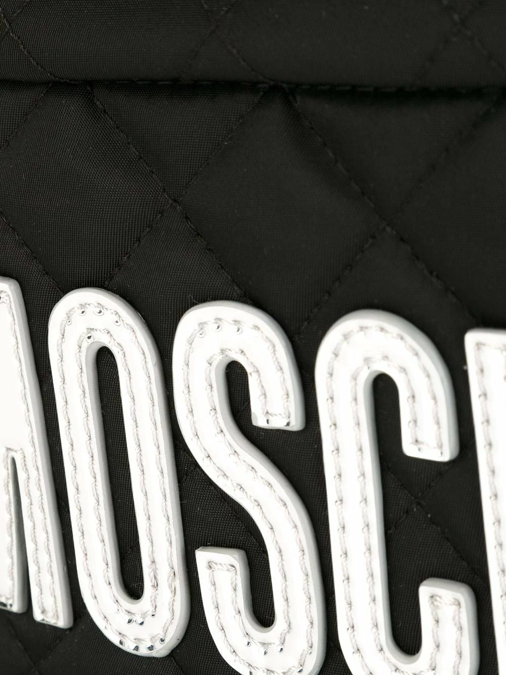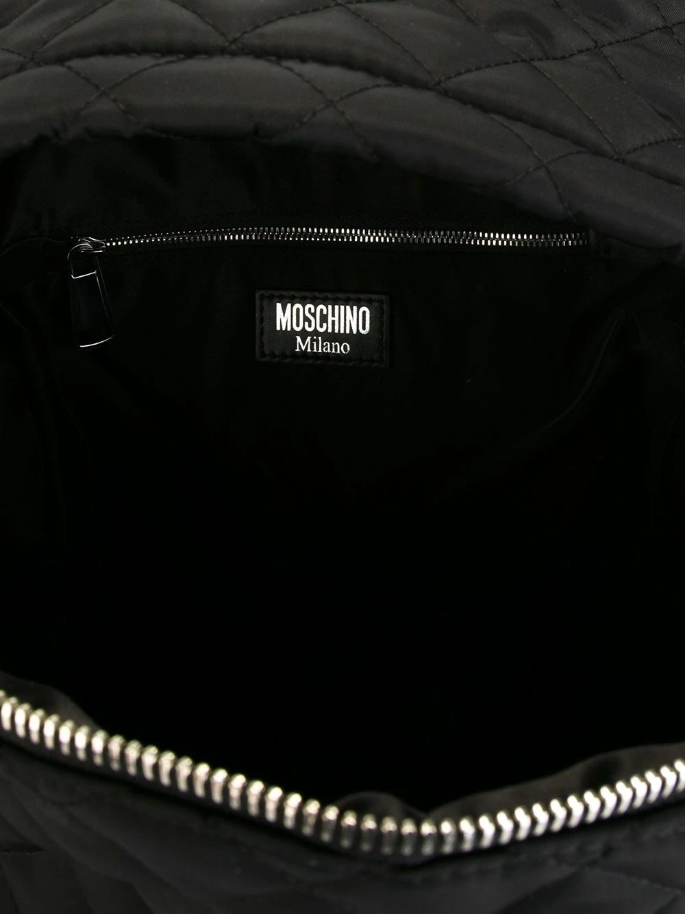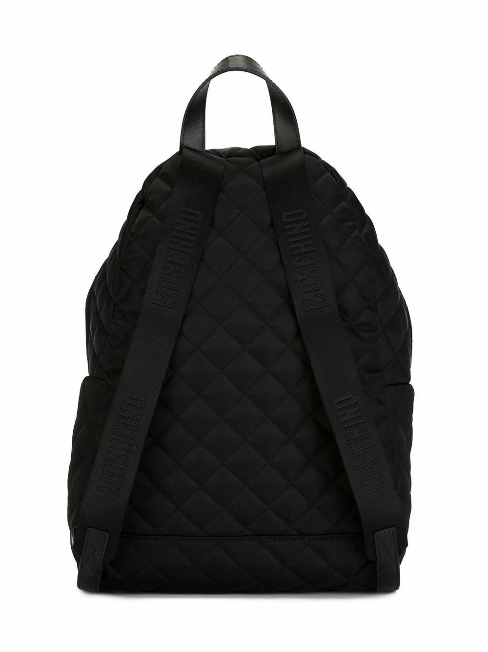 Black quilted backpack from Moschino featuring a two way zip fastening, a front logo plaque, stitching details, a front zip pocket, a top handle, adjustable shoulder straps, an internal zipped pocket and an internal logo patch.