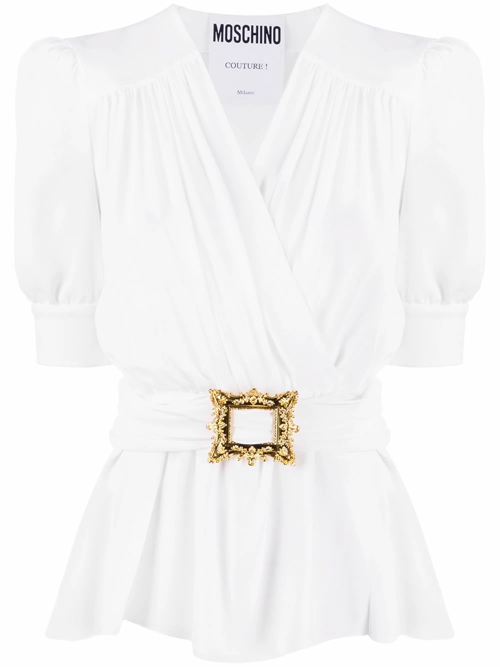 Always dress like you’re going somewhere better later. Crafted in a wrap-around style, this blouse from Moschino is detailed with a belted waist and a gold-tone buckle to the front for an extra refined touch. Who knows where you’ll end up after you leave the office next Friday…
