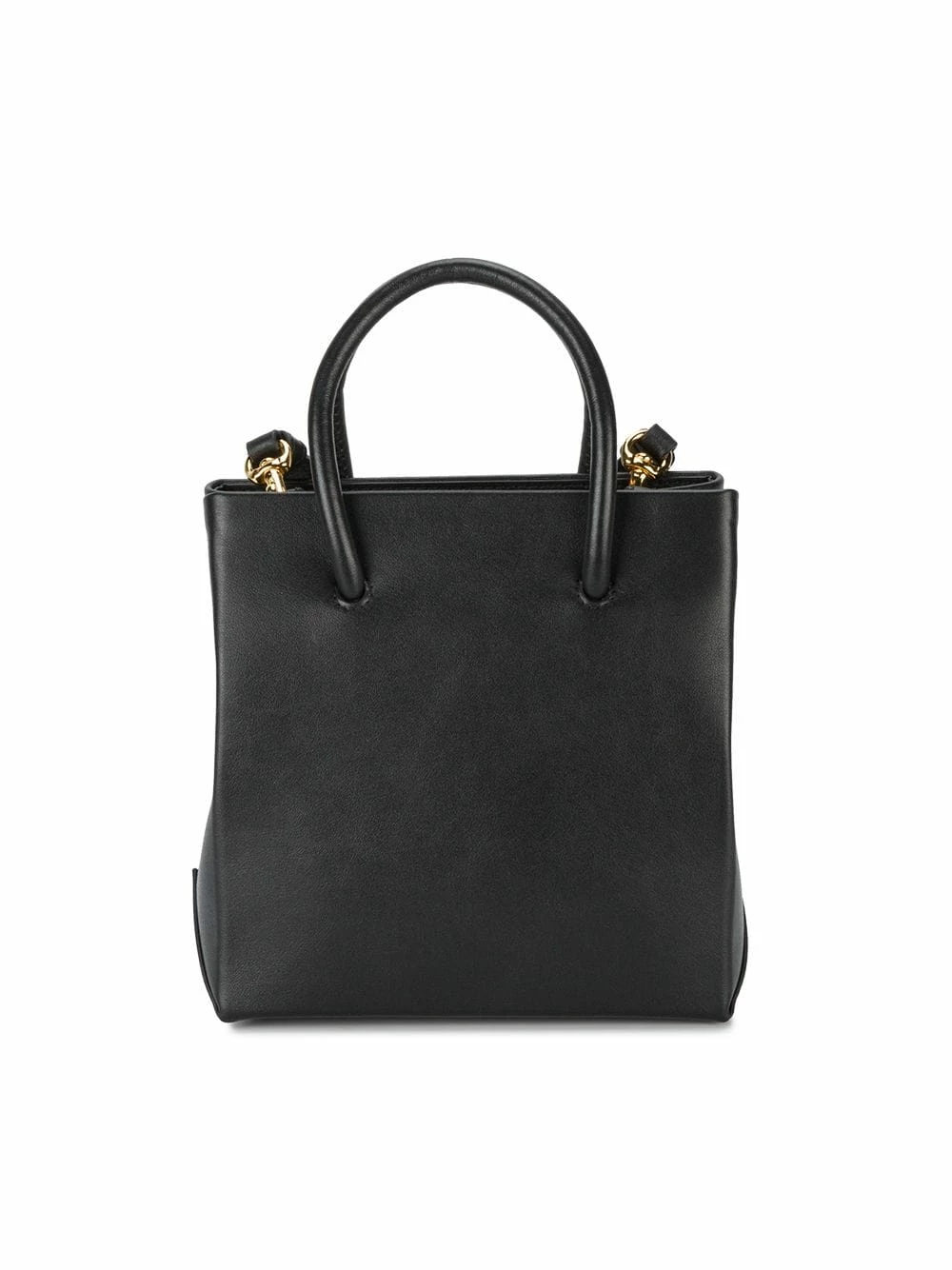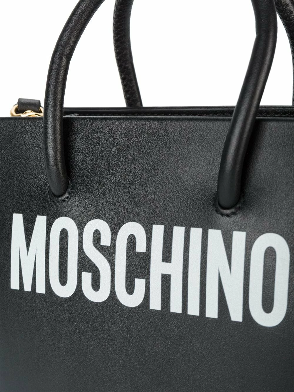 Black leather Black logo print leather tote bag from Moschino featuring top handles, a main internal compartment, a printed logo and a cross body strap.