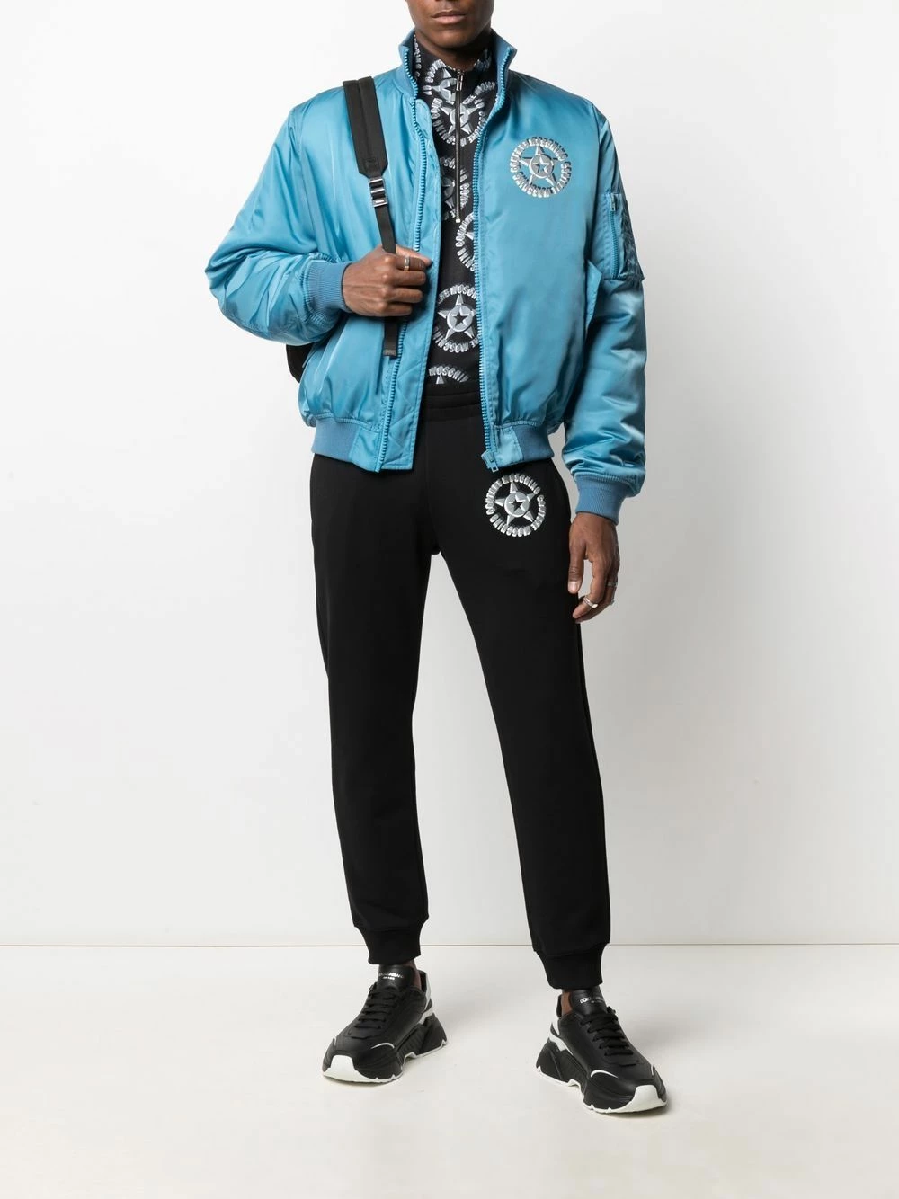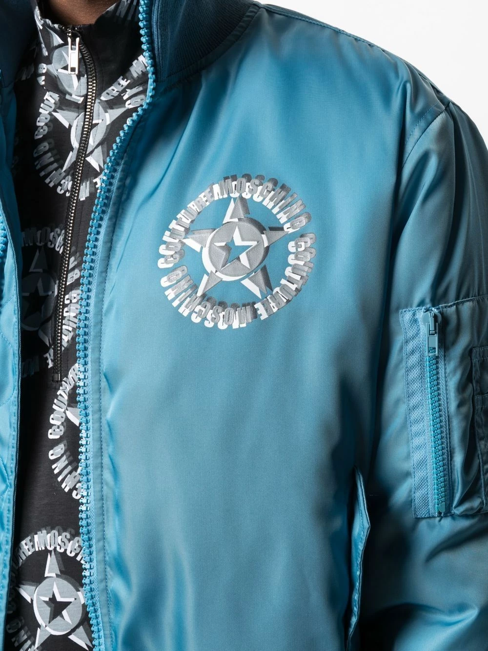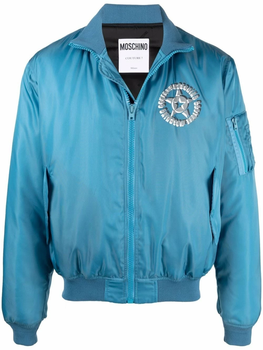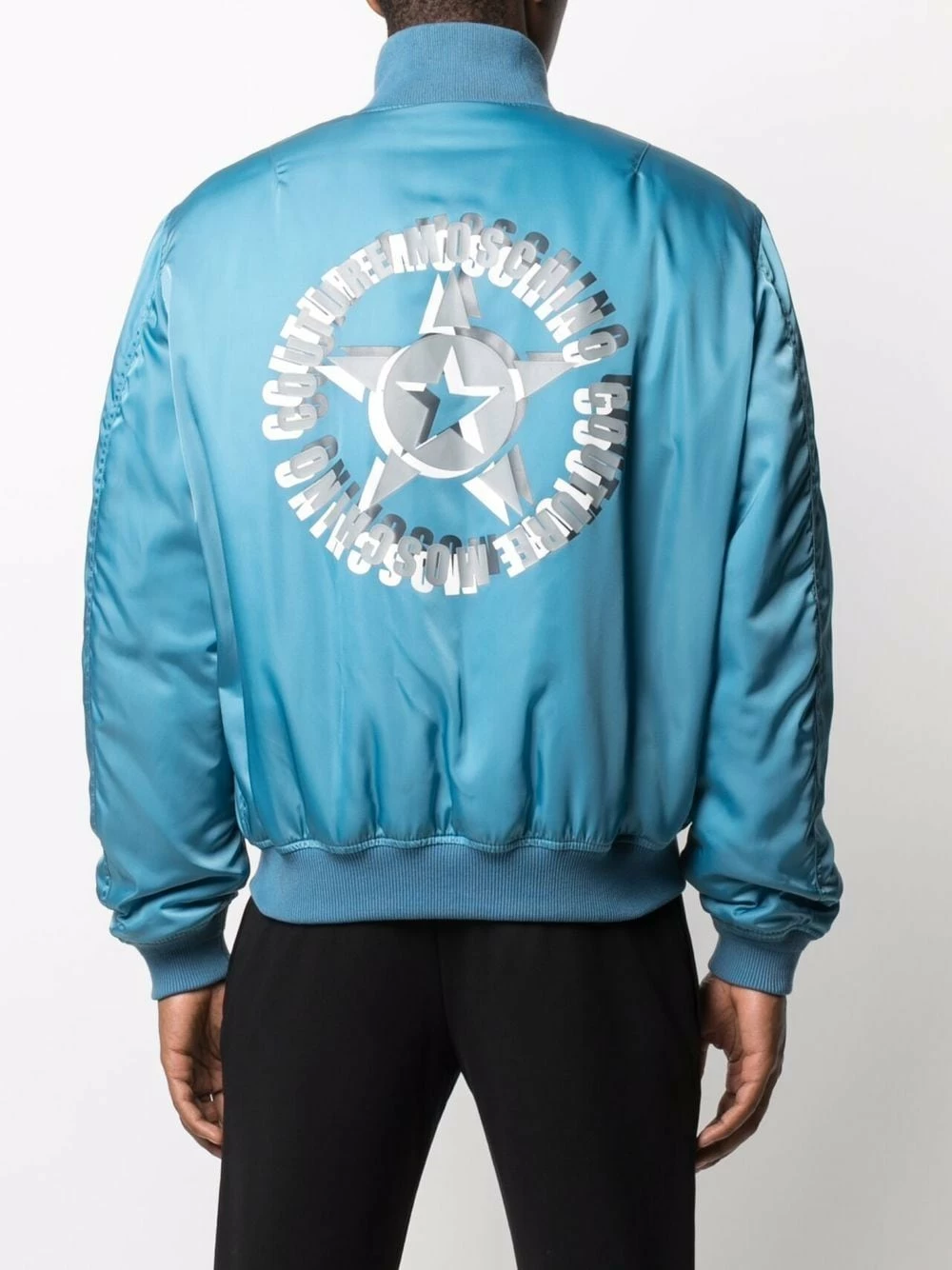 Celebrate your love for all things Moschino Couture with this logo print bomber jacket. Designed in an azure blue hue with grey and white logo highlights; it’s classic shape is punctuated with a zipped pocket to the left sleeve. Don’t leave this piece at home.