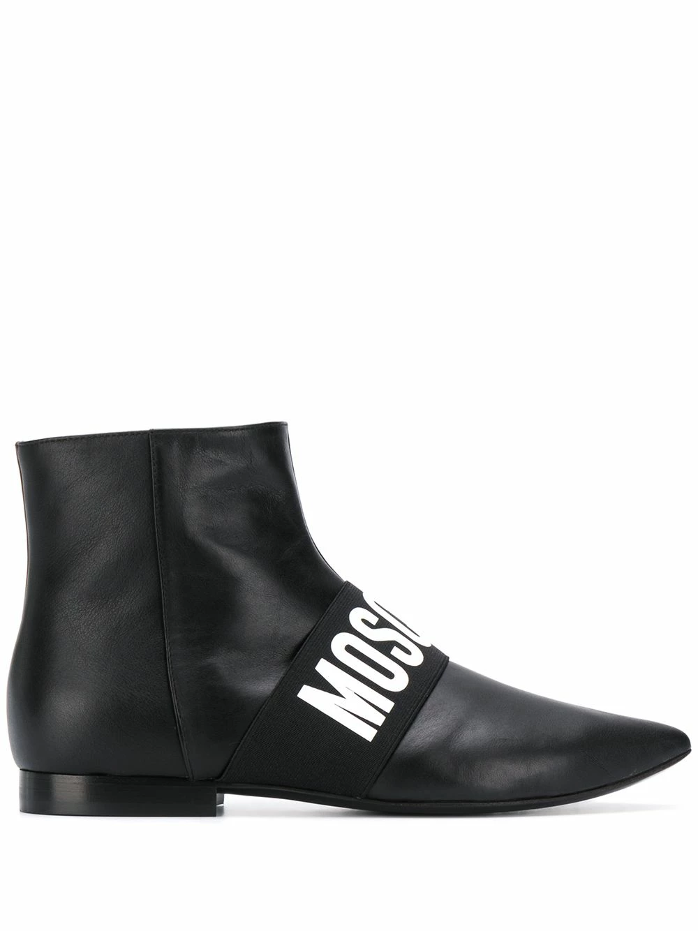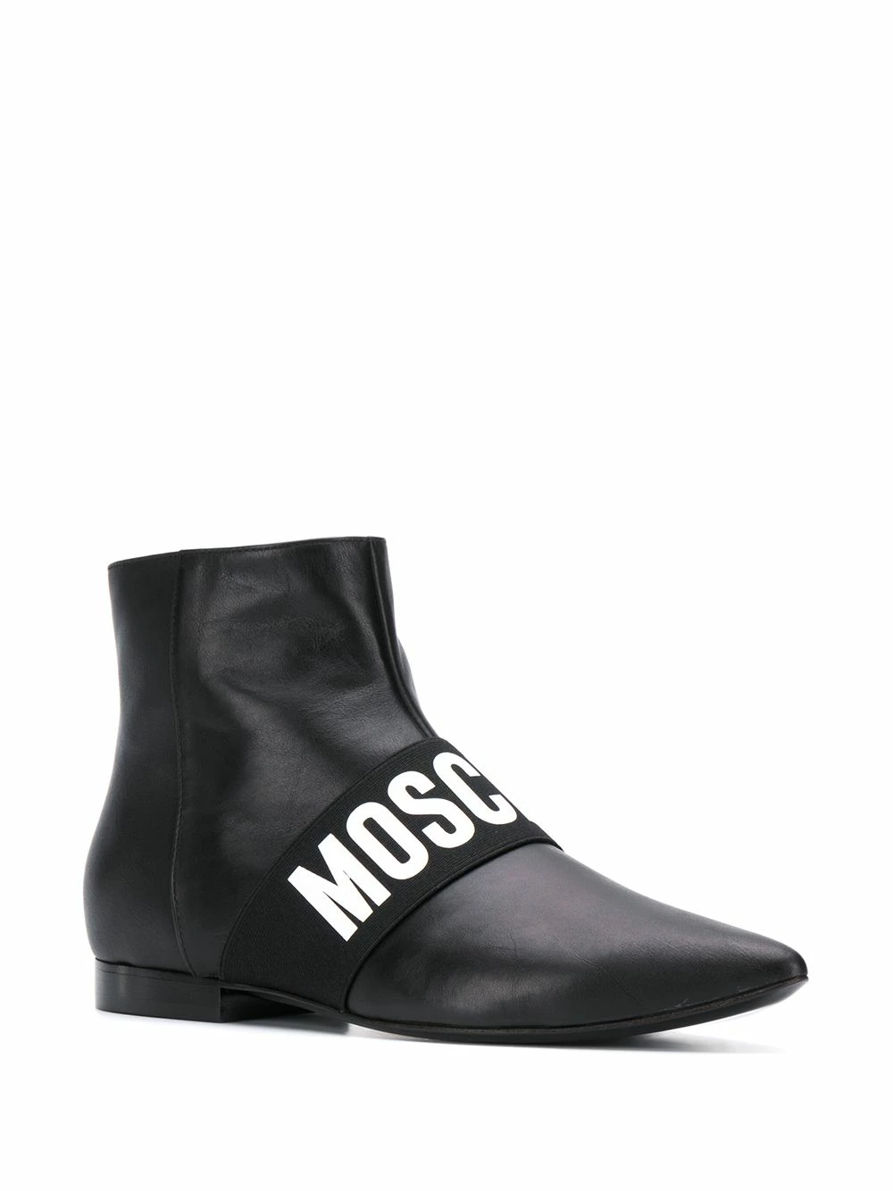 When you want to be dressed head to toe in Moschino, opt for these black calf leather and goat skin logo band ankle boots. Wear them with pride! Featuring an ankle length, a side zip fastening, a front logo patch, a pointed toe and a flat rubber sole.