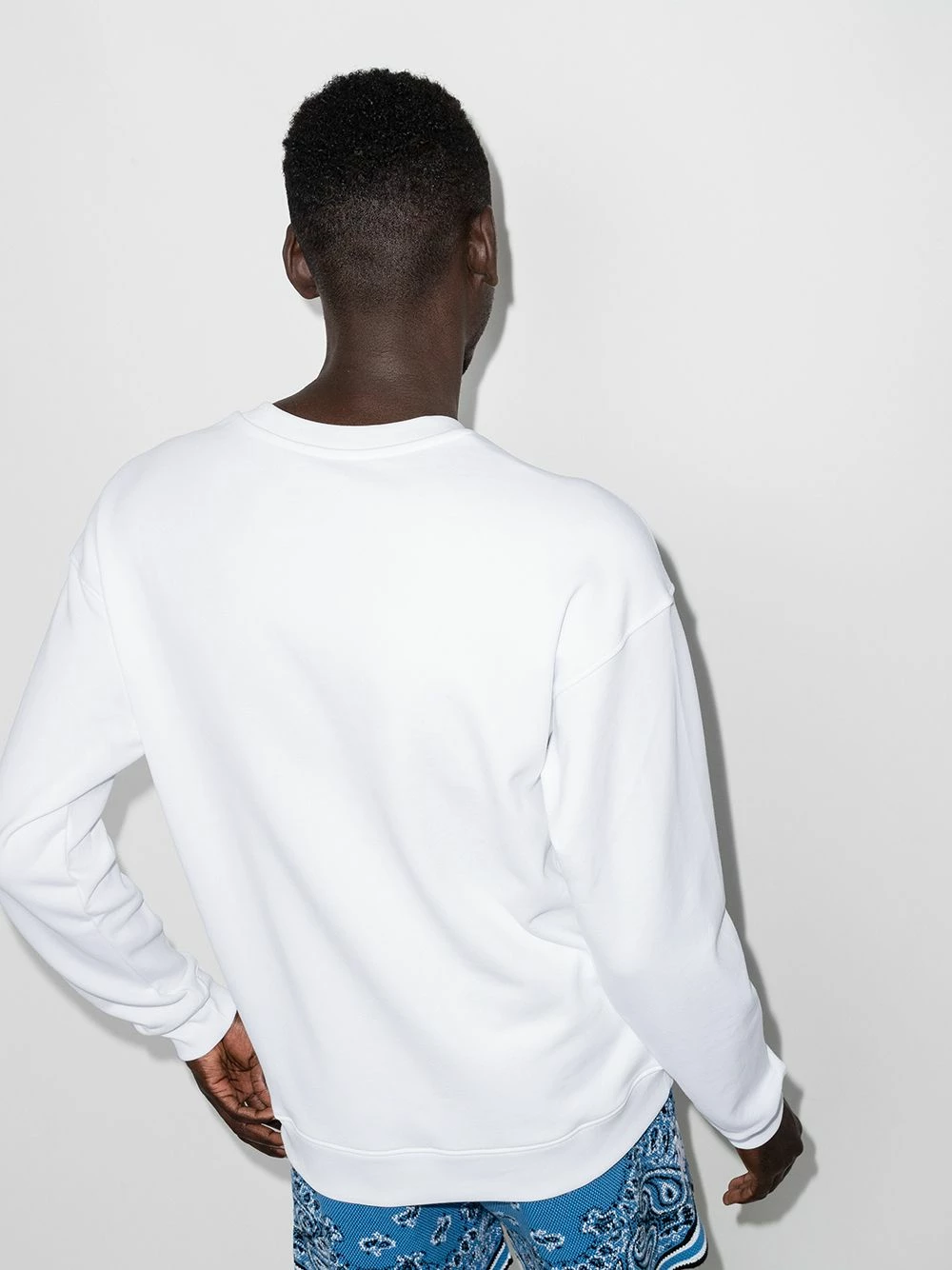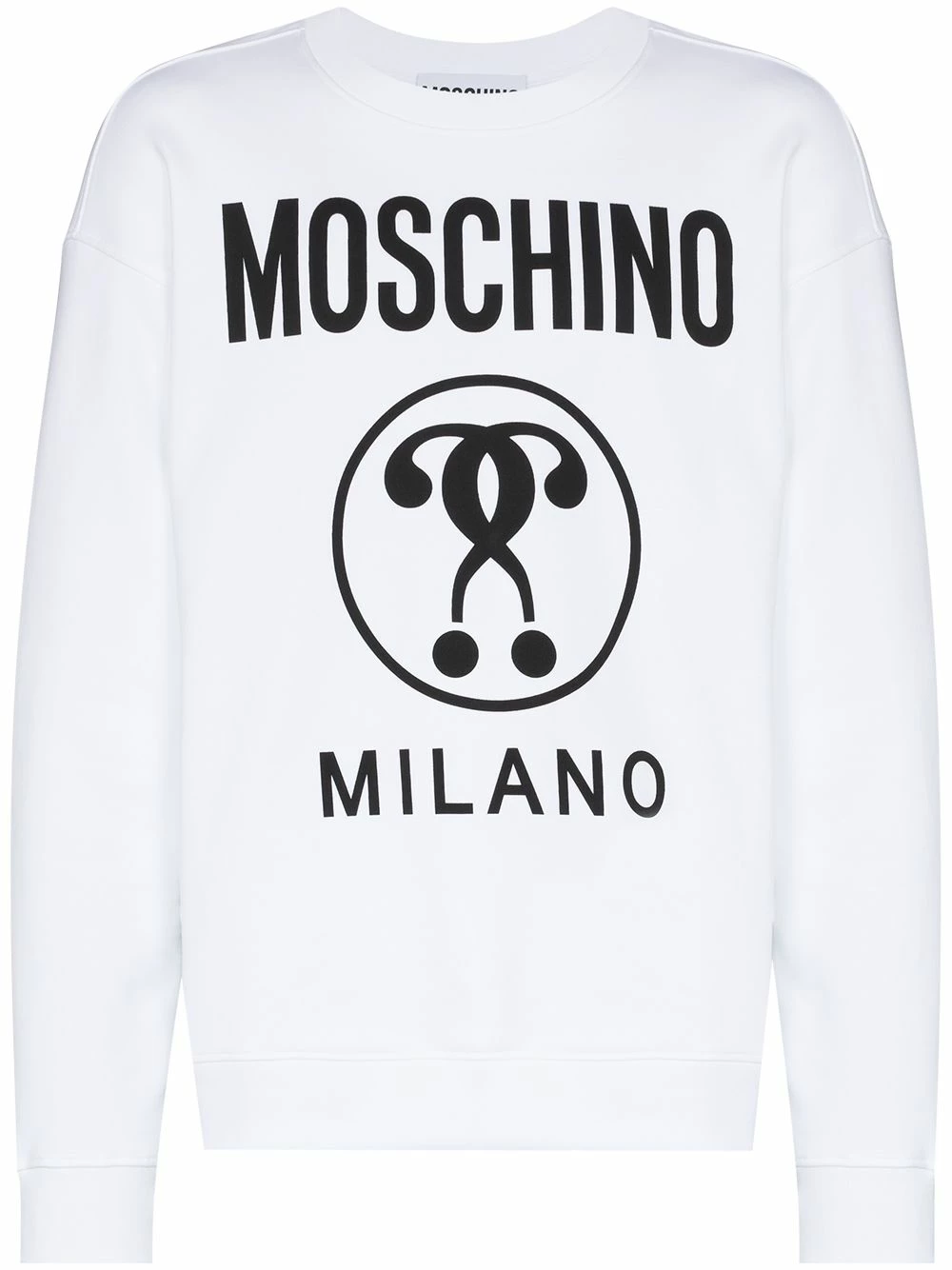 Moschino’s sweatshirt highlights the brand’s penchant for the enduring logomania trend. This crew-neck style is accented with the brand’s signature in contrasting black letters as well as the Double Question Mark motif at the chest.