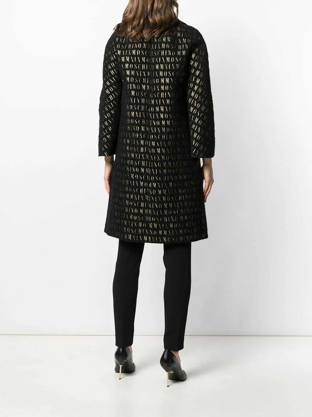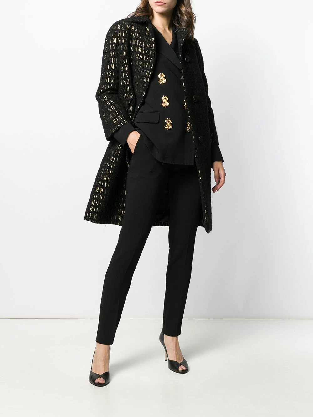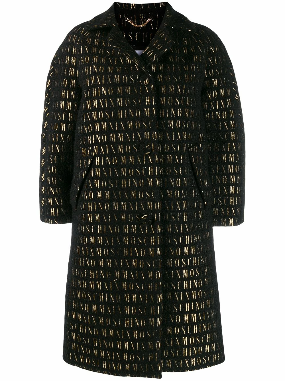 The carefree Moschino mode is defined by classic Italian leather craft imbibed with a sense of pop culture extravagance and humour, as shown by this black and gold-tone wool blend roman embroidered button-up coat. Featuring a front button fastening, a notched collar, dropped shoulders, metallic threading, two front pockets, an oversized fit and an all-over signature roman pattern.