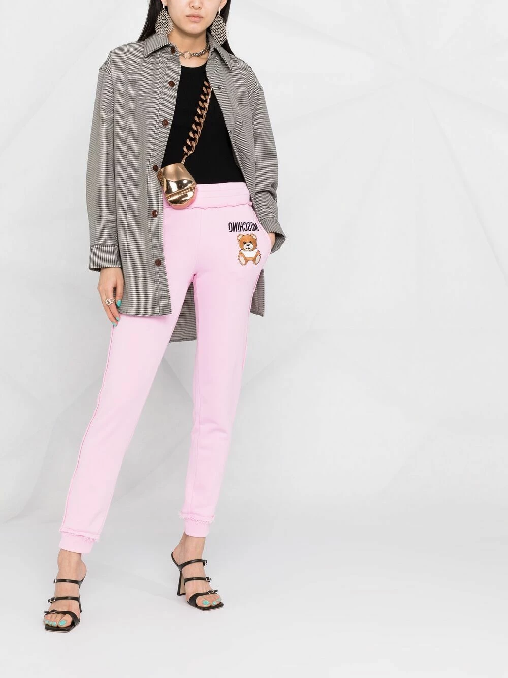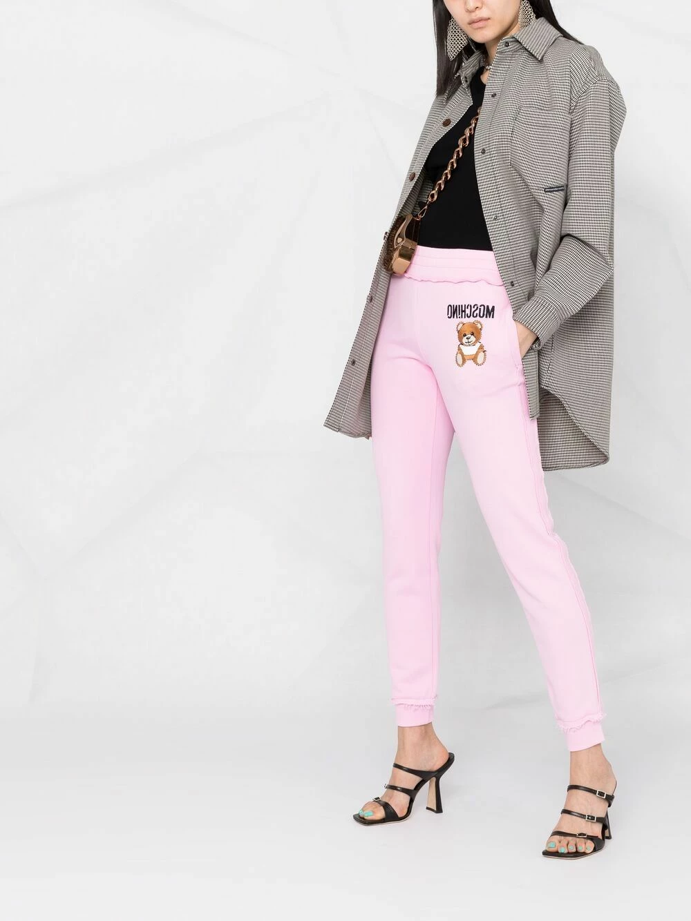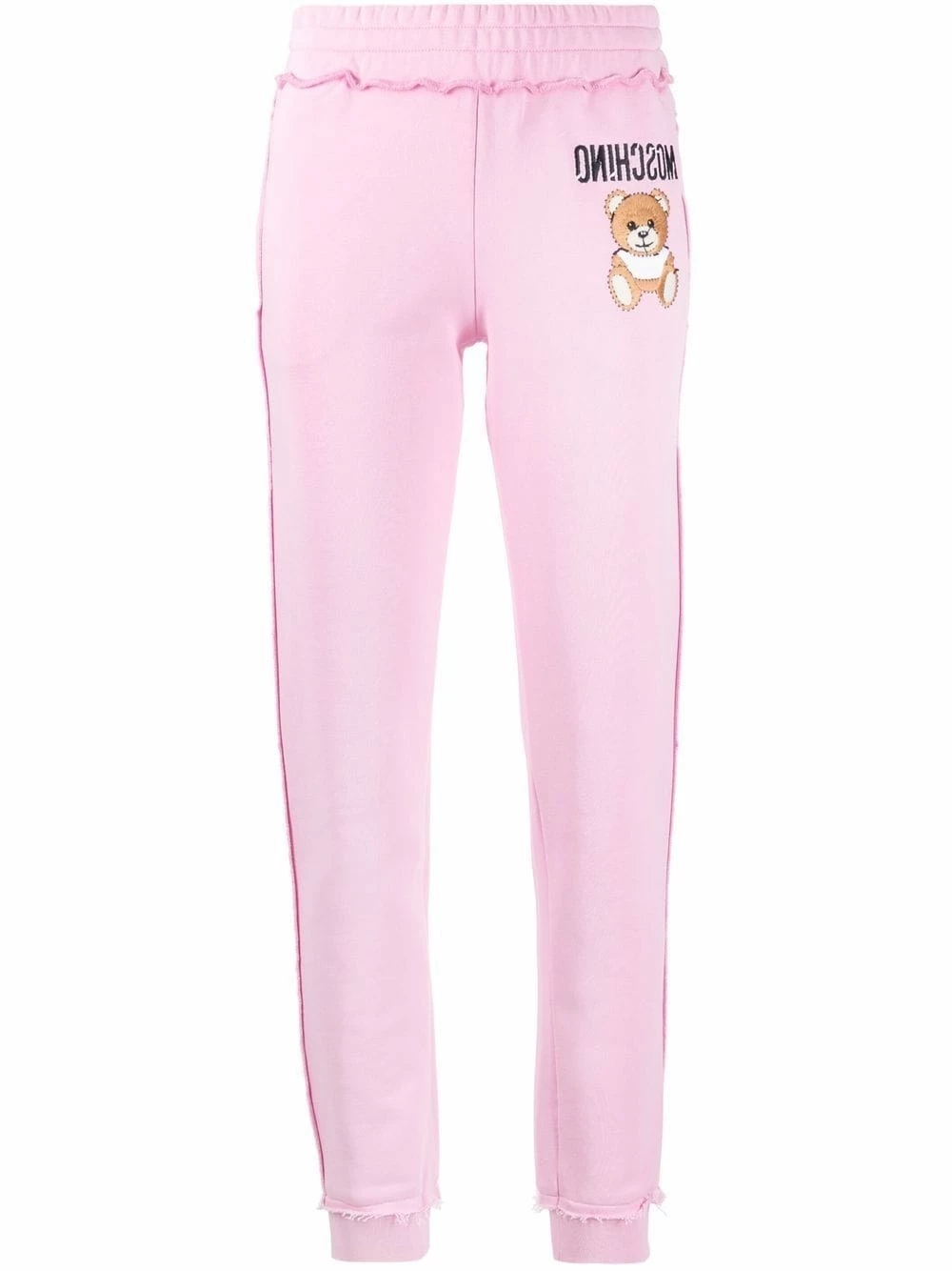 Comfortable and stylish? You got it. Simply throw on these light pink cotton Teddy Bear motif track pants from Moschino and that’s done. Talk about easy options.